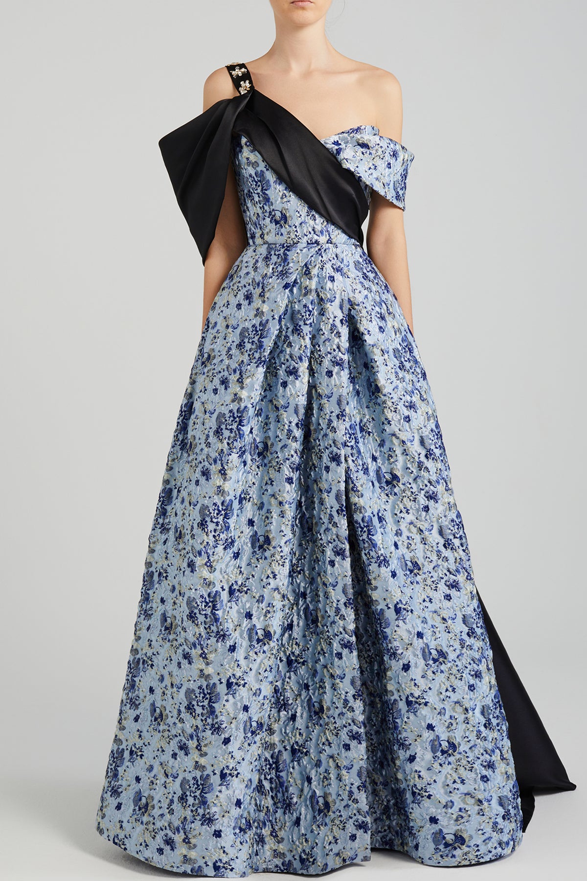 Multicolor princess one-shoulder asymmetrical dress. Featuring a royal sash with a crafted from floral brocade the piece starts with a crystal-beaded strap in contrasting black taffeta. Complemented with a skirt with an overlapping front for that extra volume.