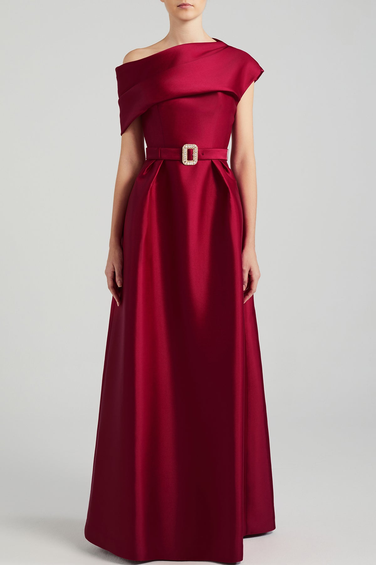 Red satin A-line dress. Featuring an asymmetrical draped bodice that shows off one’s collarbone and a pleated skirt that comes with side pockets. Complemented with a matching belt with a crystal buckle at the waist.