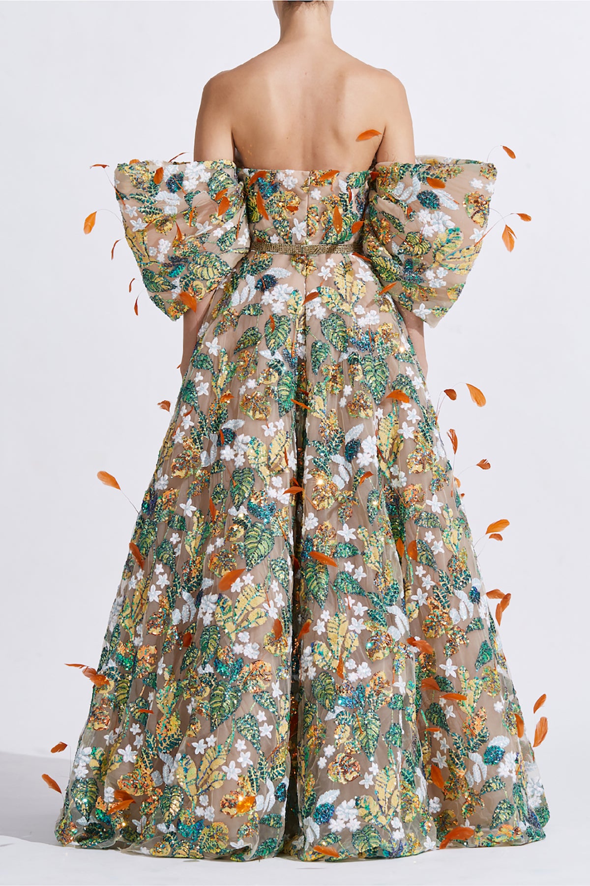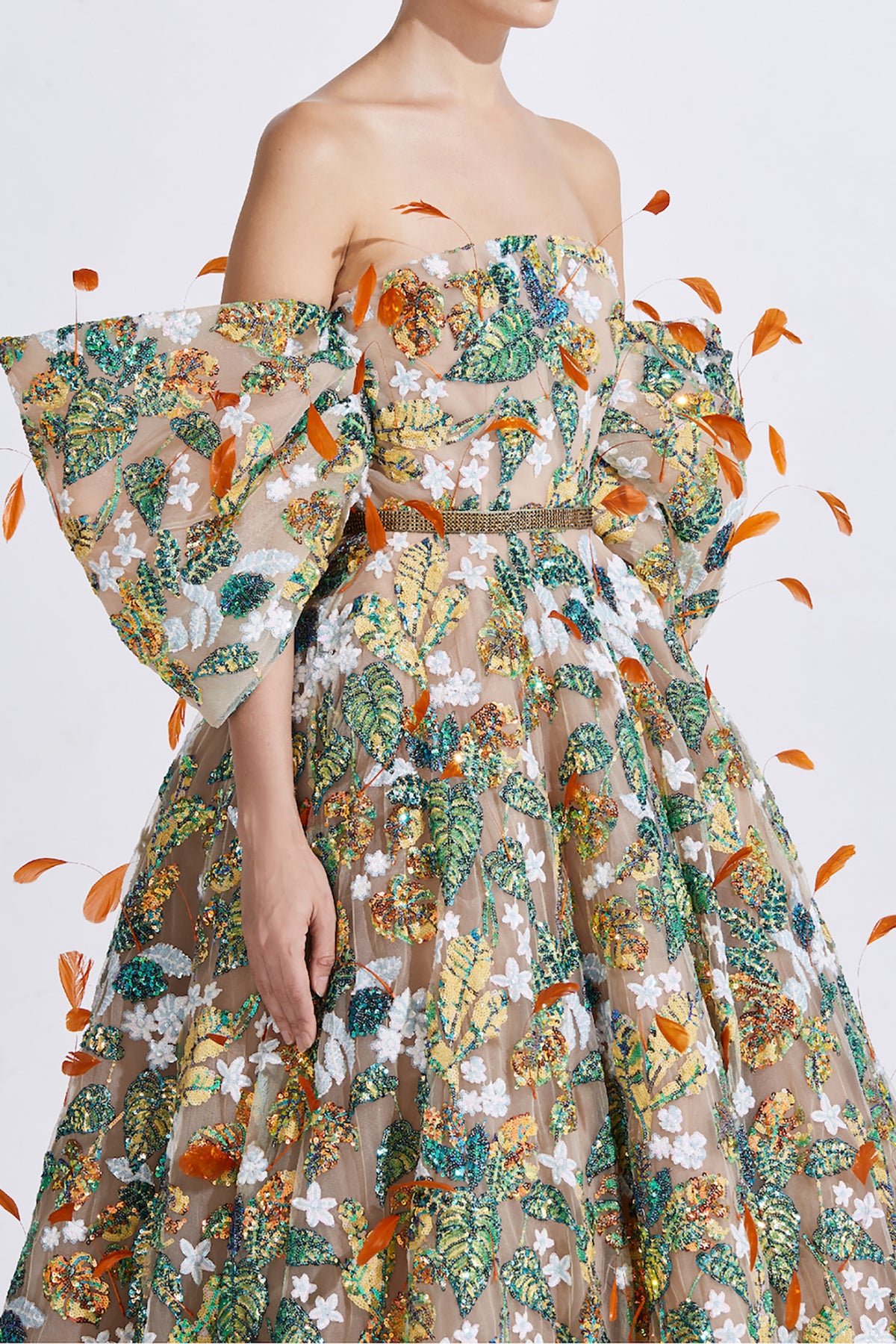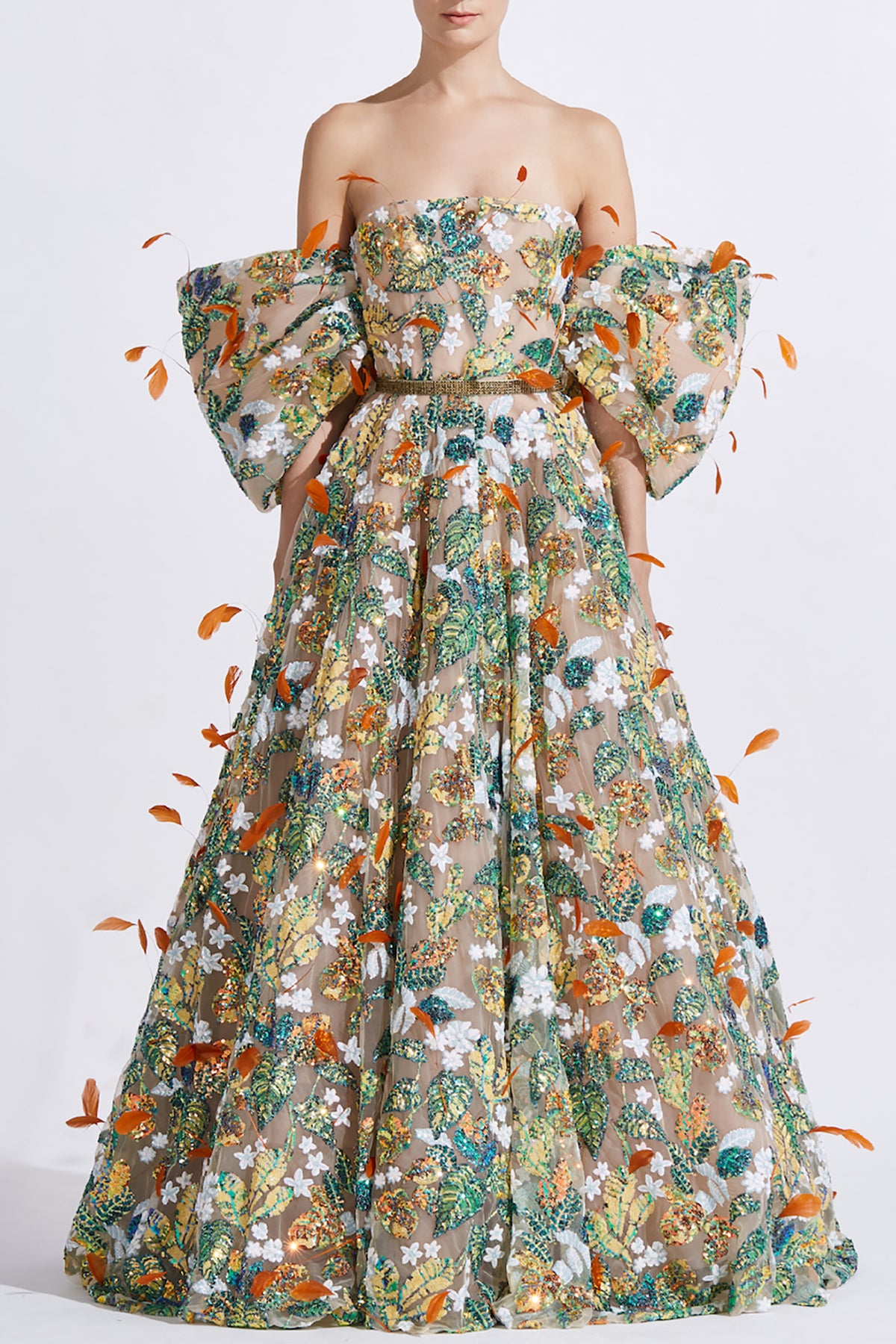 Multicolor strapless A-line dress. Featuring a fitted bodice and wispy off-the-shoulder sleeves in multiple layers of delicate tulle. Complemented with a highlighted all-over sequin embroidery and fluttering orange feathers.