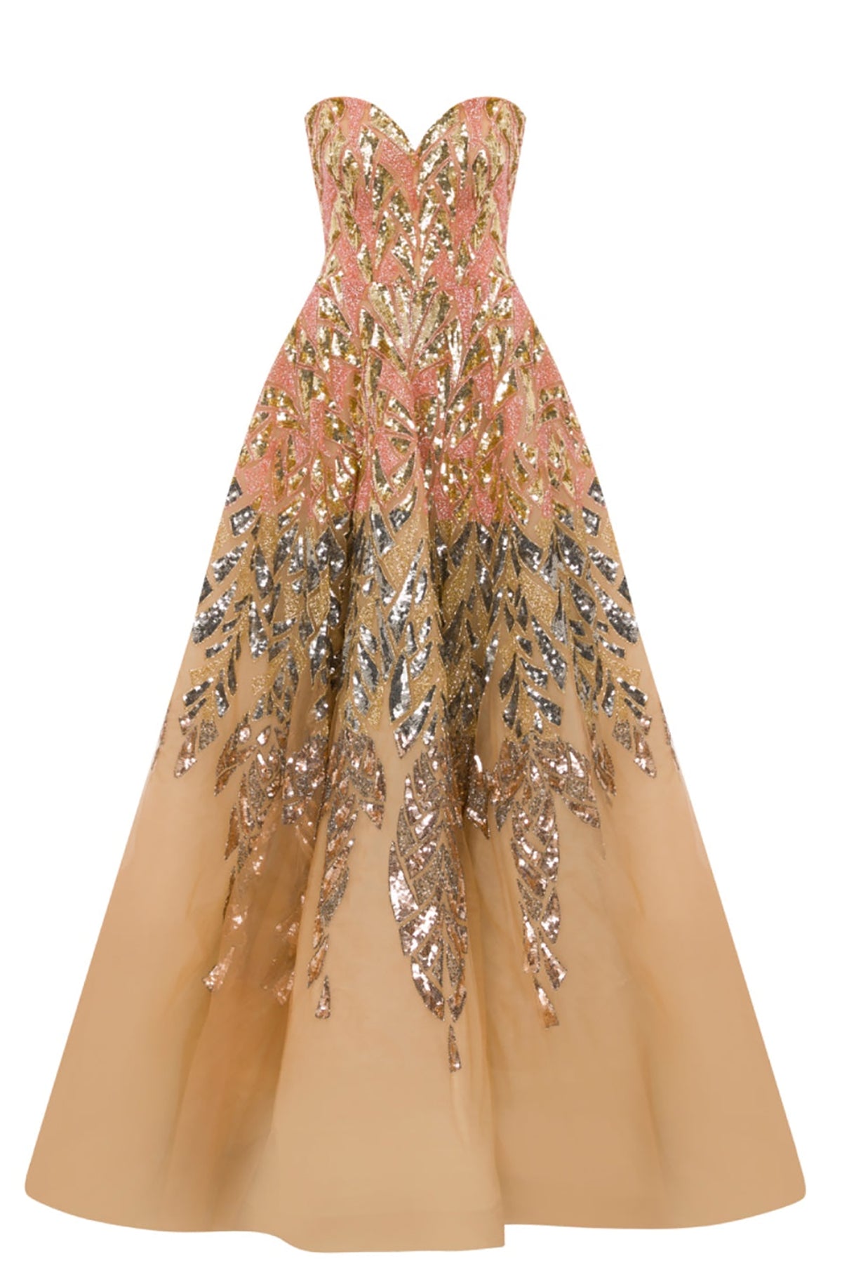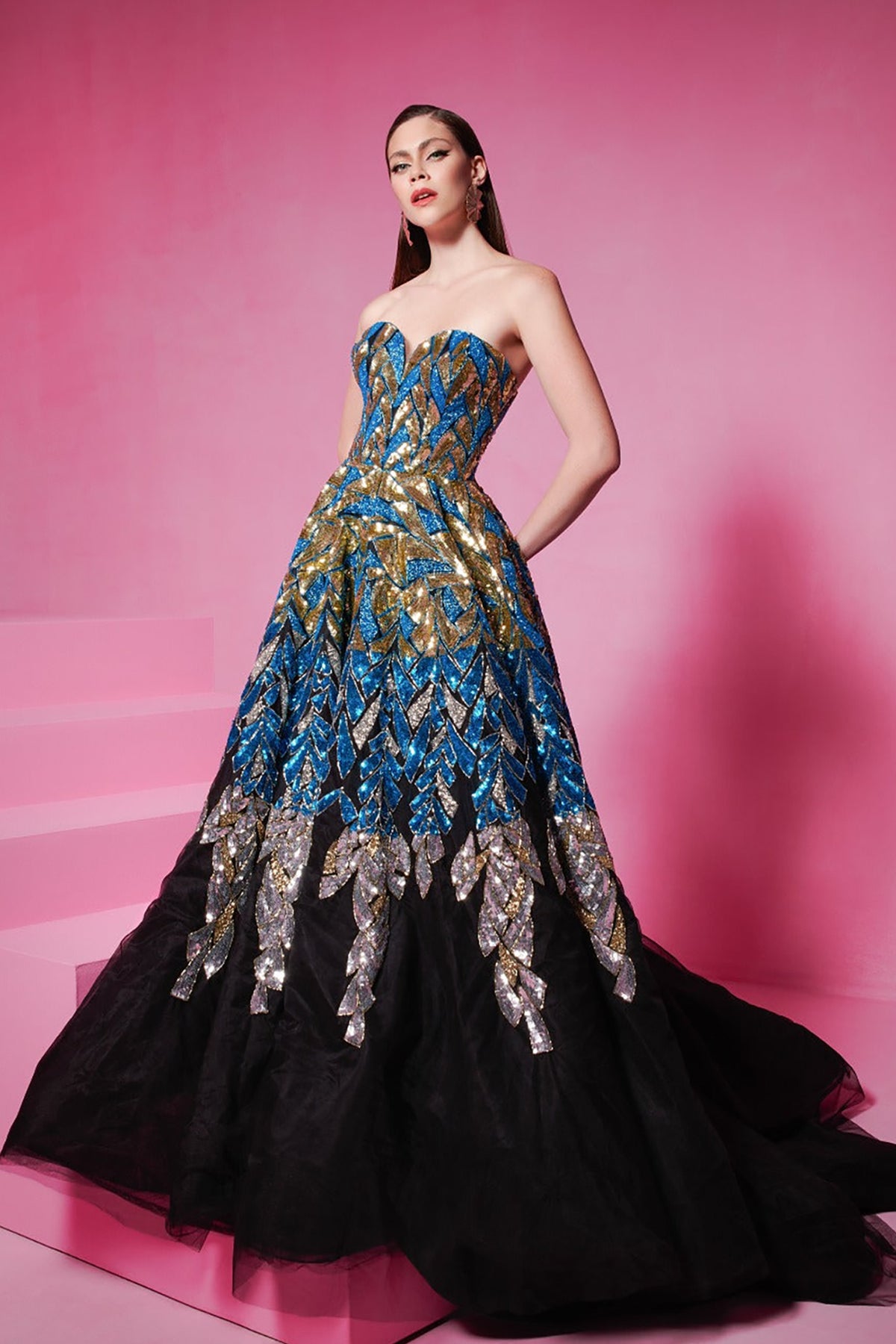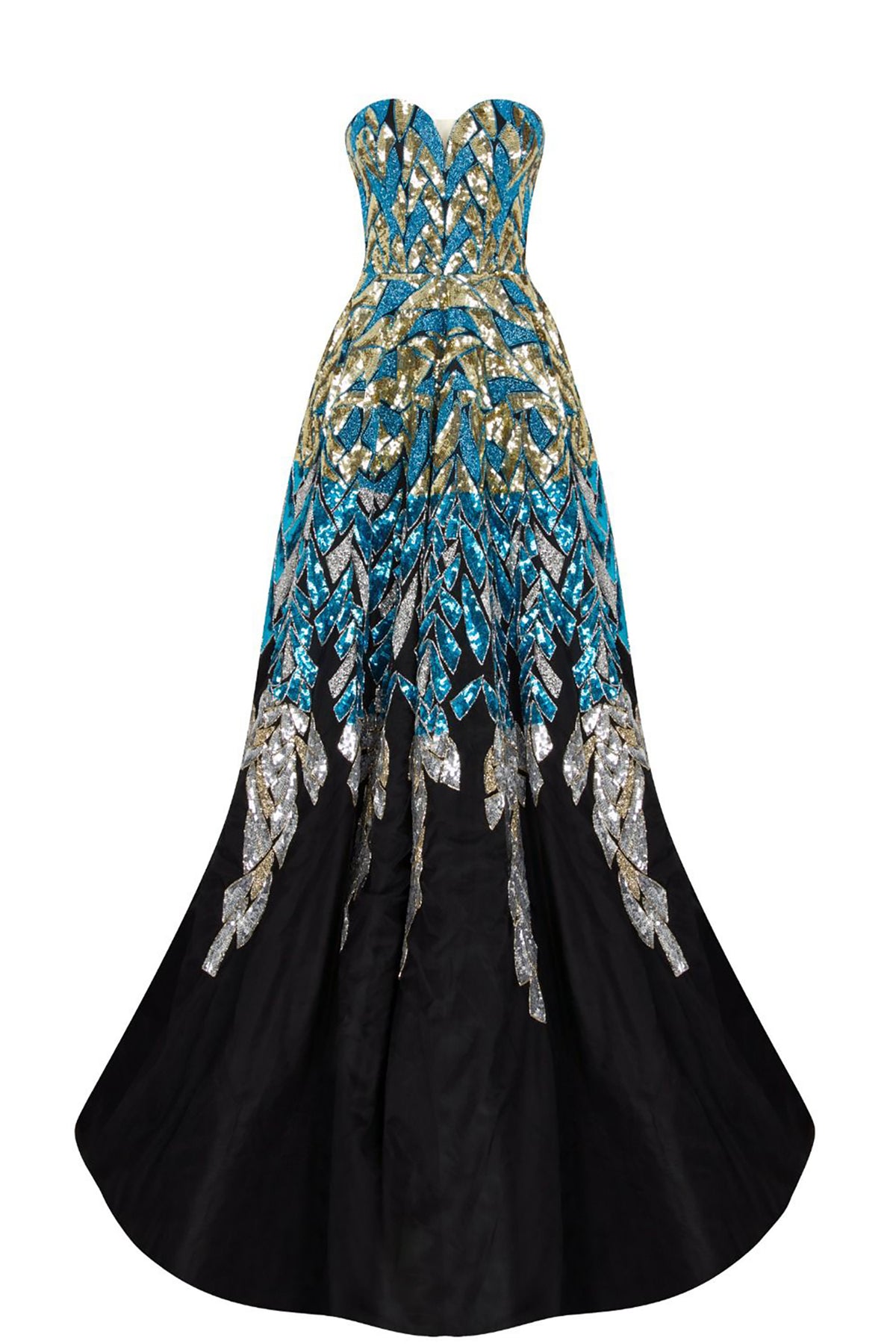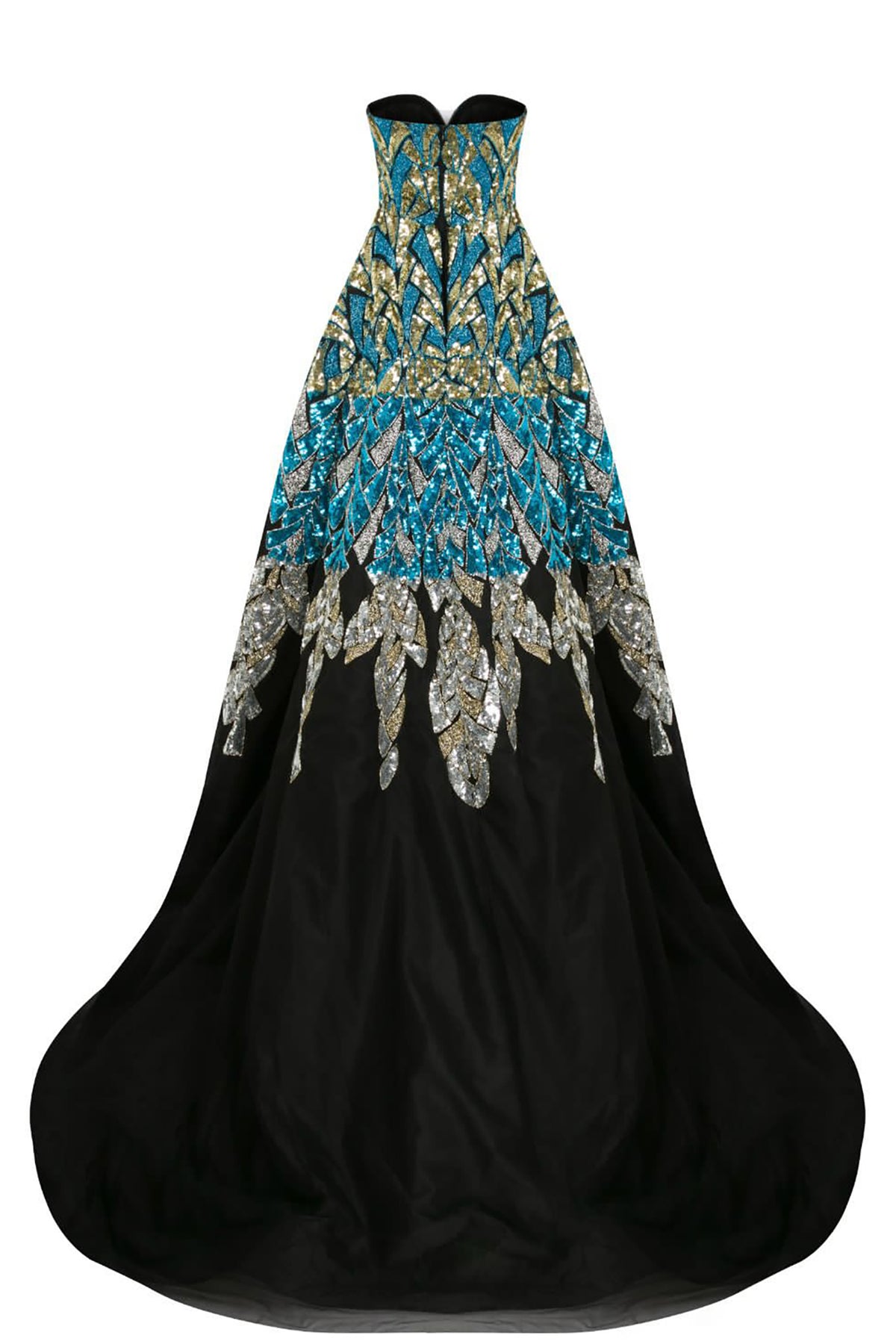 Blue and gold A-line long dress. Featuring a strapless sweetheart neckline, the bodice is intricately beaded with a rich combination of gold and blue embellishments. Complemented with a corseted silhouette smooths the torso.