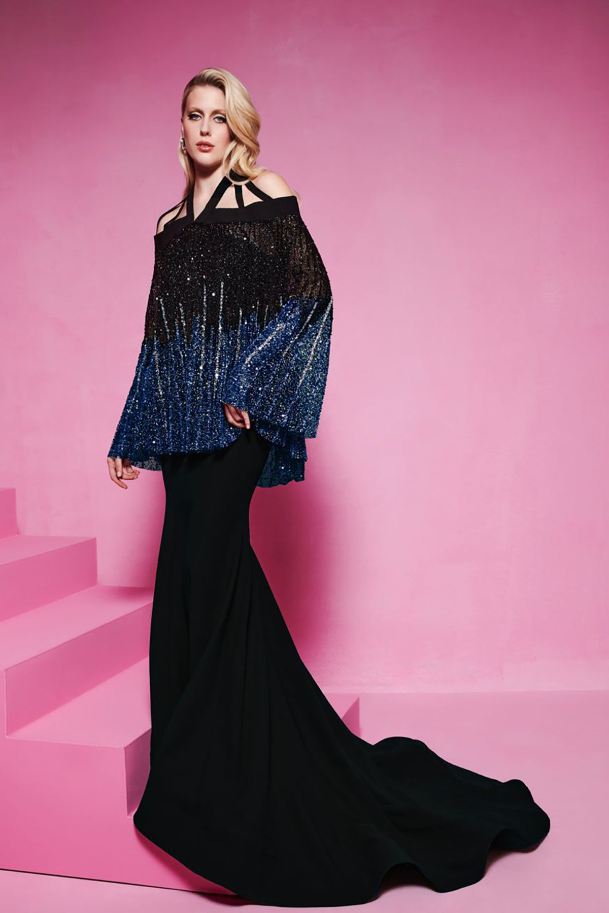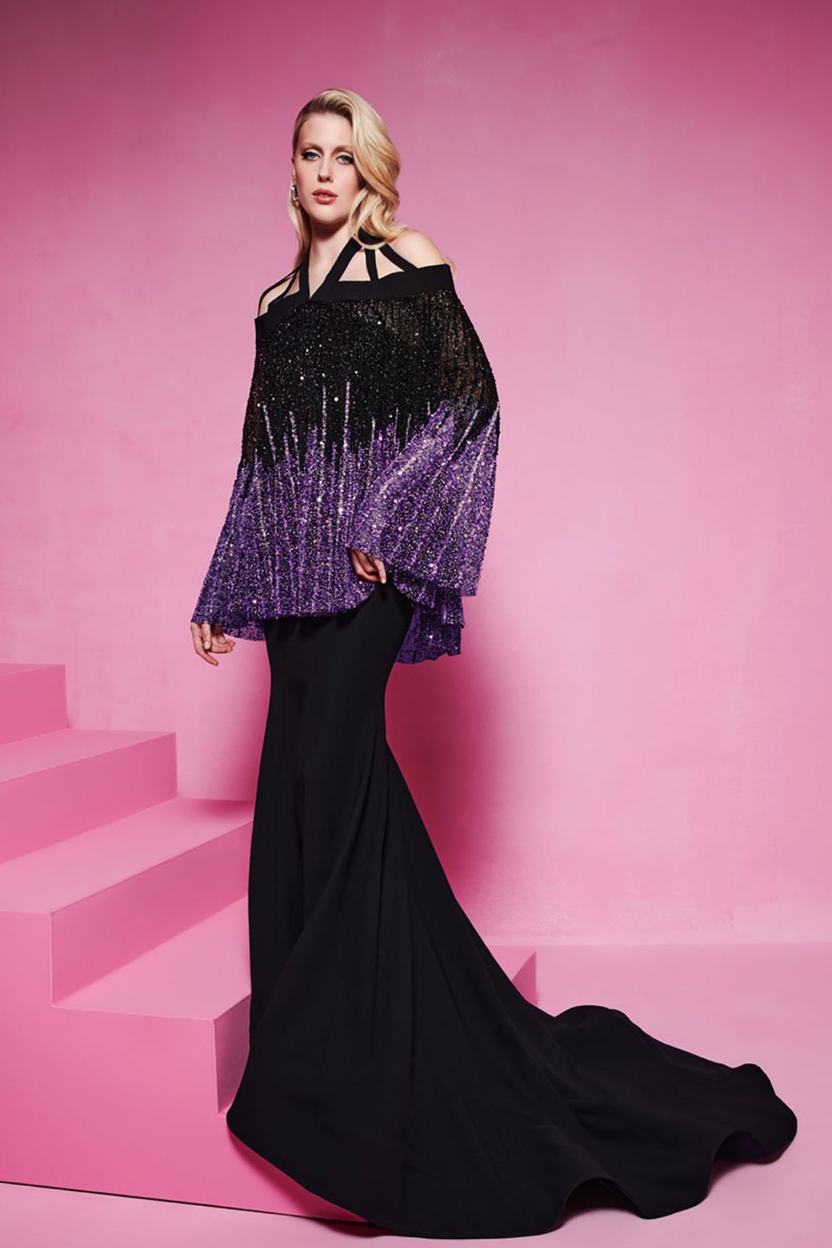 Black and orange hand-beaded tulle dress. Featuring a strapless upper neckline cut with an A-line flared lower and two off-the-shoulder short sleeves. Complemented with a draped embellishments across the bust.