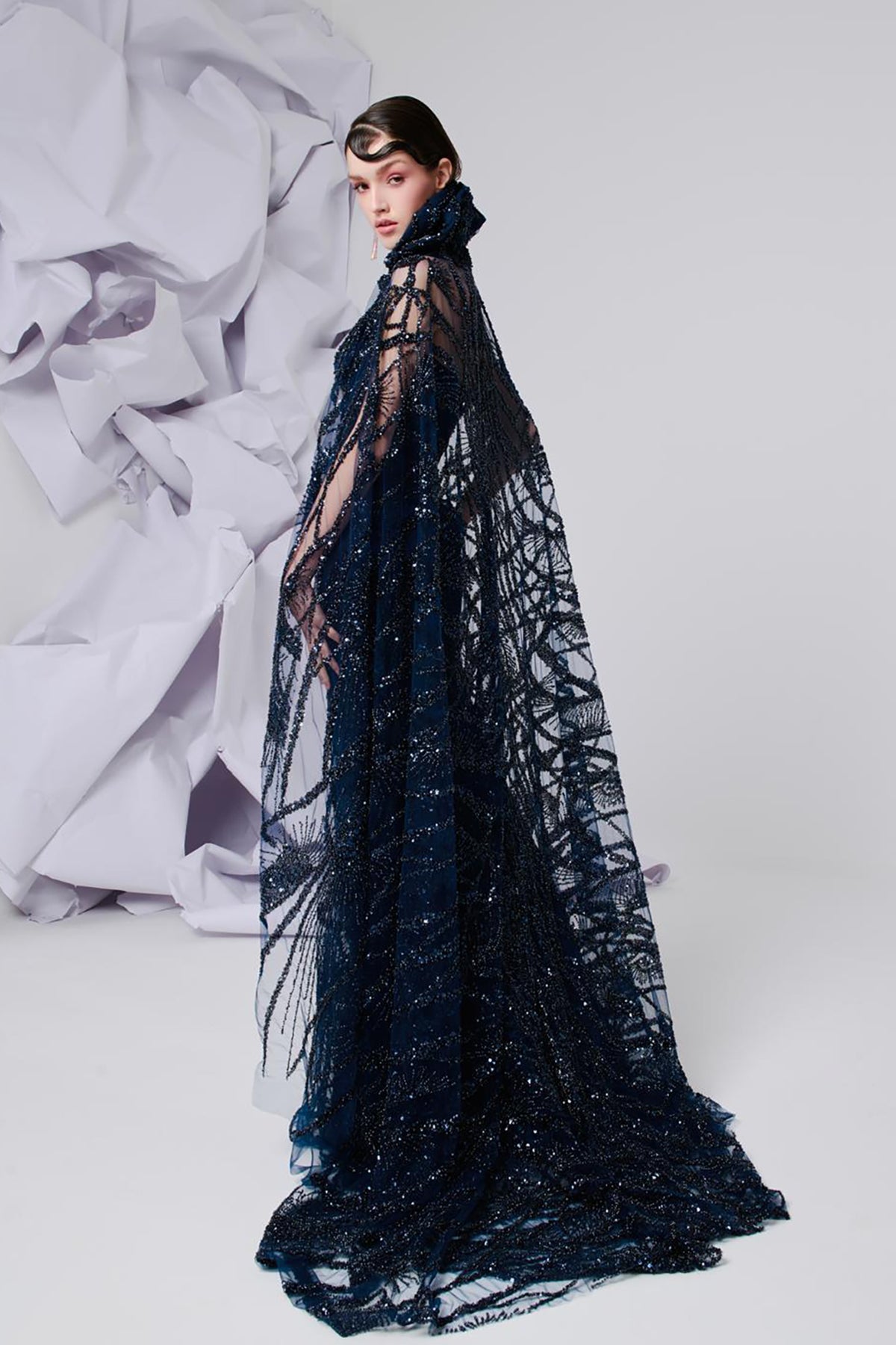 Navy blue satin long dress. Featuring a strapless neckline that crowns the décolletage and elegantly frames the collarbone. Complemented with a floral embroidery that may incorporate metallic threads.