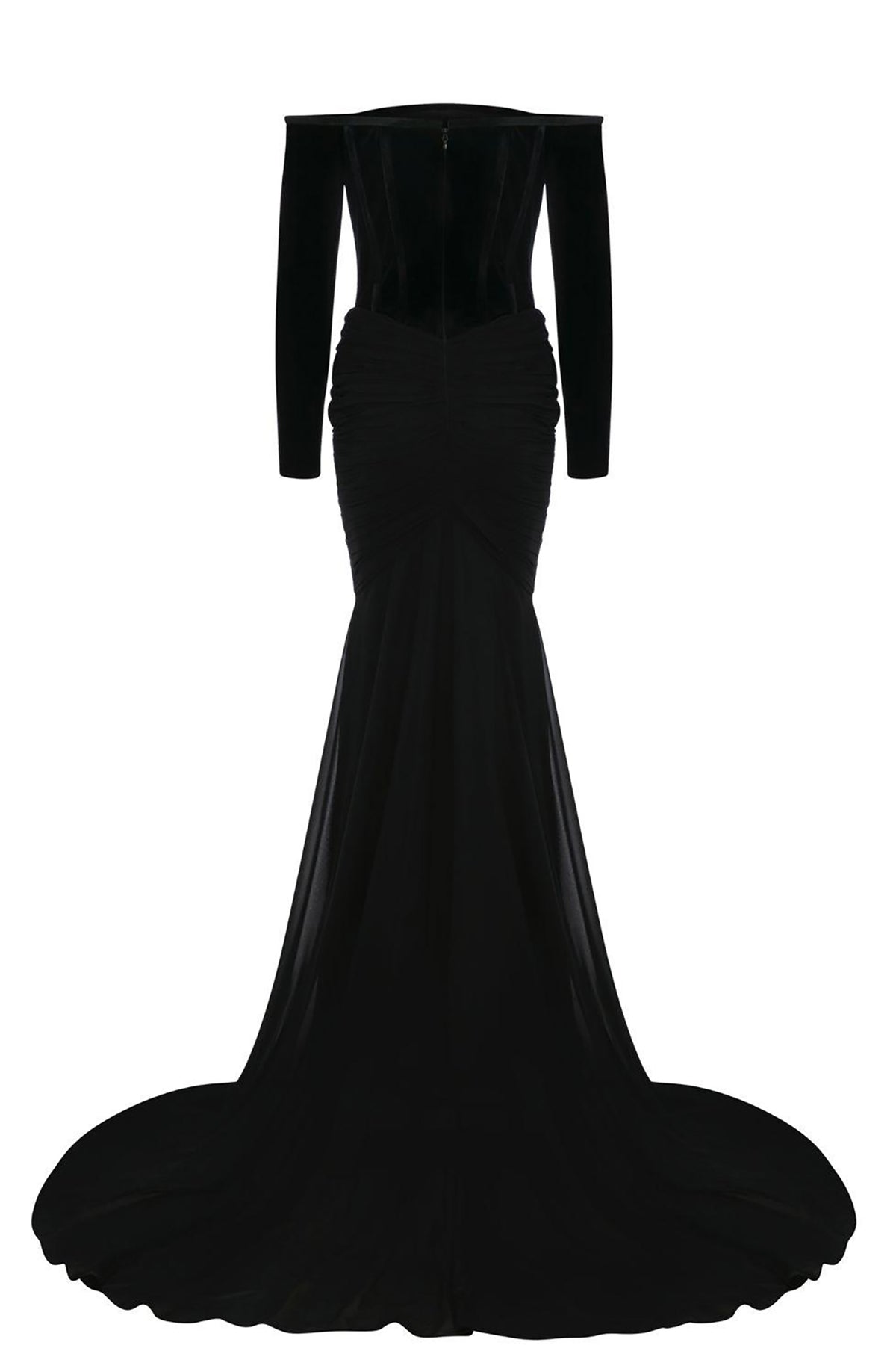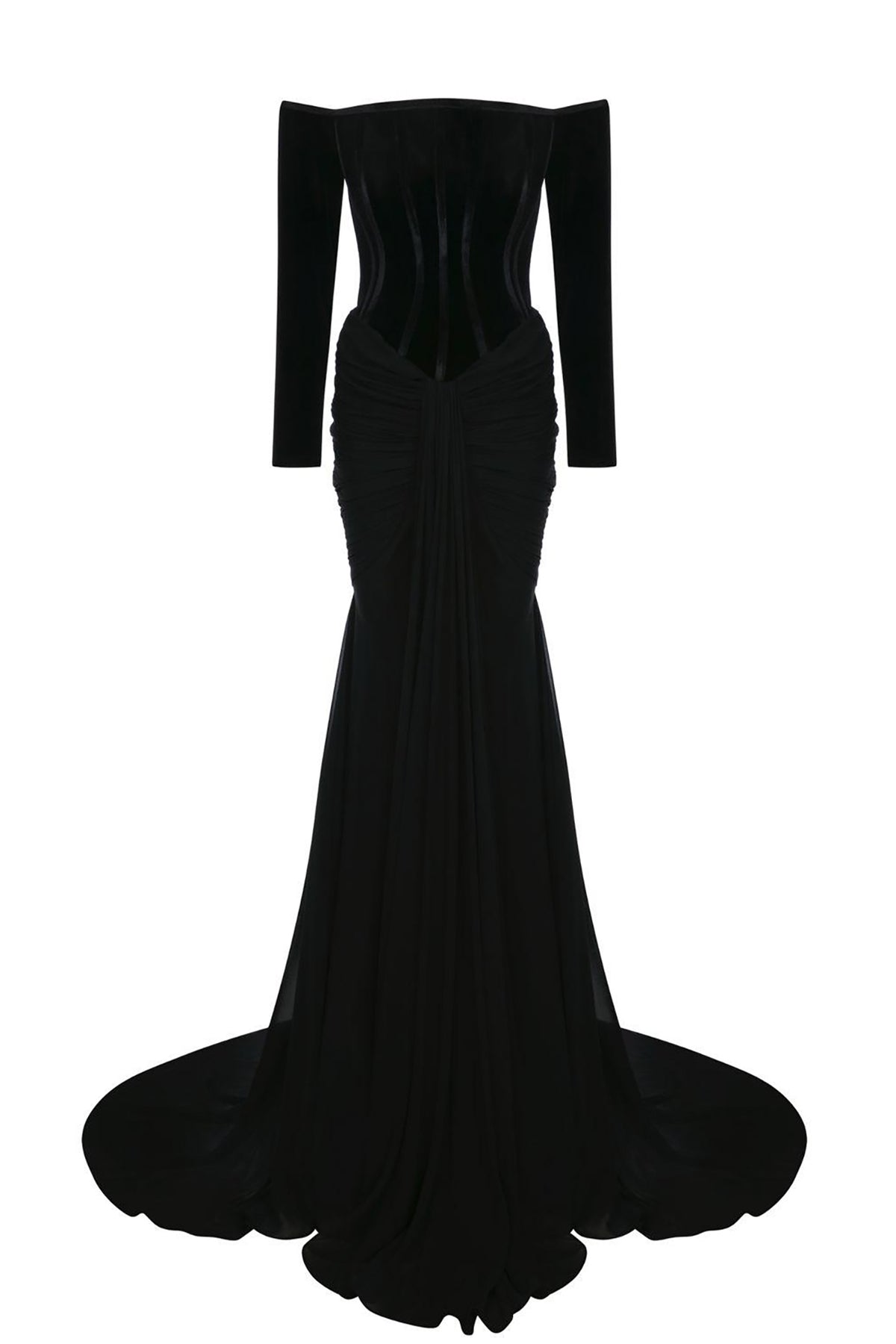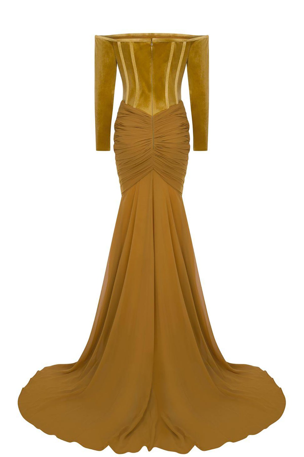 Mustard long dress. Featuring a form-fitting sculpting of the torso with vertical princess seams that create a confident. Complemented with a squared neckline that sits close to the collarbone, providing a clean, architectural frame for the décolletage.