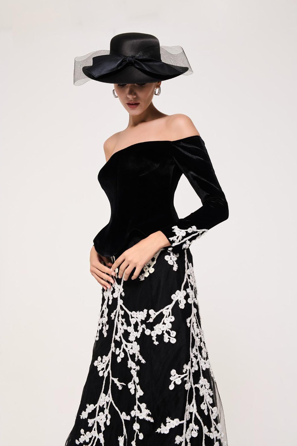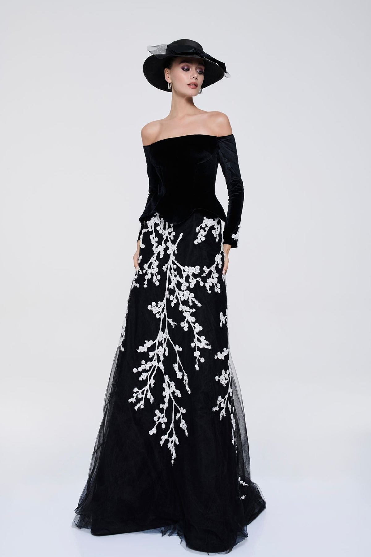 Black velvet and tulle long dress. Featuring an off-the-shoulder neckline that gracefully frames the collarbone and shoulders. Complemented with a floral pattern that starts at the bodice and fans outward along the skirt, and an A-line silhouette.