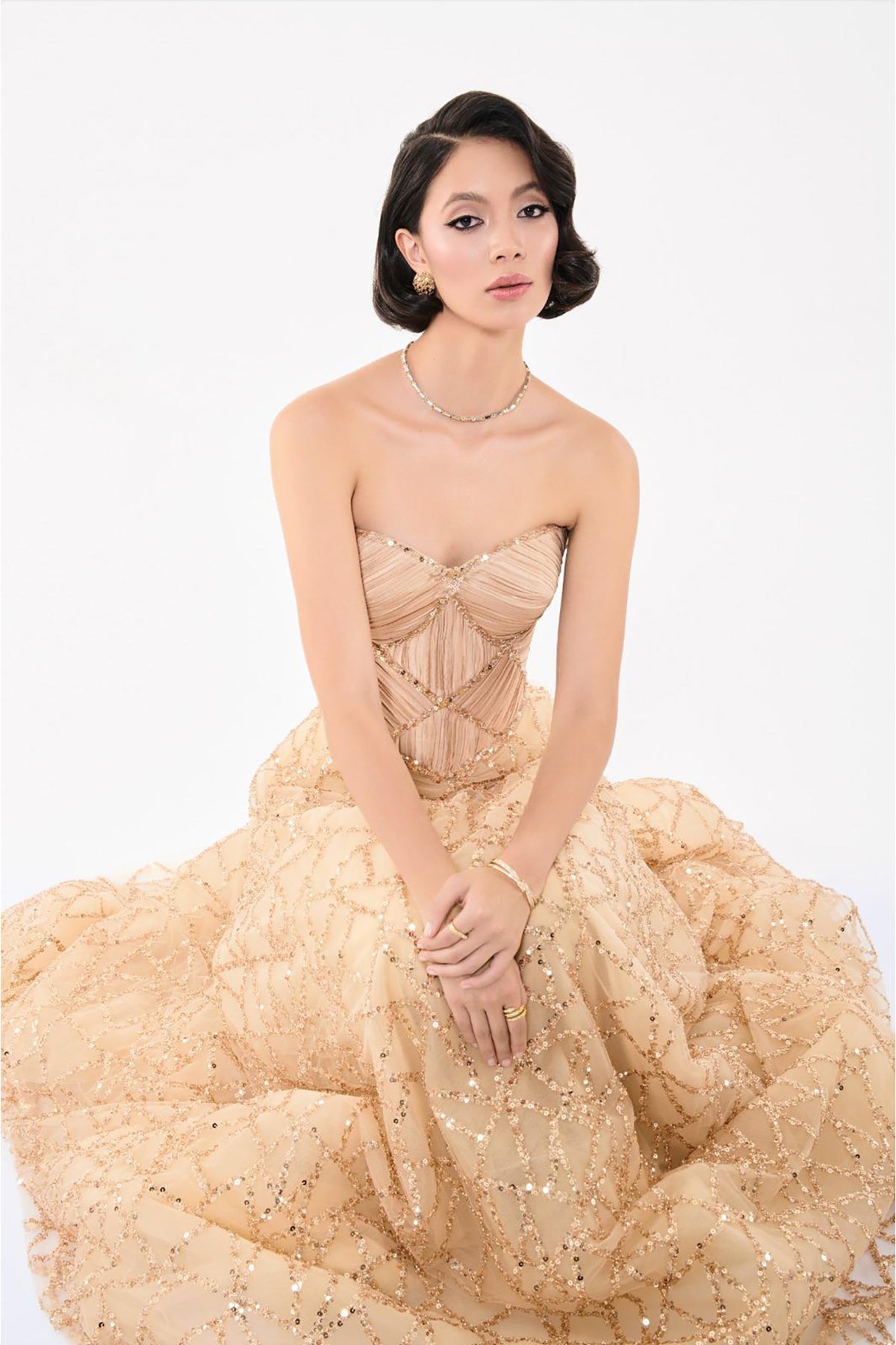 Beige A-line semi-sheer long dress. Featuring a strapless sweetheart-inspired neckline that sits gently along the décolletage. Complemented with a bodice that is fitted and structured, sculpting the torso to emphasize a classic hourglass silhouette.