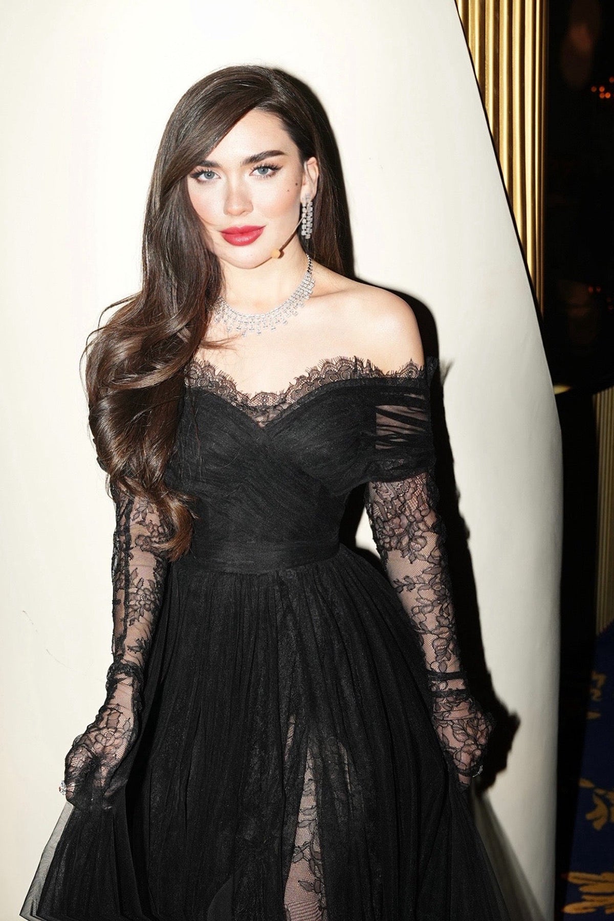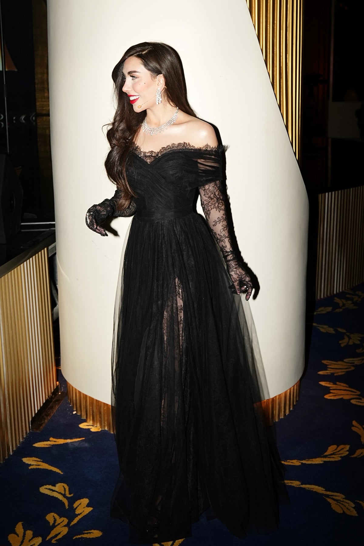 Black a-line long dress. Featuring an off-the-shoulder neckline with sculptural lines and delicate illusion detailing.