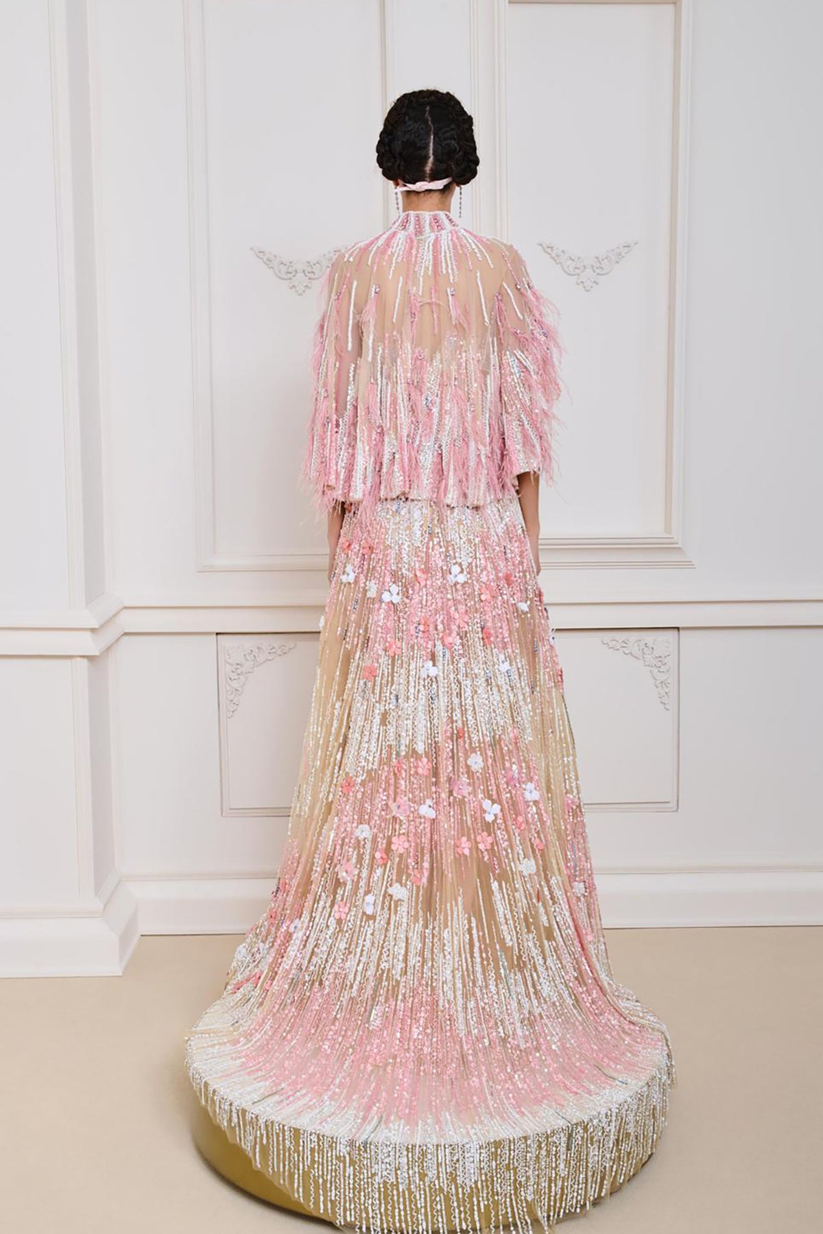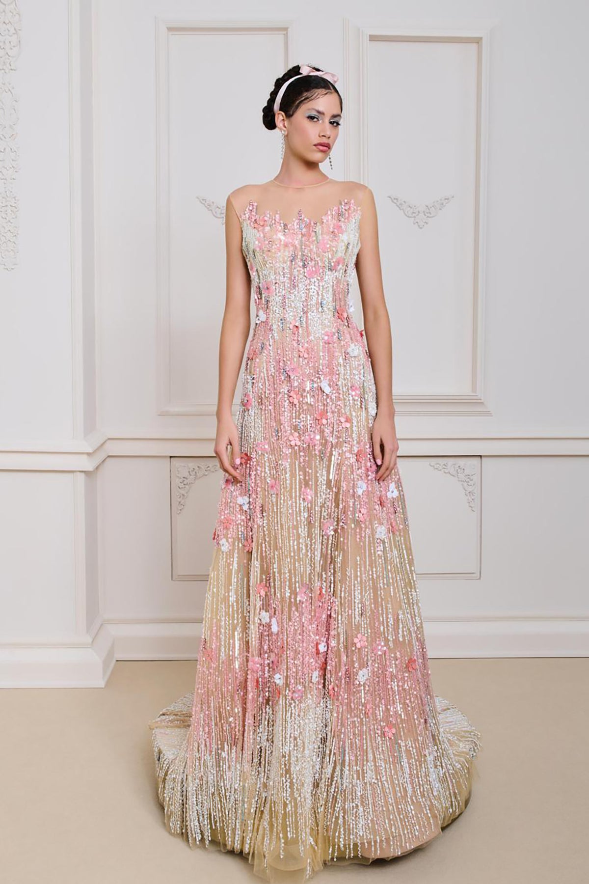 Soft nude-rose with metallic highlights long dress. Featuring a full-length A-line form fitted at the bodice and softly flaring toward the hem. Complemented with a sheer illusion yoke, it provides a touch of modesty while maintaining allure.