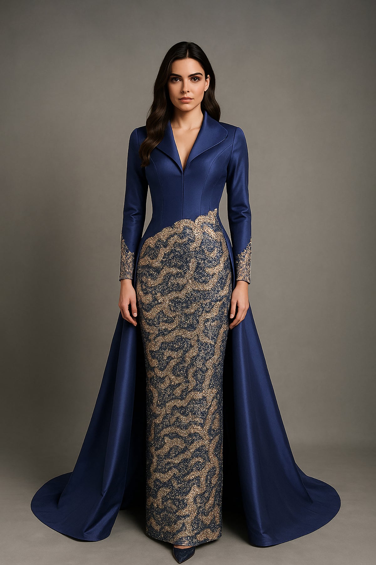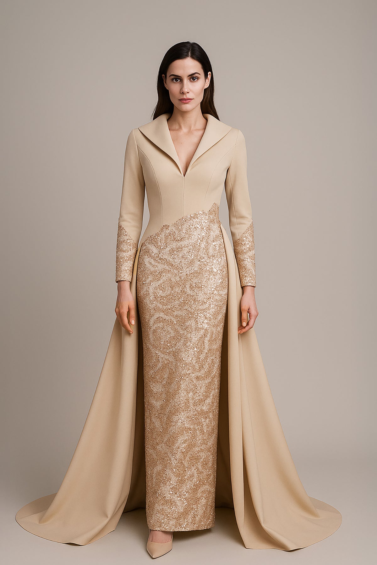 Gold column long dress. Featuring a fitted bodice with a tailored lapel collar and a deep V-neckline the skirt is a captivating blend of textures and embellishments. Complemented with an upper portion that is adorned with intricate lace embroidery shimmering subtly with sequins. Completed with an embroidered section that extends down to the mid-thigh, where it gradually transitions into a long, flowing, floor-length panel made from a lightweight fabric.