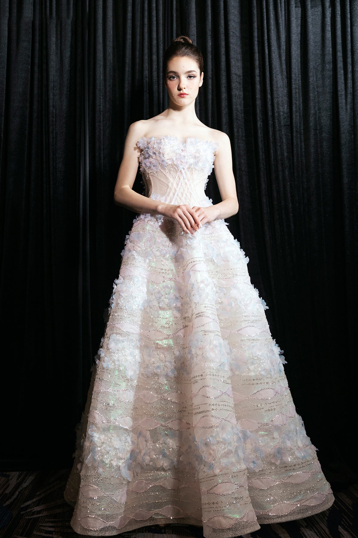 Ice white a-line long dress. Featuring a strapless neckline with a bodice is fitted tapering at the waist. Complemented with a cathedral-length veil in sheer tulle that drapes to mid-train length and 3D floral appliqués scattered across the bodice and scattered more densely along the hem and lower skirt.