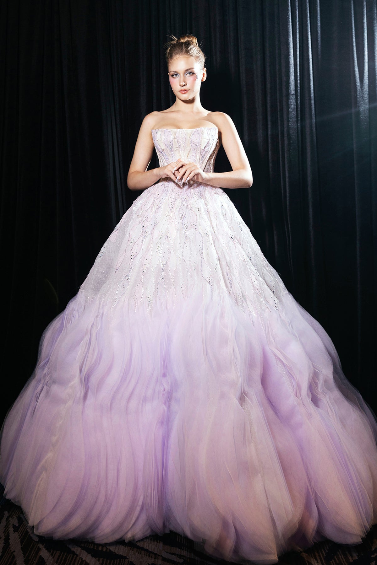 Lavender a-line long dress. Featuring a fitted corseted structured bodice with a strapless neckline and layered tulle in multiple airy tiers to create volume. Complemented with crystals embedded within the embroidery along the bodice.