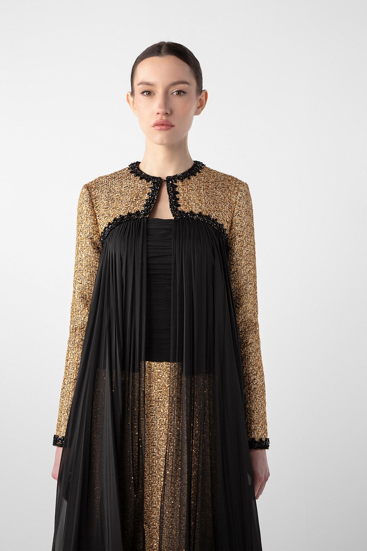 A refined ensemble featuring a tweed jacket adorned with hand-embroidered crystals. The lightweight chiffon overlay cascades from the shoulders, creating a fluid, ethereal effect. The fitted silhouette of the underdress enhances the structured elegance of the design.