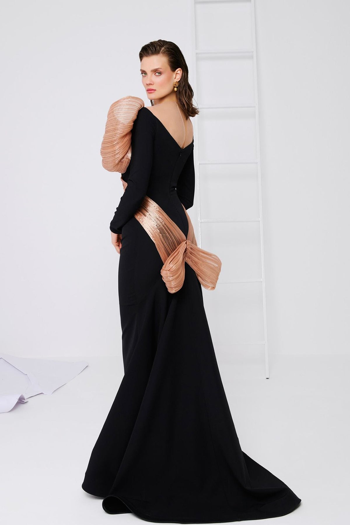Black and long dress. Featuring a crepe and metallic organza with a round neck illusion cut. Complemented with a round neckline illusion cut and embellished with plisse drapes on the bust and waist. Completed with long sleeves and mermaid lower cut that fit to the body.