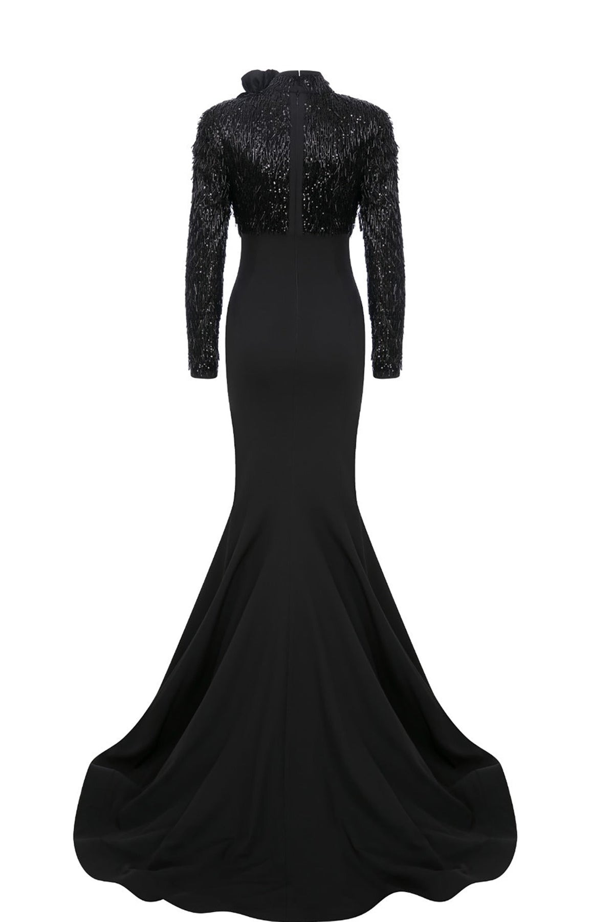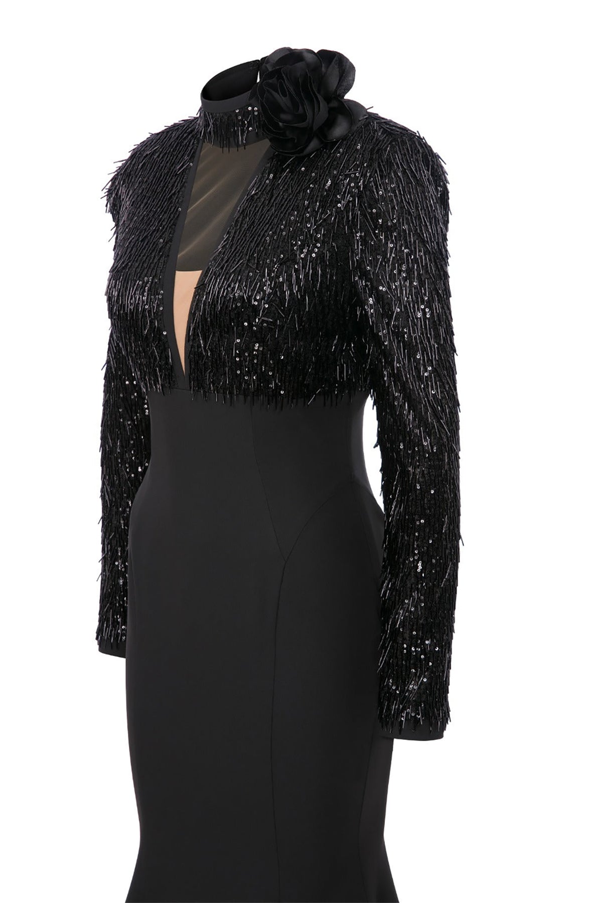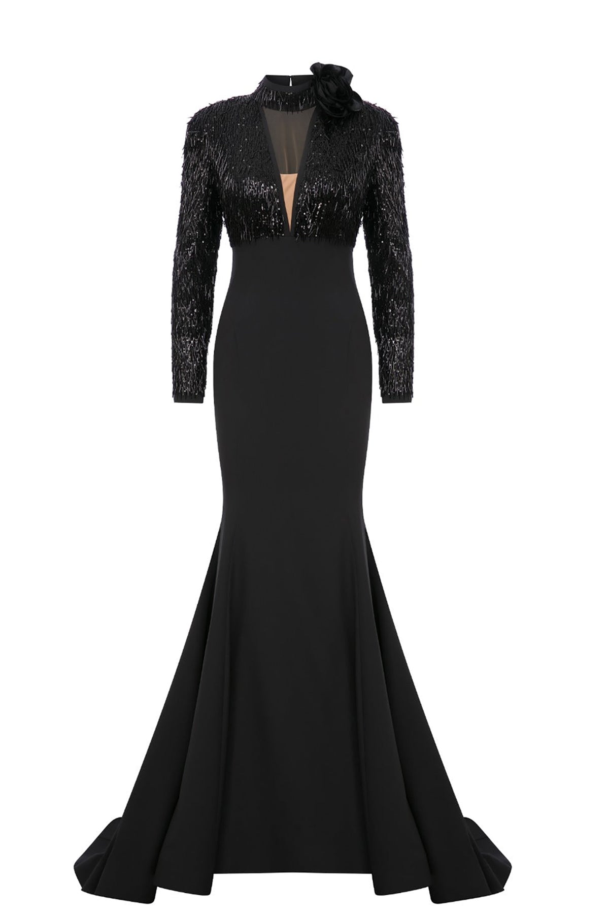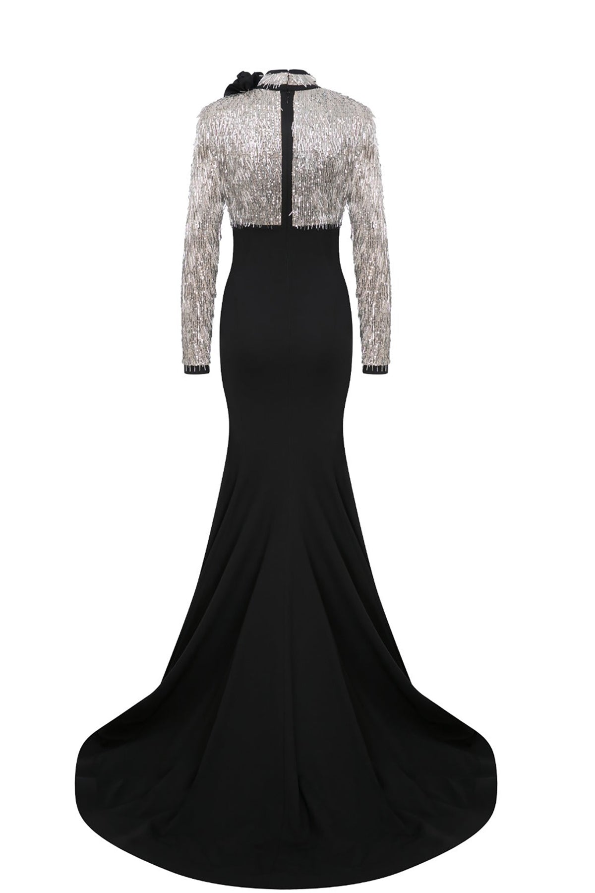 Black and silver long dress. Featuring a sequinned beaded tulle with a low V-neck cut, with a mermaid lower cut that is embellished with hand-beaded tulle on the upper part of the dress. Complemented with two long sleeves and fitted to the body.