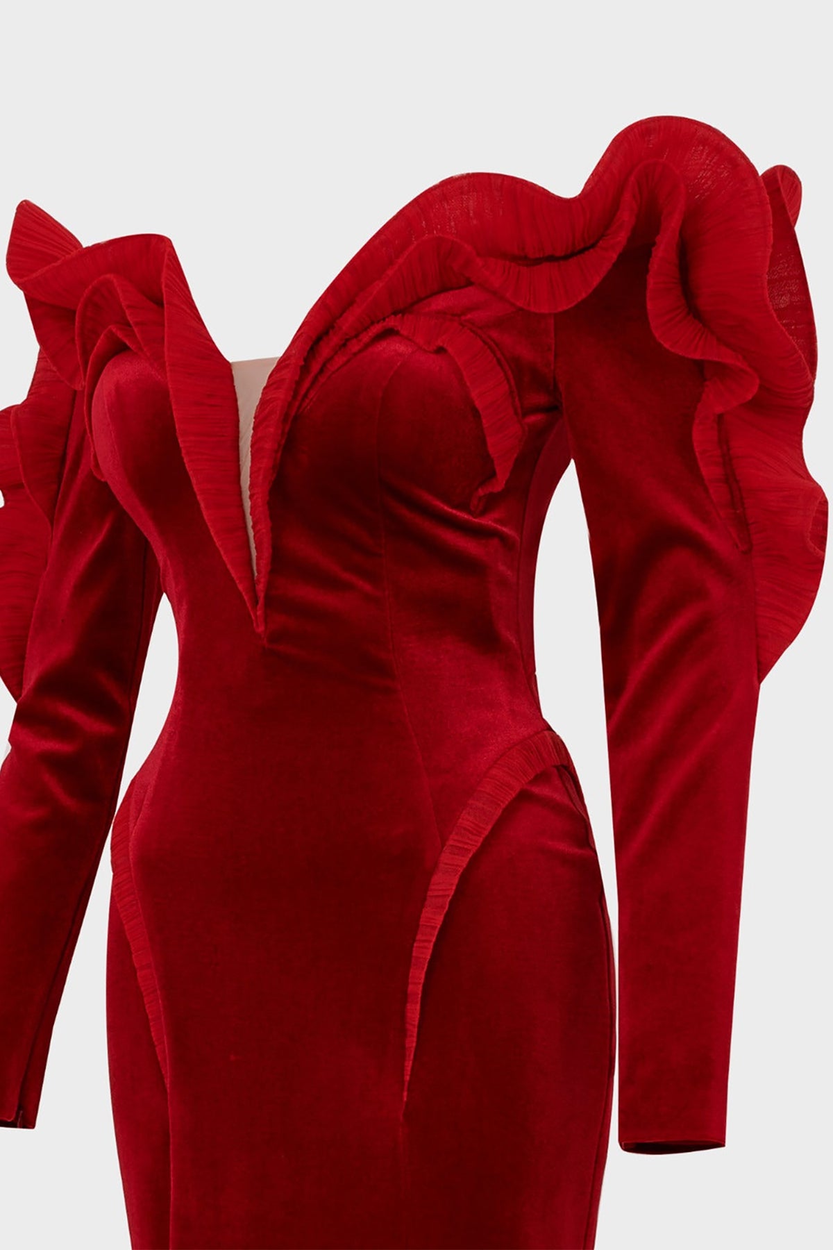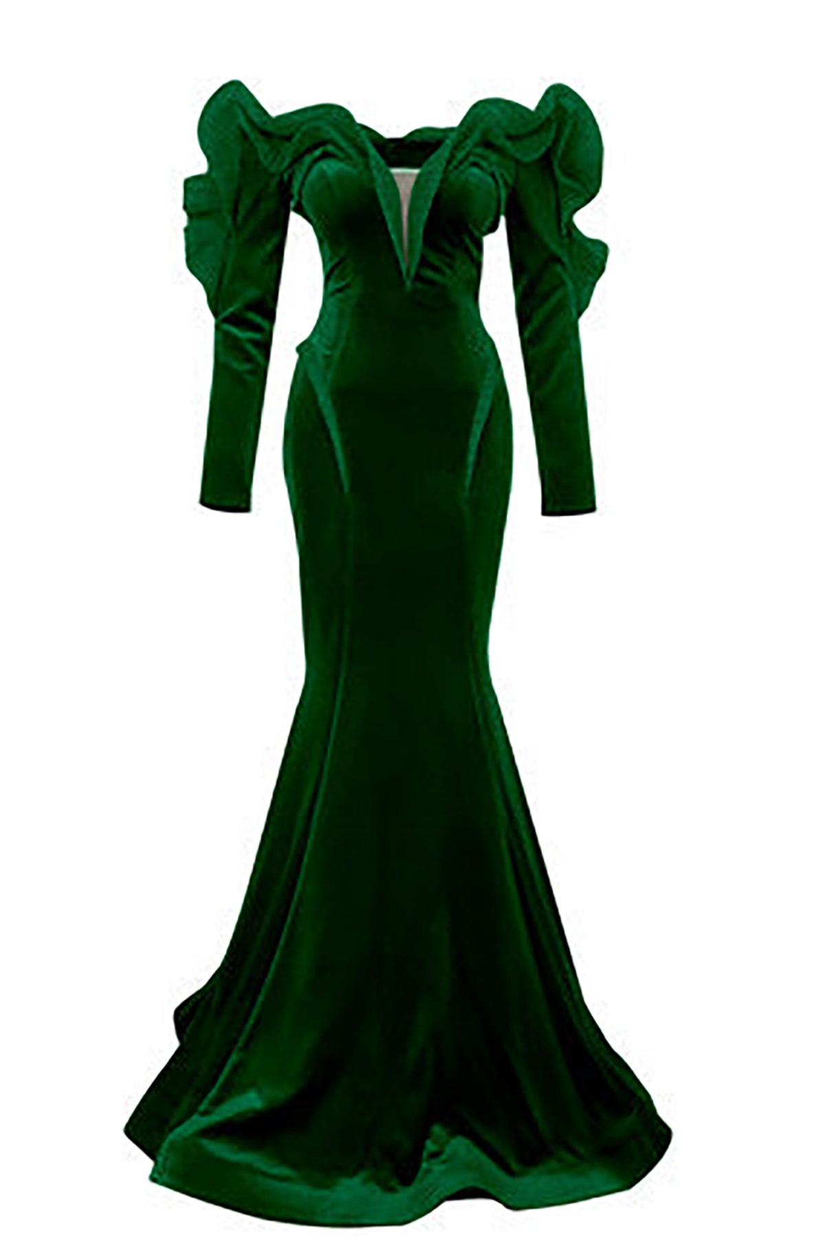 Purple long velvet dress. Featuring an off-the-shoulder neckline with two long sleeves a fitted mermaid silhouette. Complemented with an embellished ruffles on the bust.