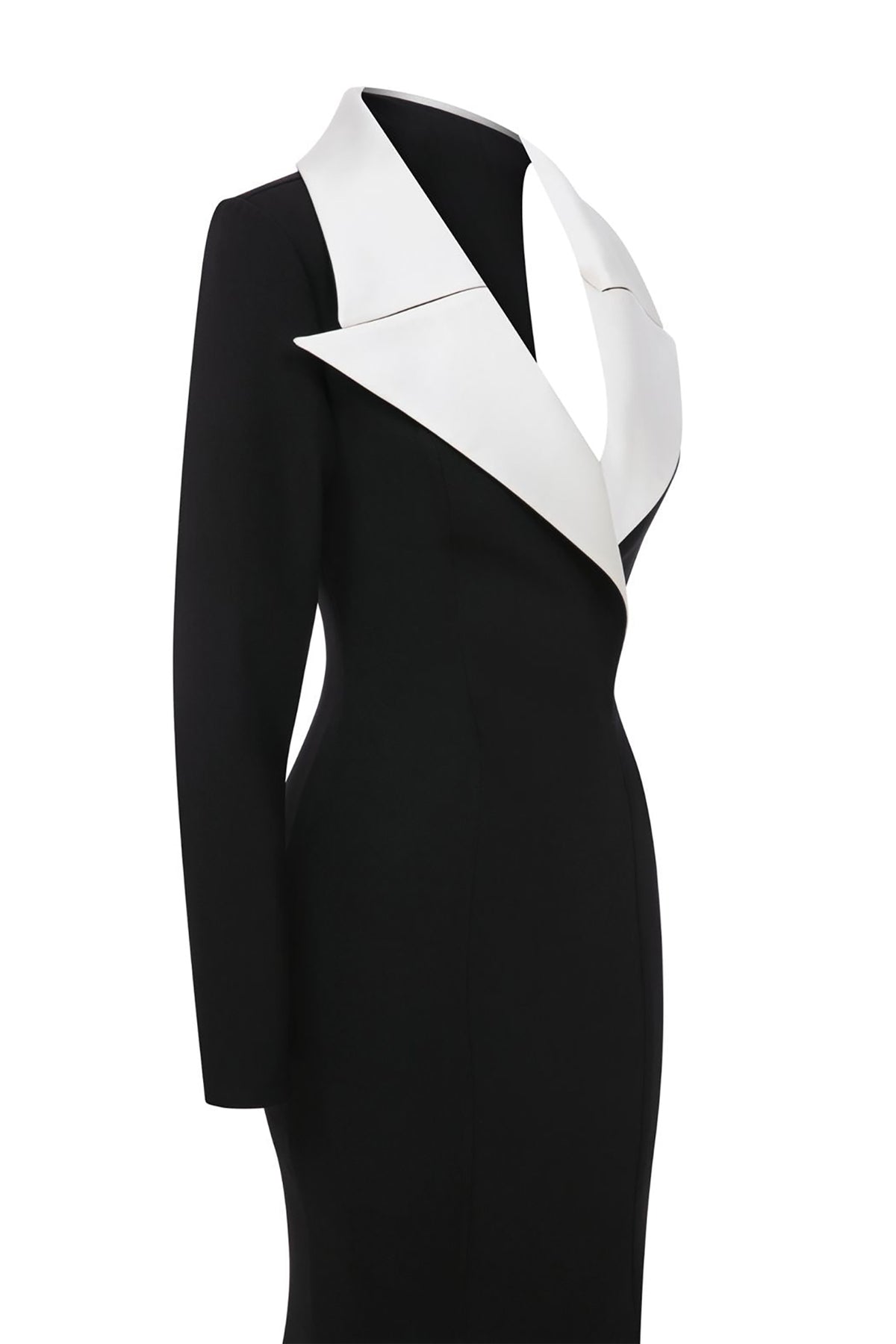 Black and white long dress. Featuring a mermaid long silhouette with architectural precision and high-glamour detailing. Complemented with an off-the-shoulder neckline the bodice-to-skirt.