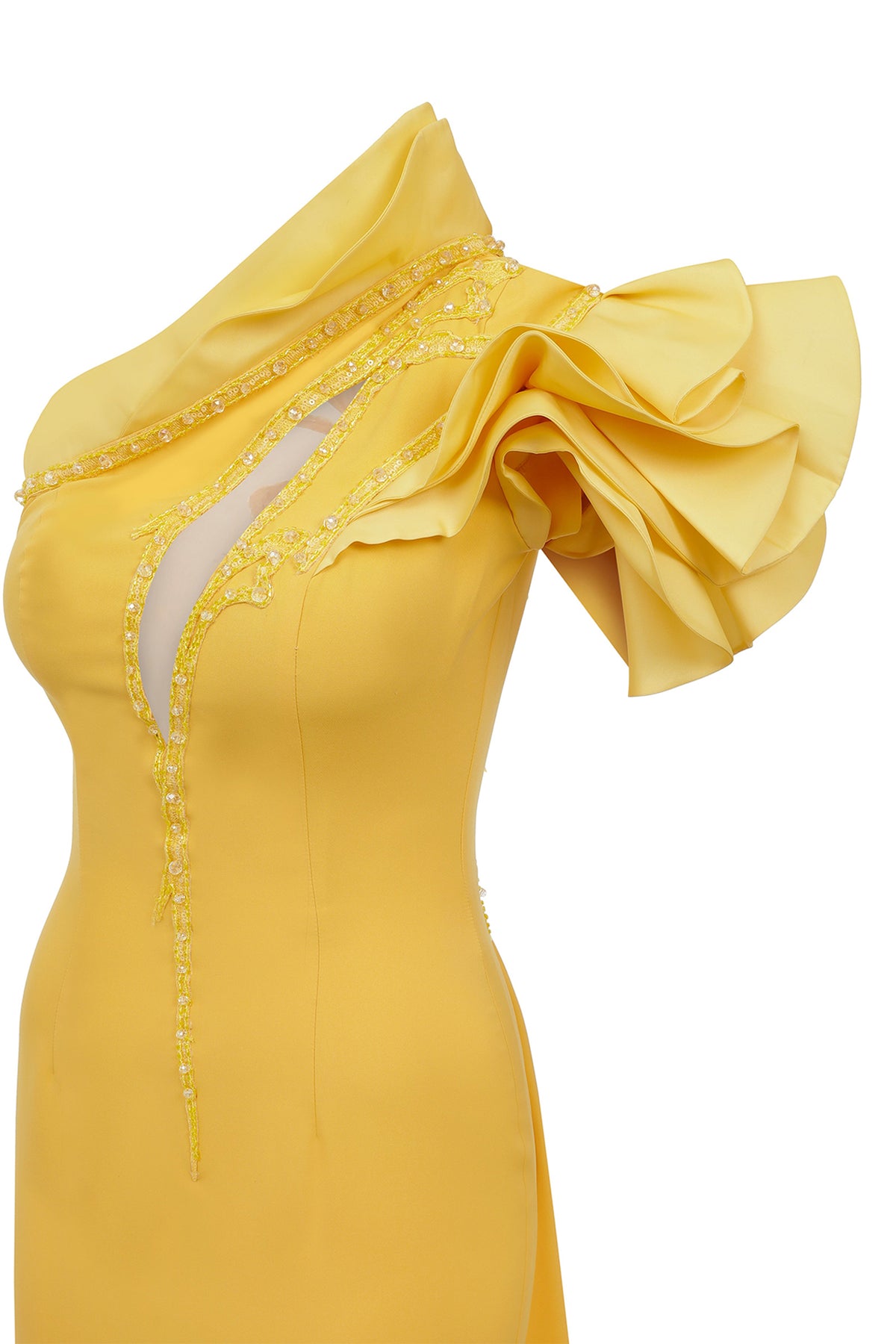 Cherry crepe and organza dress. Featuring with an asymmetrical mermaid silhouette ruffles on one shoulder and a slit embellishments on the bust. Complemented with a tassel embellishment on the bust.