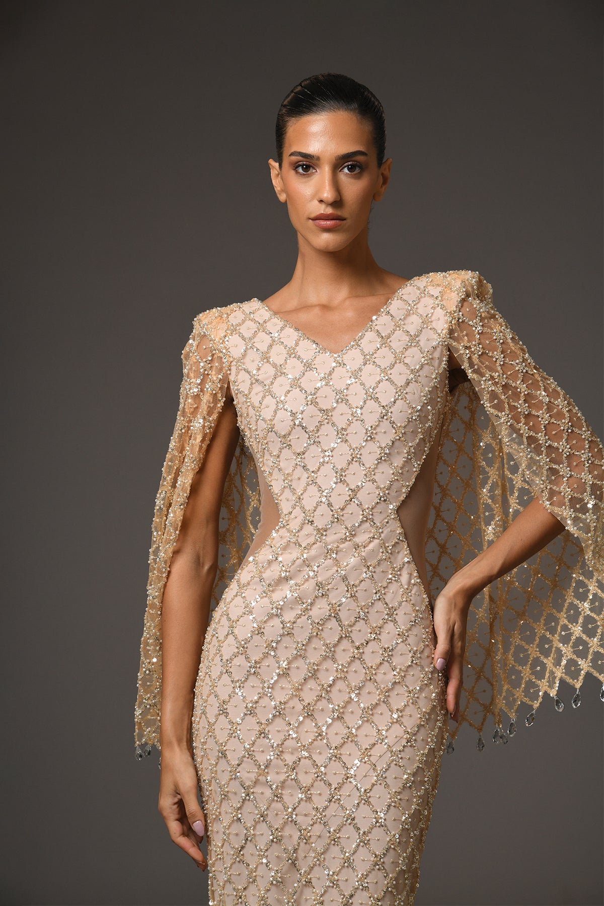 Nude tulle long dress. Featuring a cape, embroidered tulle, and Crystals. Complemented with a structured shoulders and back slit.
