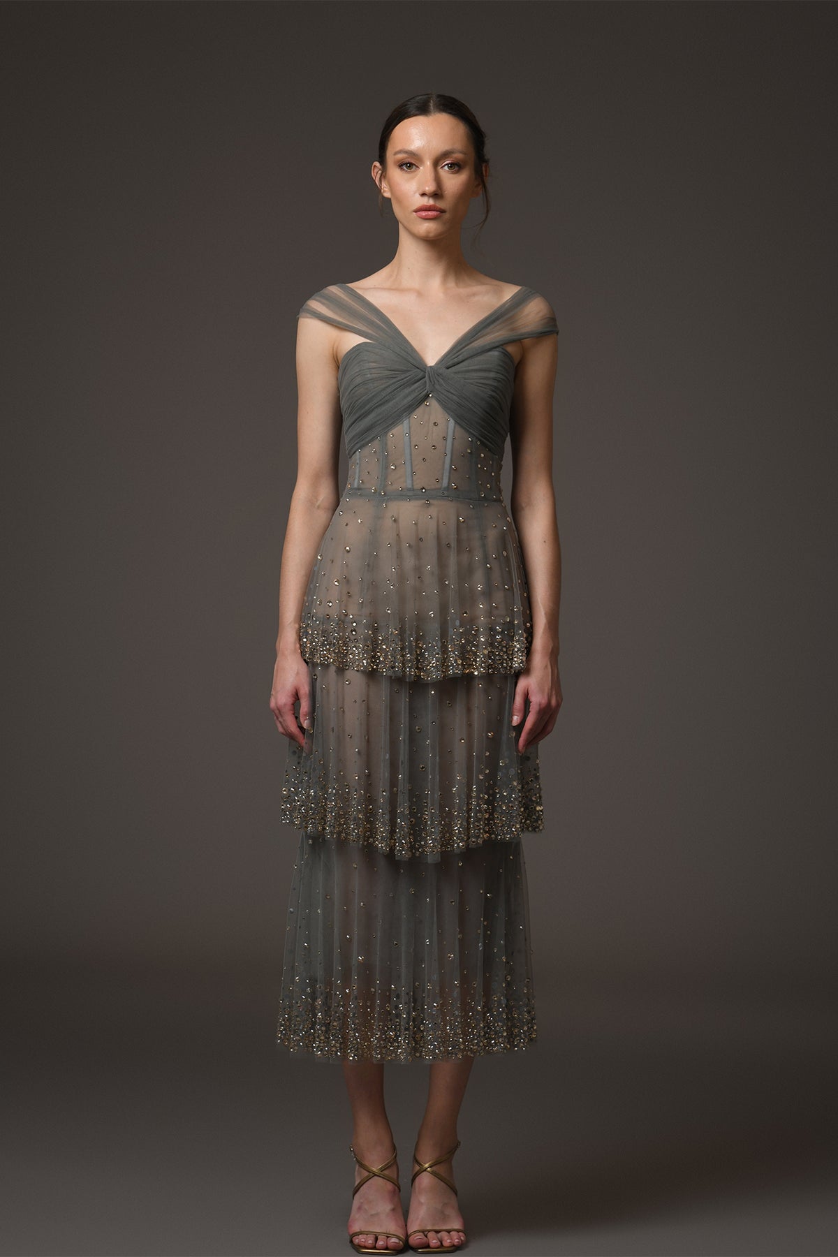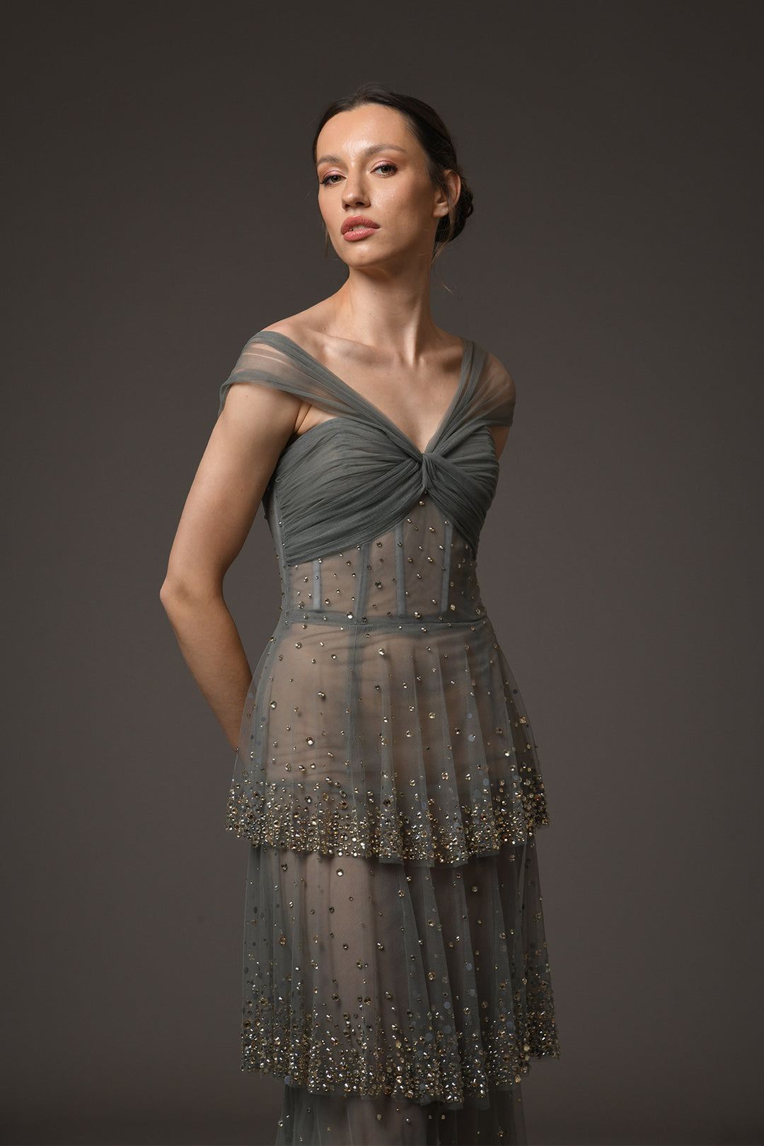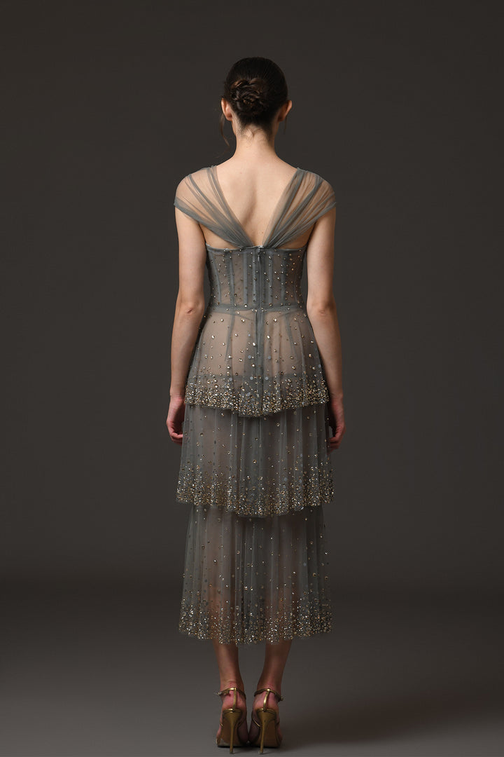 Grey layered tulle midi dress. Featuring sheer tulle, and crystal embroidery. Complemented with structured corset.