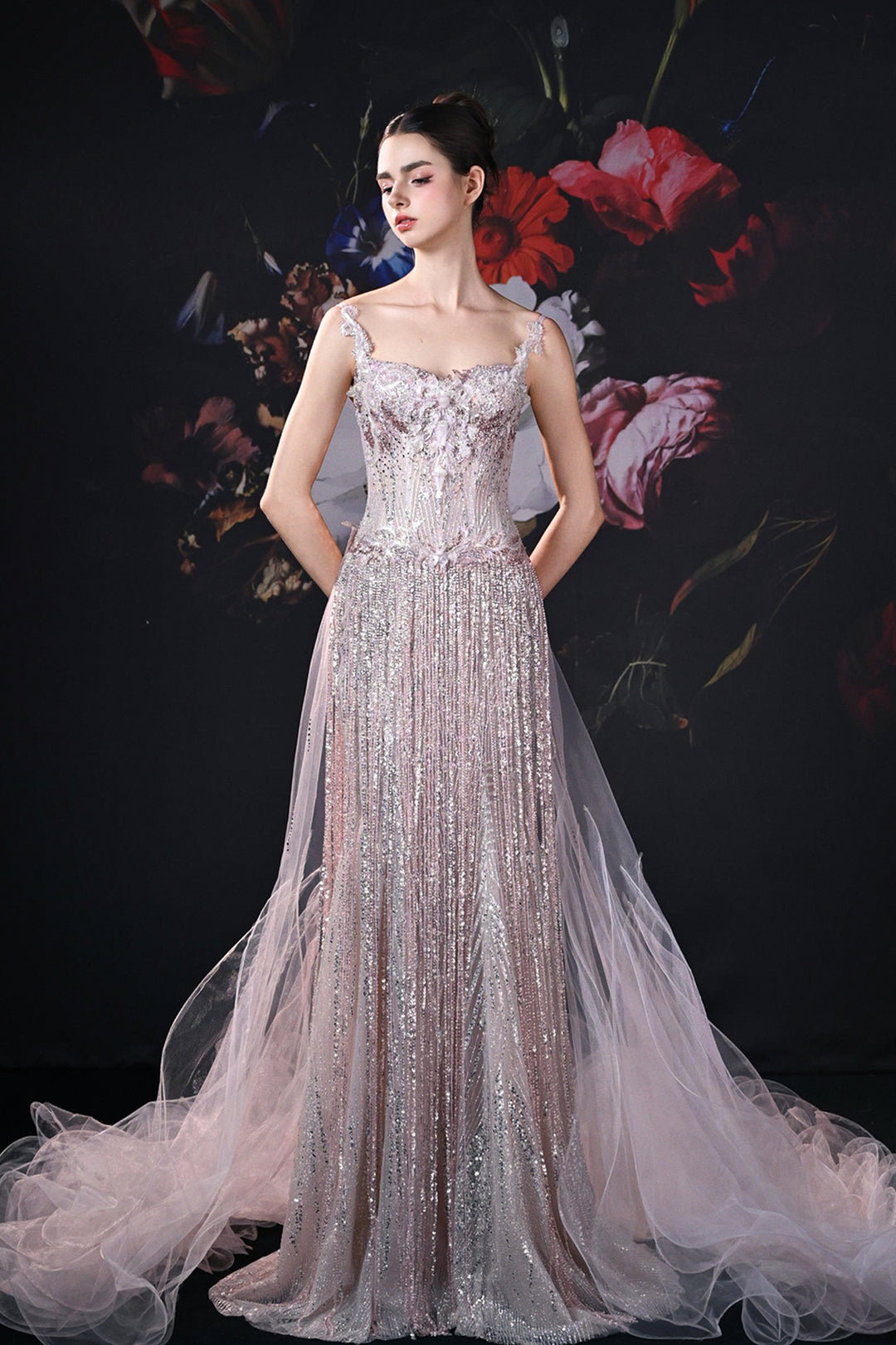 A-Line Dress with Crystal Embroidery and Floral Motifs