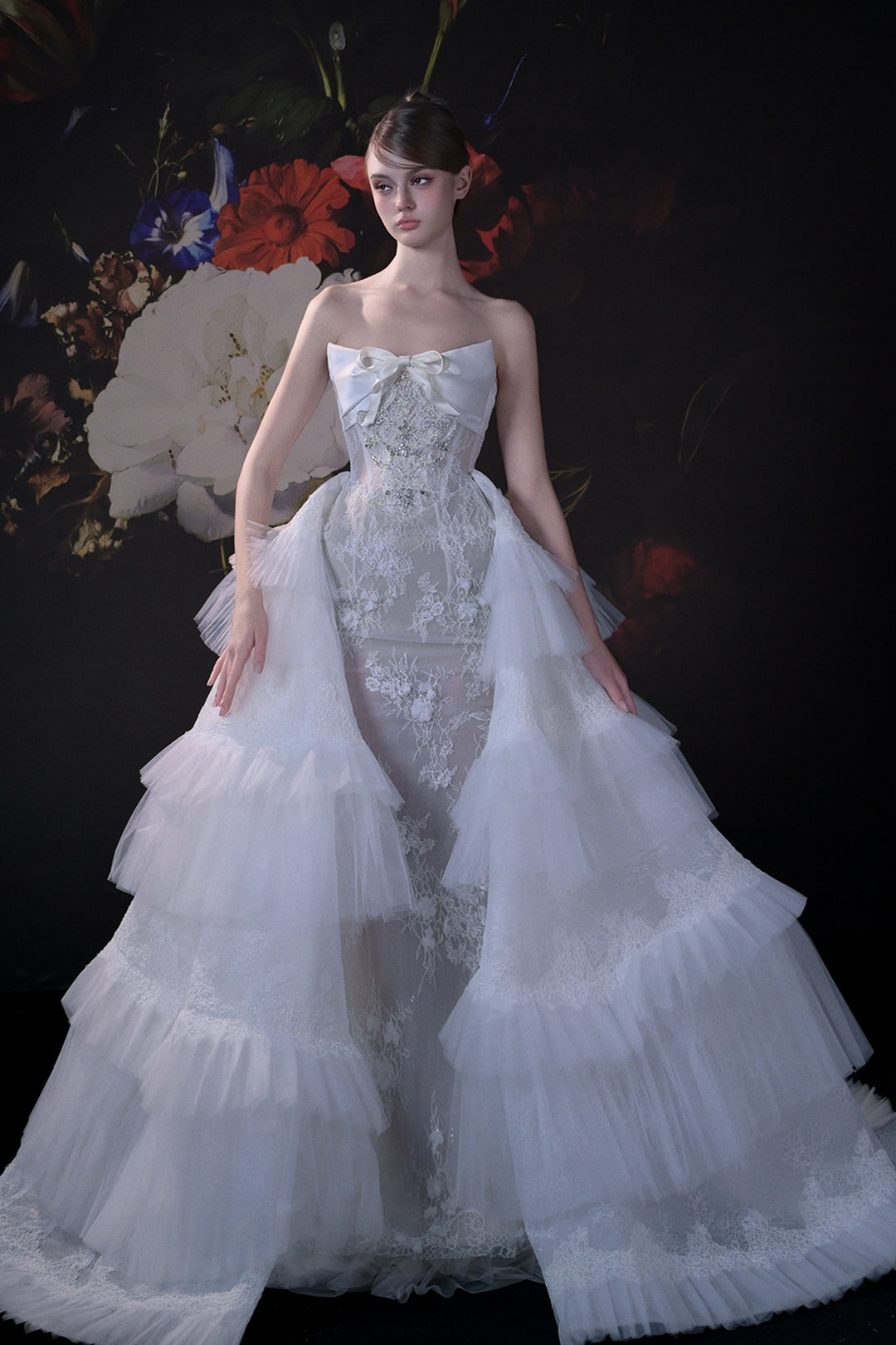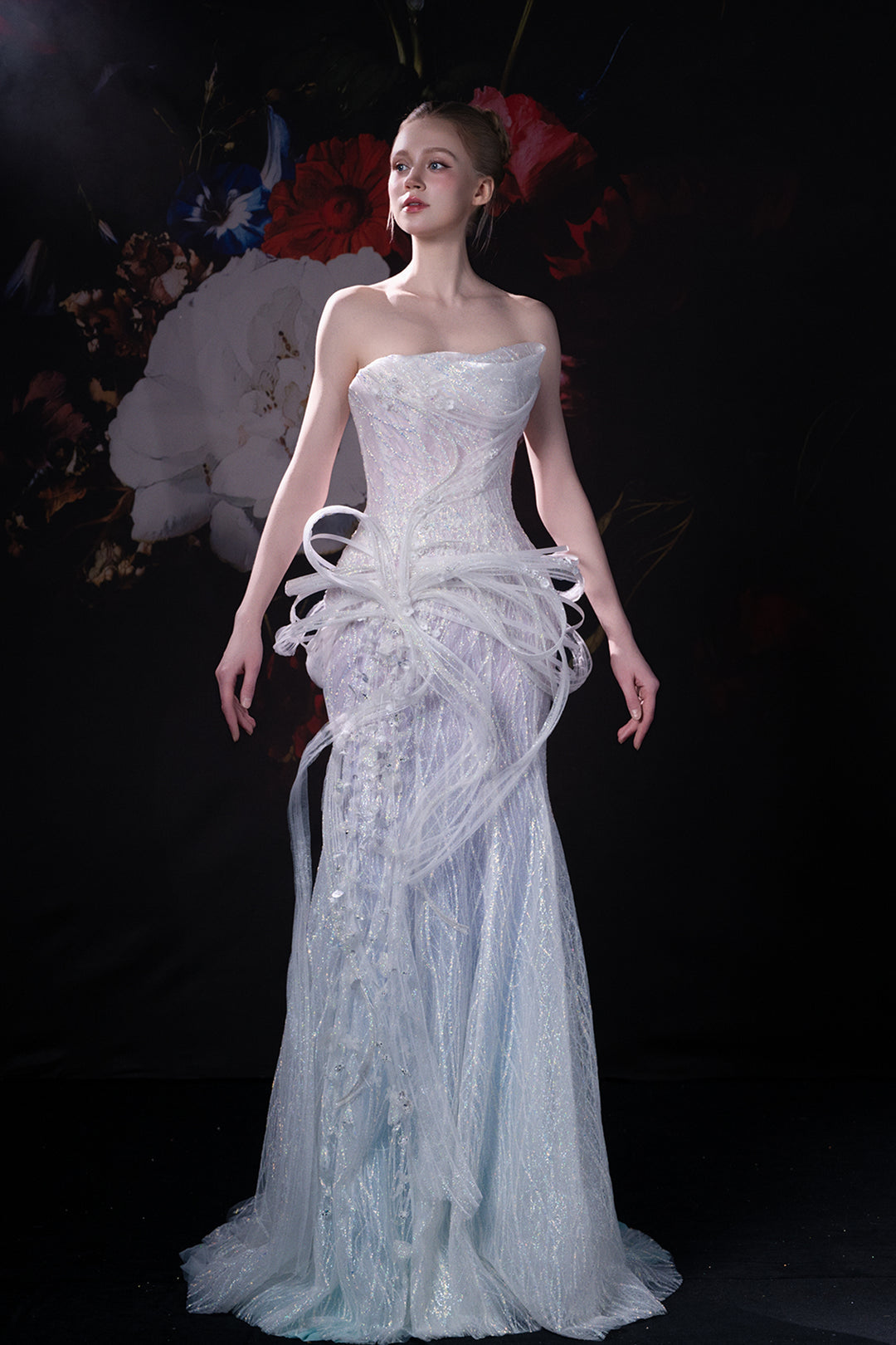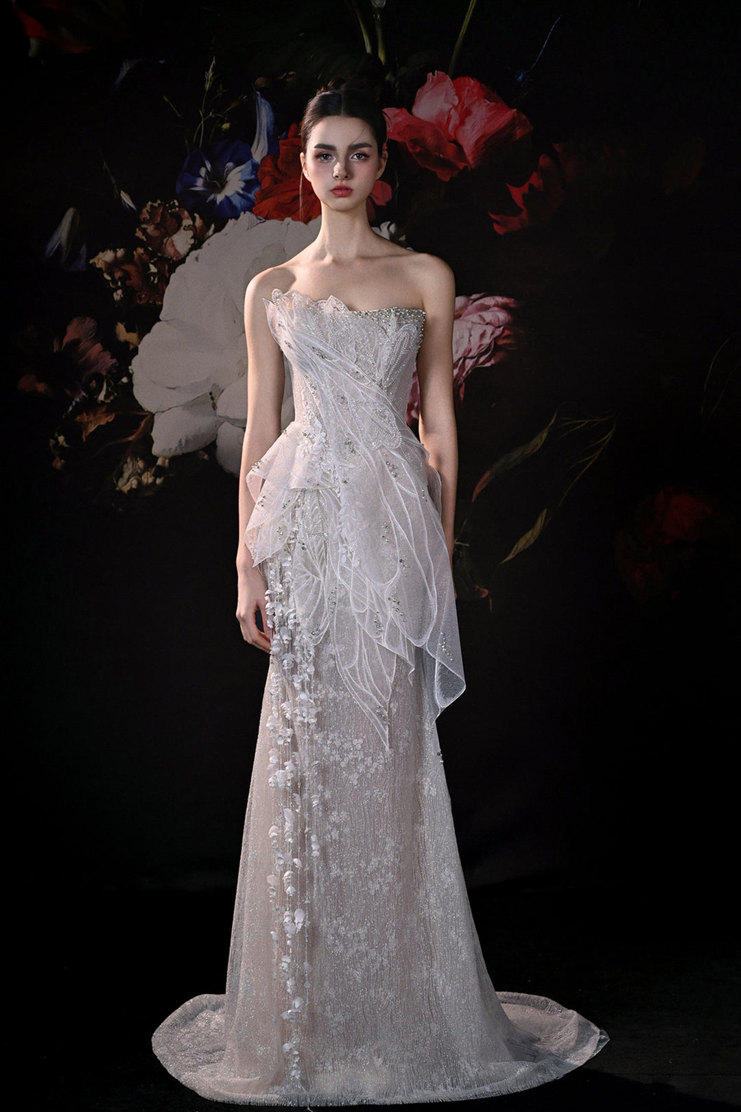 Mermaid Dress with 3D Appliqués and Ruffled Sleeves