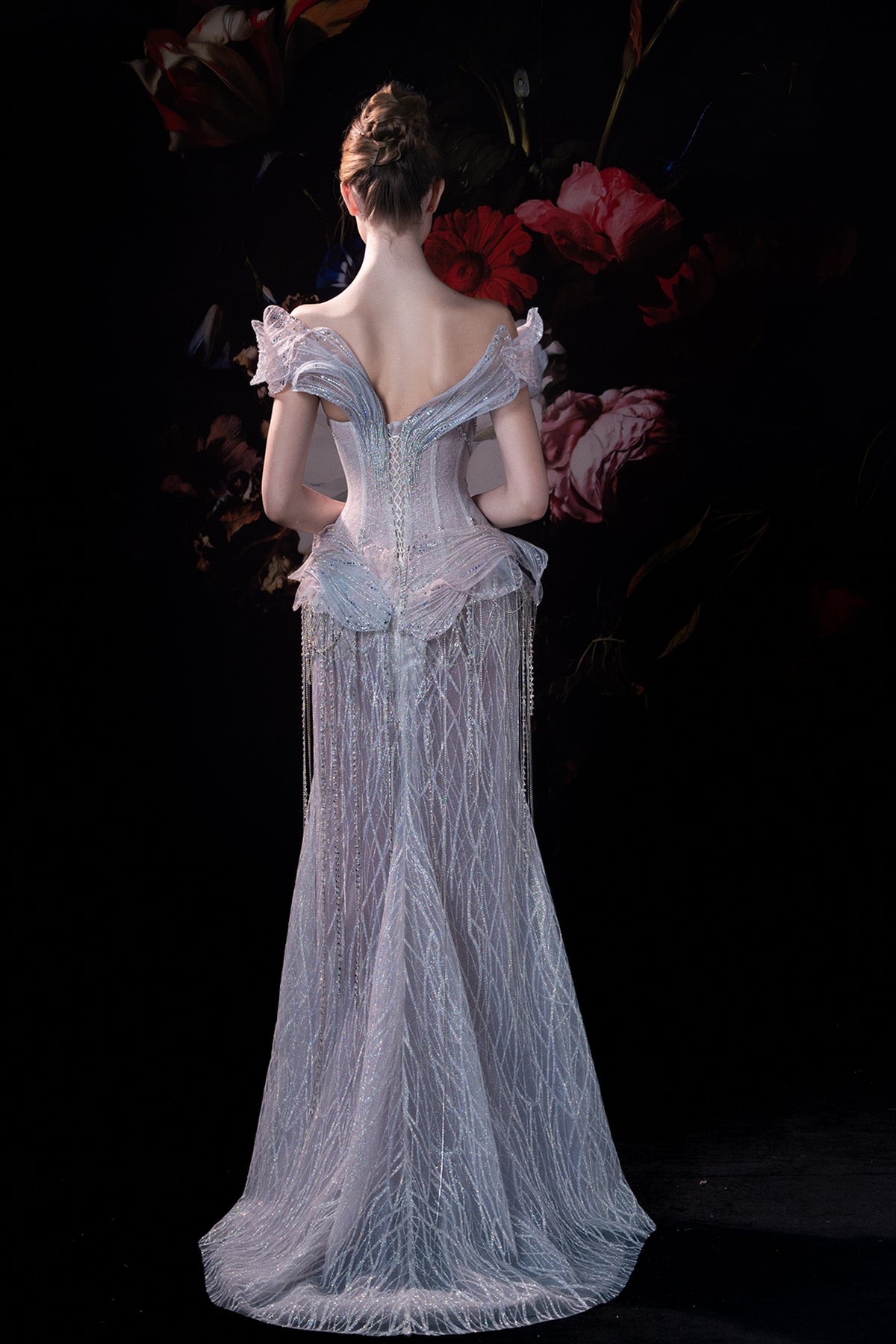 White column floor-length dress. Featuring an off-the-shoulder neckline that dips slightly flattering the collarbone and shoulders. Complemented with a fitted with delicate seaming that creates a structured corseted.