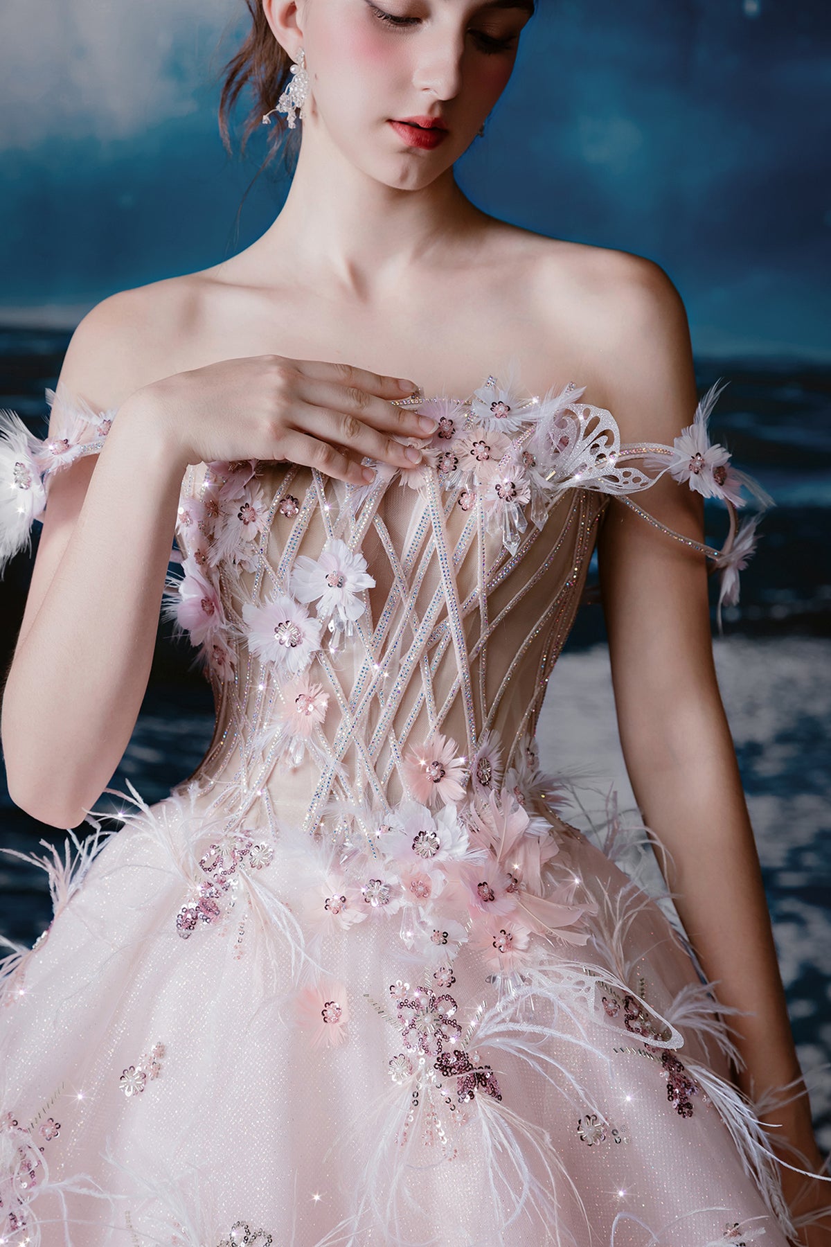 Blush a-line long dress. Featuring an floral motifs and beadwork in silver, pale pink, ivory, and subtle metallic threads to enhance depth and shimmer. Complemented with an off-the-shoulder neckline with a multiple layers of tulle organza fabric.