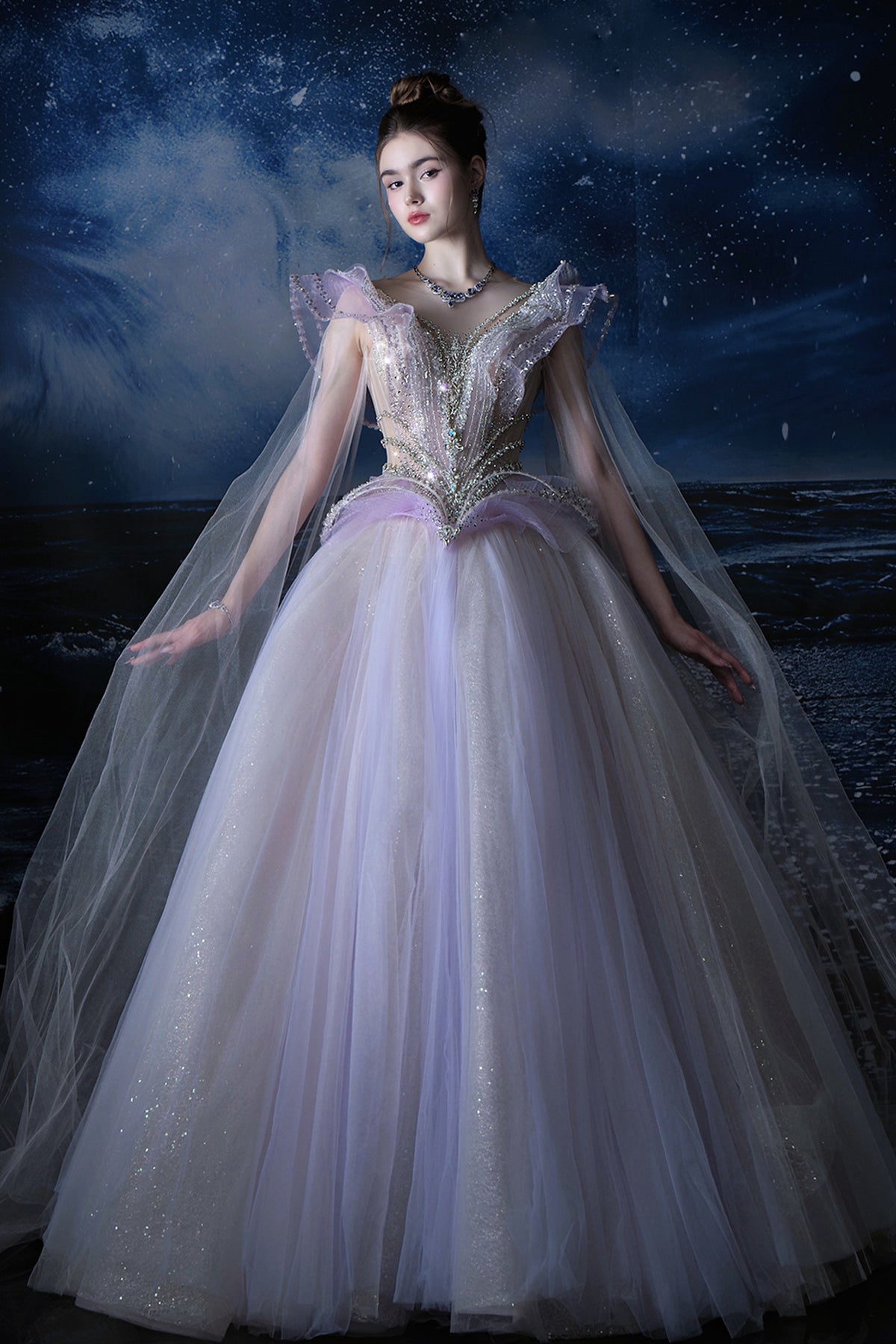 Lilac a-line long dress. Featuring a sheer multi-layered skirt showcases a subtle gradient with an a-line dress with a sculpted structured bodice that hugs the torso before flaring into a voluminous skirt. Complemented with a waist cinched to create a flattering hourglass shape the bodice is fitted and sculpted with a high-illusion neckline and cape sleeves.