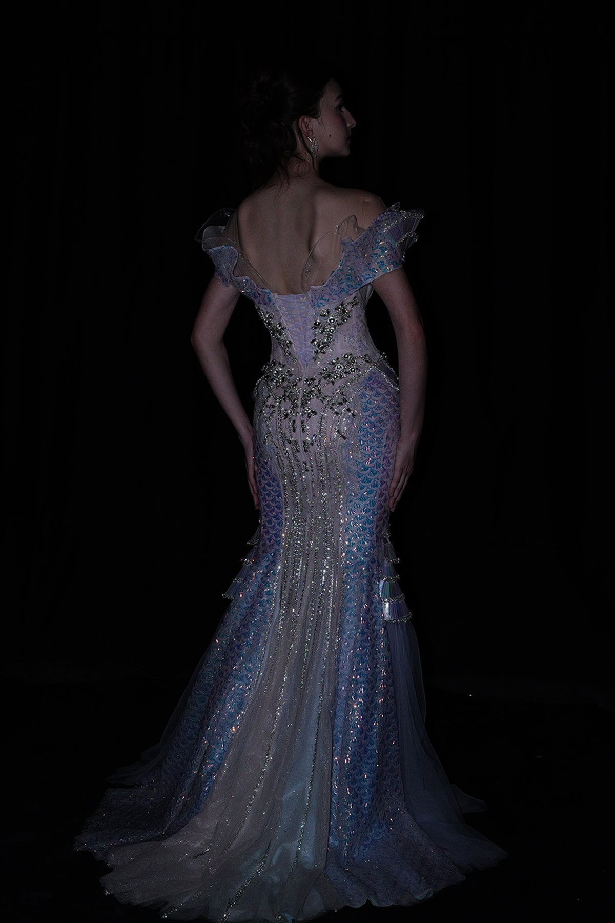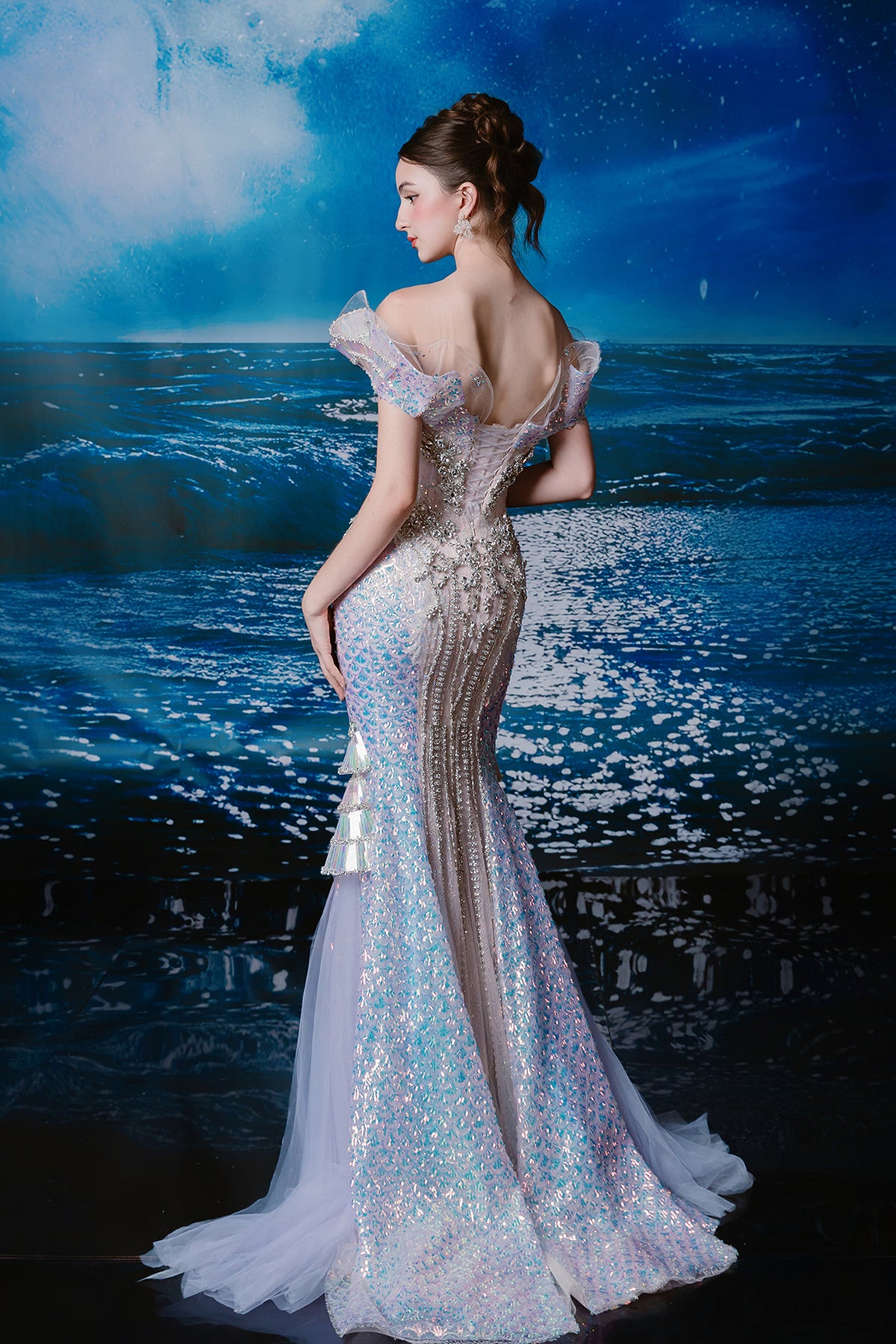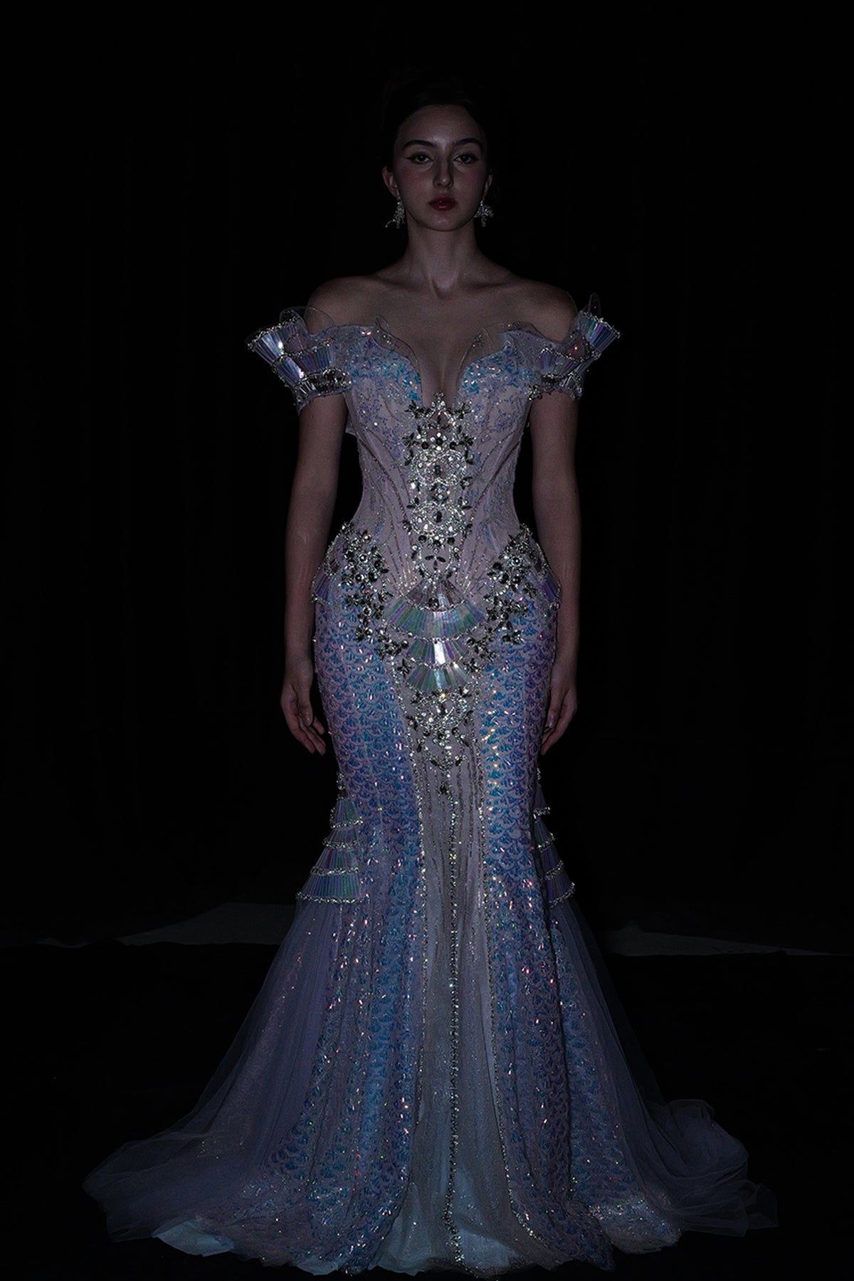 Metallic silver mermaid long dress. Featuring an off-the-shoulder neckline with a fitted corseted bodice with interior boning that sculpts the torso. Complemented with bodice cinches at the natural waist that creates a defined silhouette into the skirt. Completed with a sleek fitted sheath near the hips and gradually expands into a fuller with an embellished with sequins.