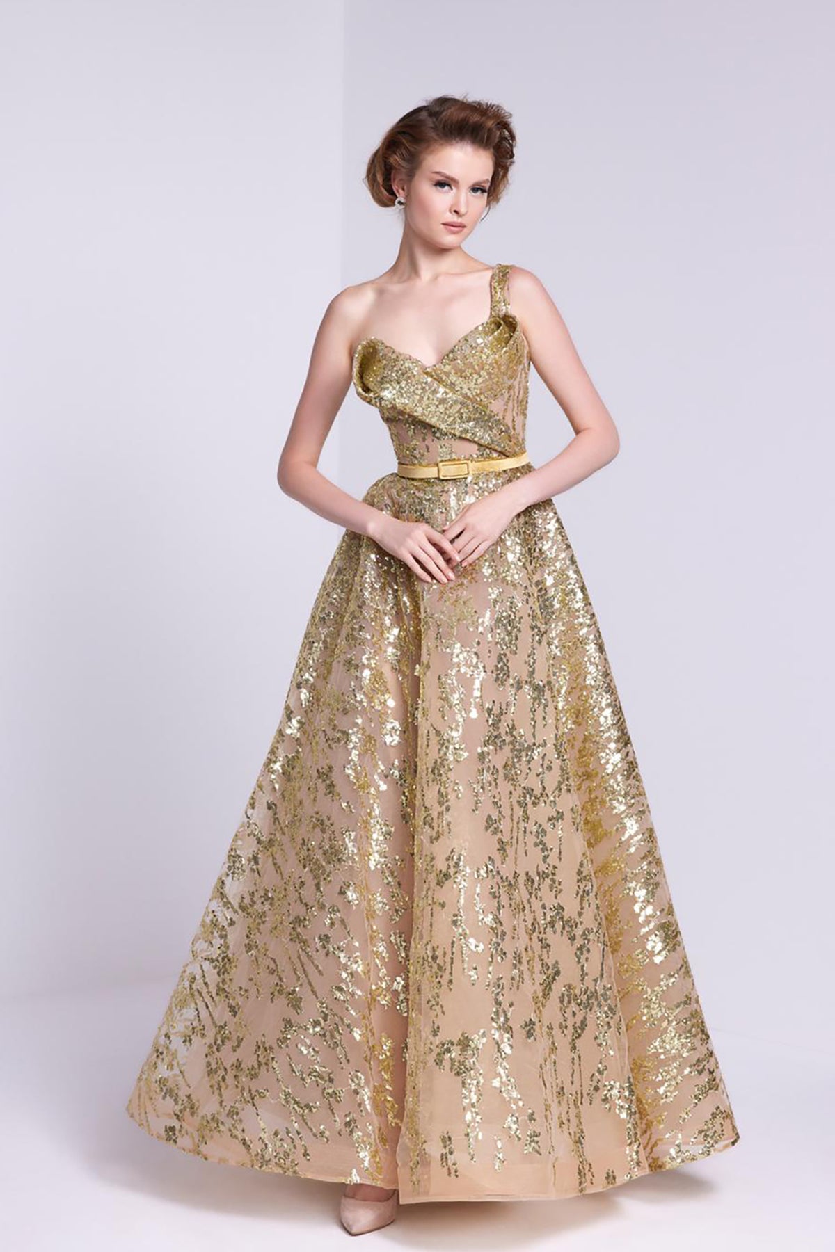 Gold long dress. Featuring payet detailing with an asymmetrical upper cut and a flared lower cut. Complemented with a belt, draped bust and waist and full embroidery.