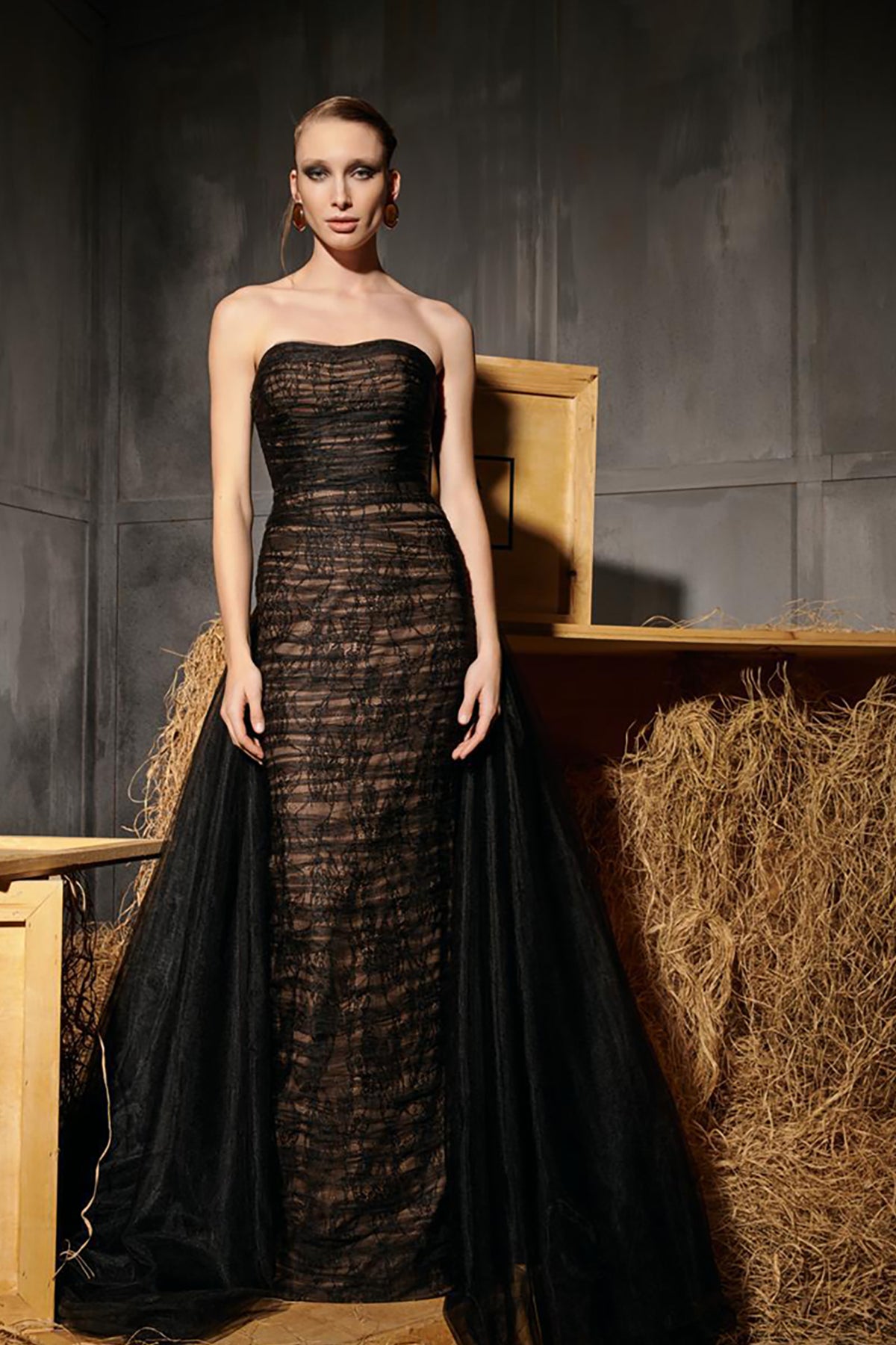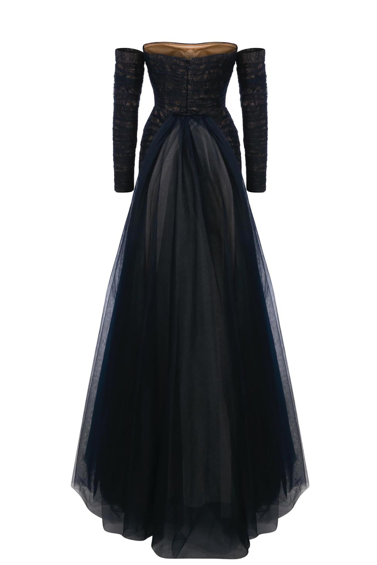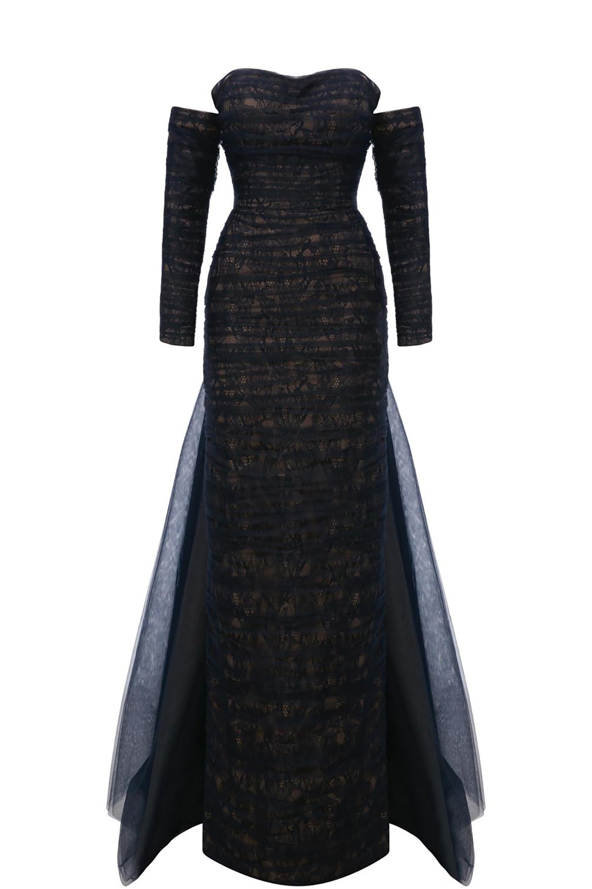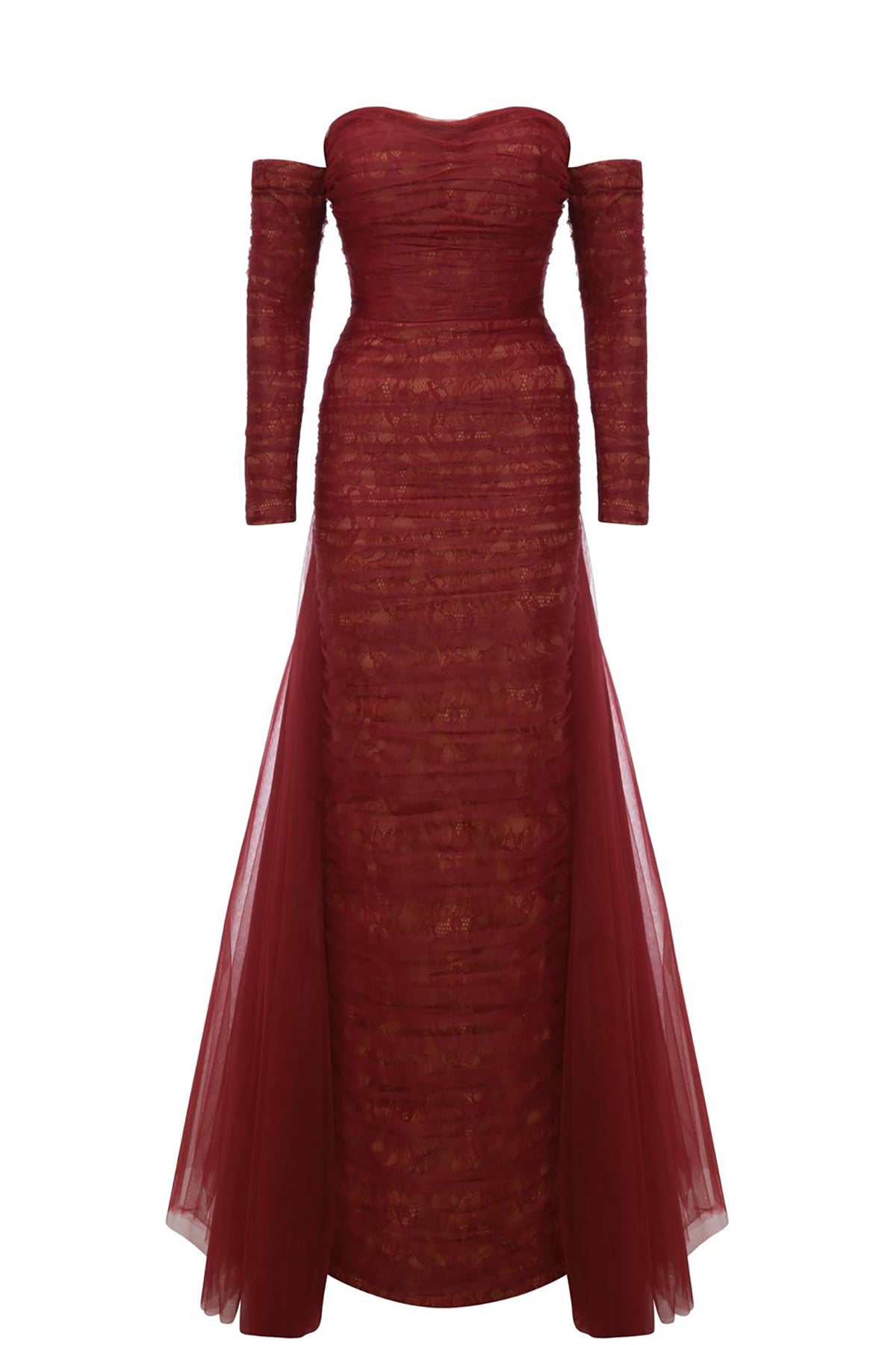 Burgundy column long dress. Featuring an off-the-shoulder neckline an overlay of sheer tulle that fits a sheer tulle overskirt.