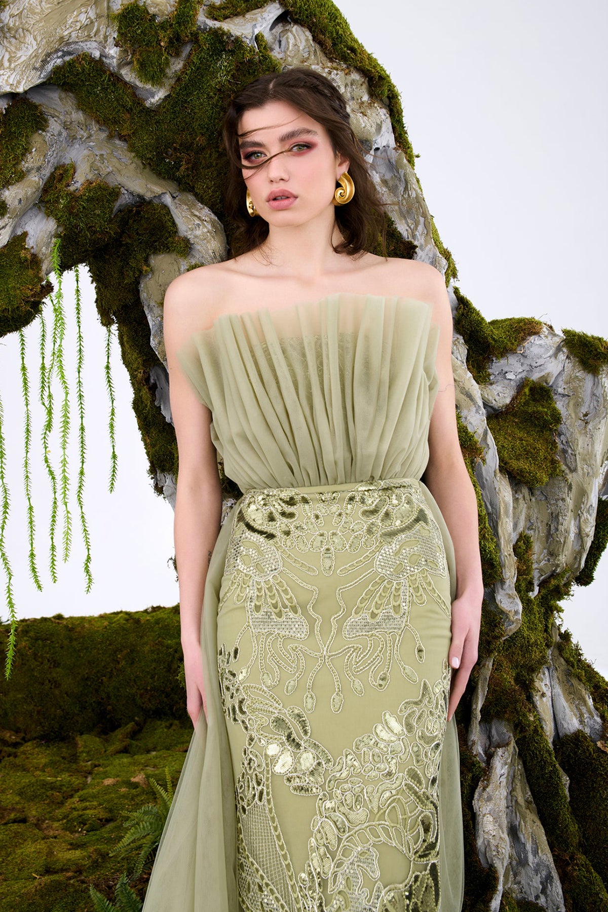 Pistachio long dress. Featuring a soft-pleated bodice and a richly embroidered flowing skirt. Complemented with an off-the-shoulder style that sits wide and gently across the collarbone, exposing the shoulders with a sense of calm elegance.