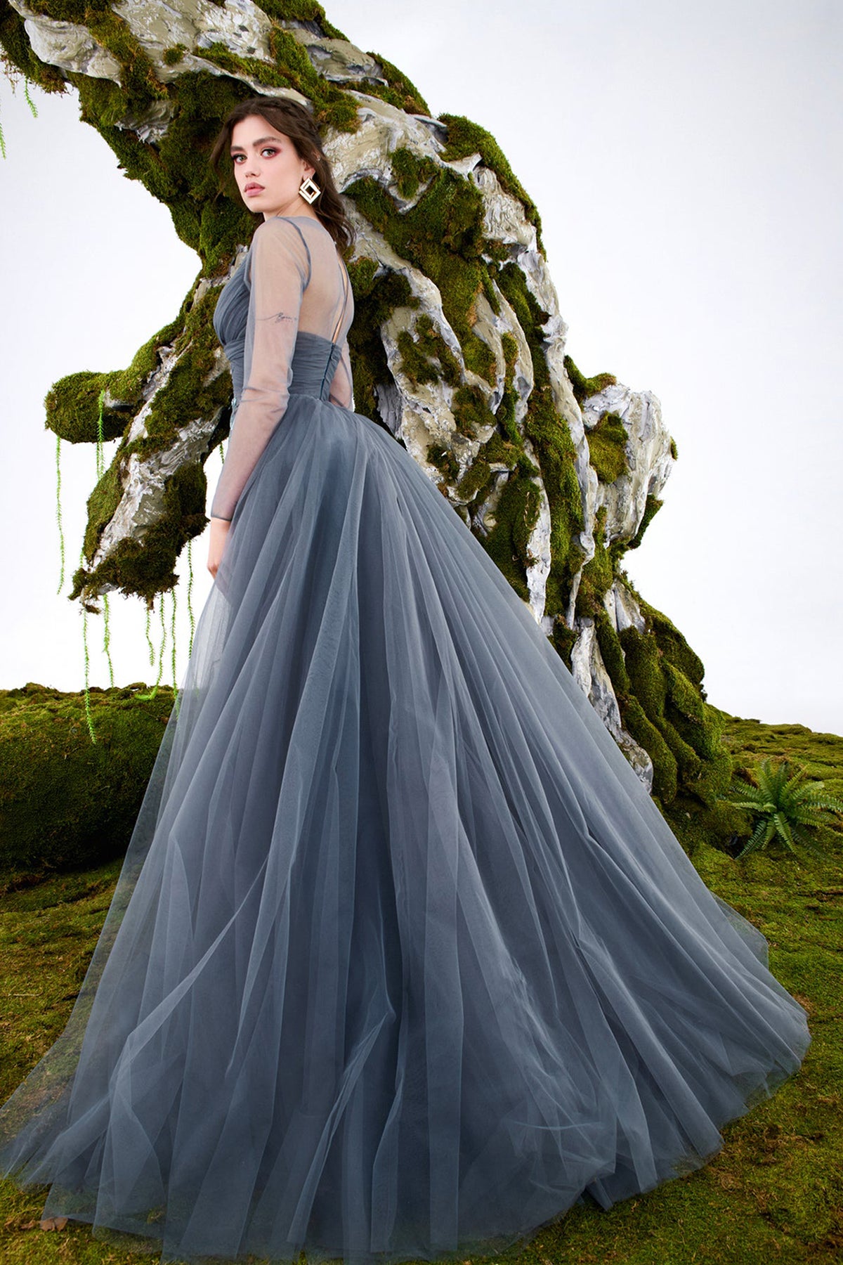 Multicolor column long dress. Featuring an overskirt with a fitted illusion bodice with a bold sculpted overlay that transitions into a split-front skirt. Complemented with sheer sleeves that extend from a veiled shoulder seam, and a belt-like element acts as a visual hinge between the embroidered center panel and the enveloping drape of the over-skirt.