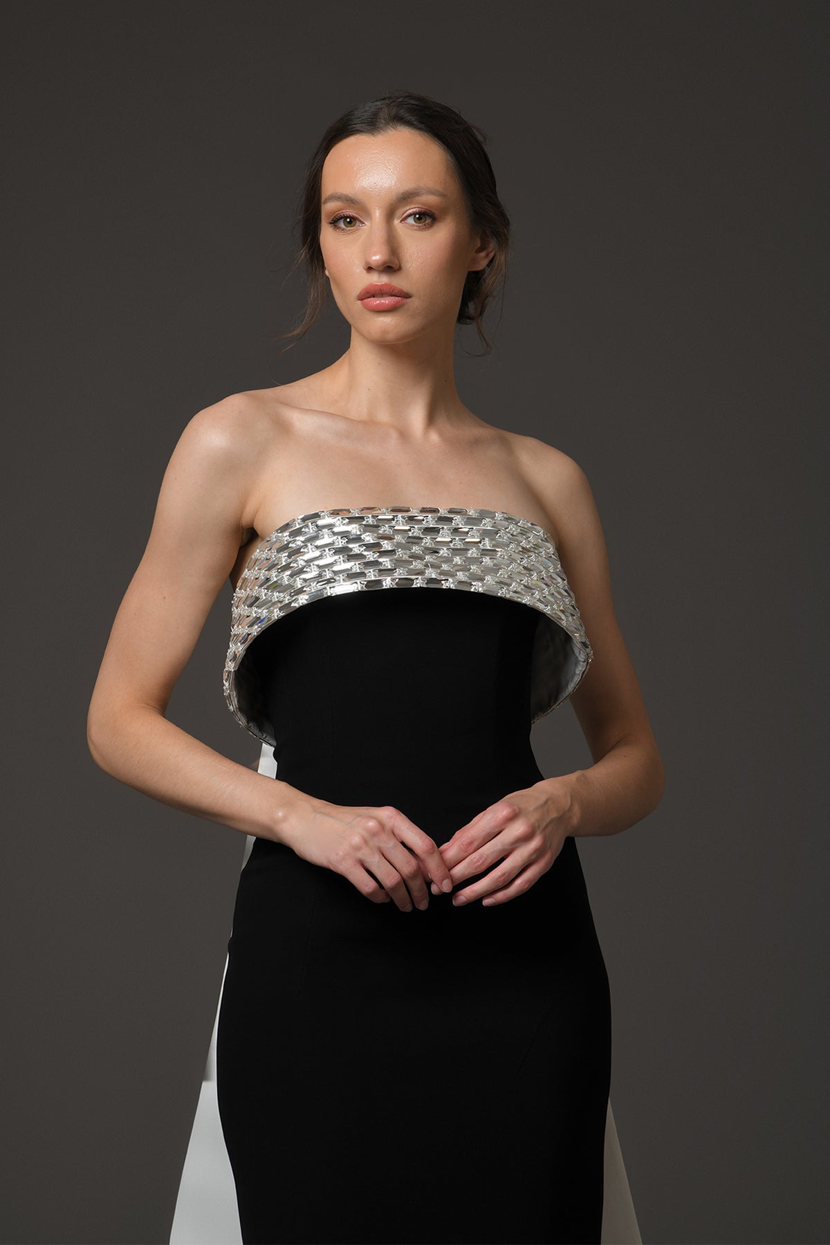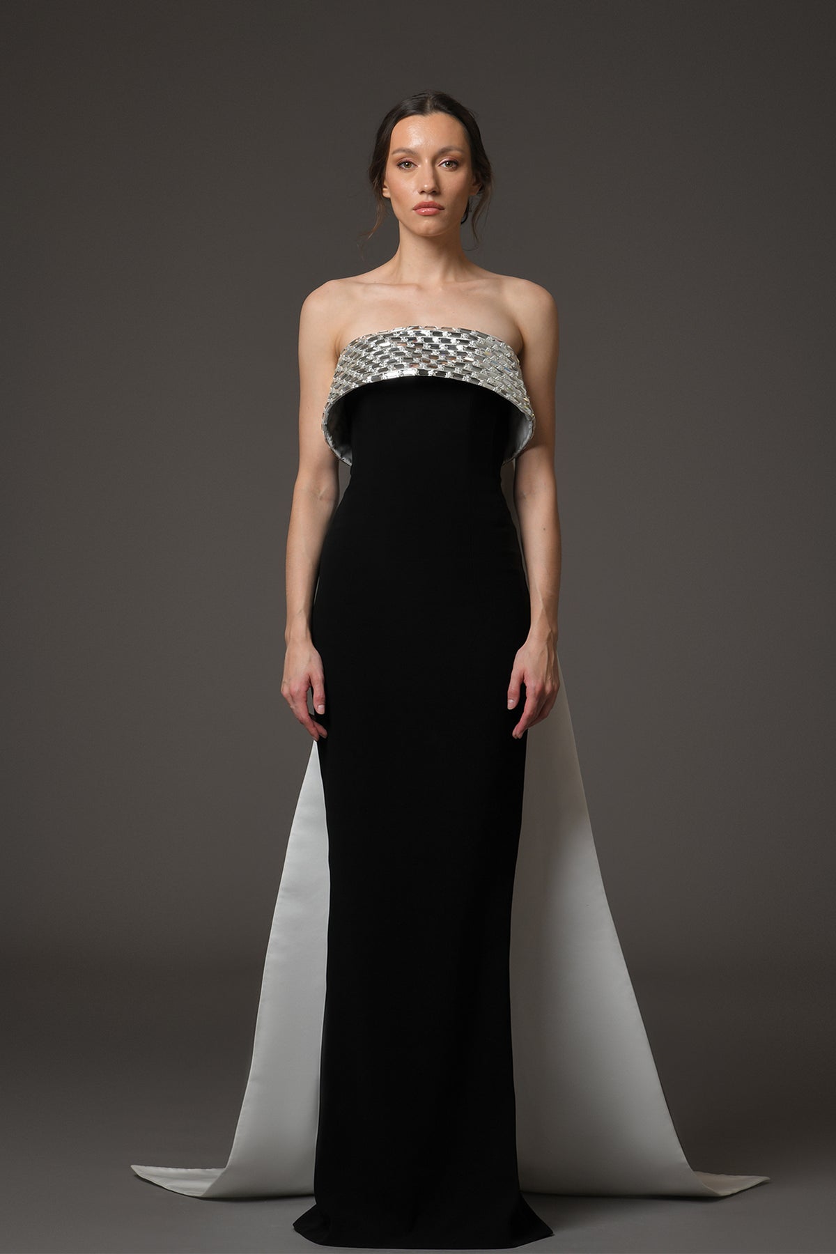 Black and white crêpe strapless long dress. Featuring a silk satin radzimir train. Complemented with baguette embroidery and a center back zipper center back slit.