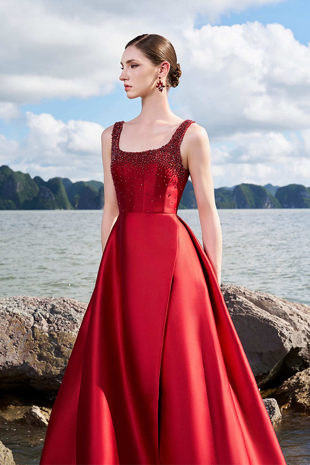Red crepe dress. Featuring a strap with a square neck and a crystal-embellished chest and straps. Complemented with a flared A-line skirt and a hidden tear-drop zipper at the back.
