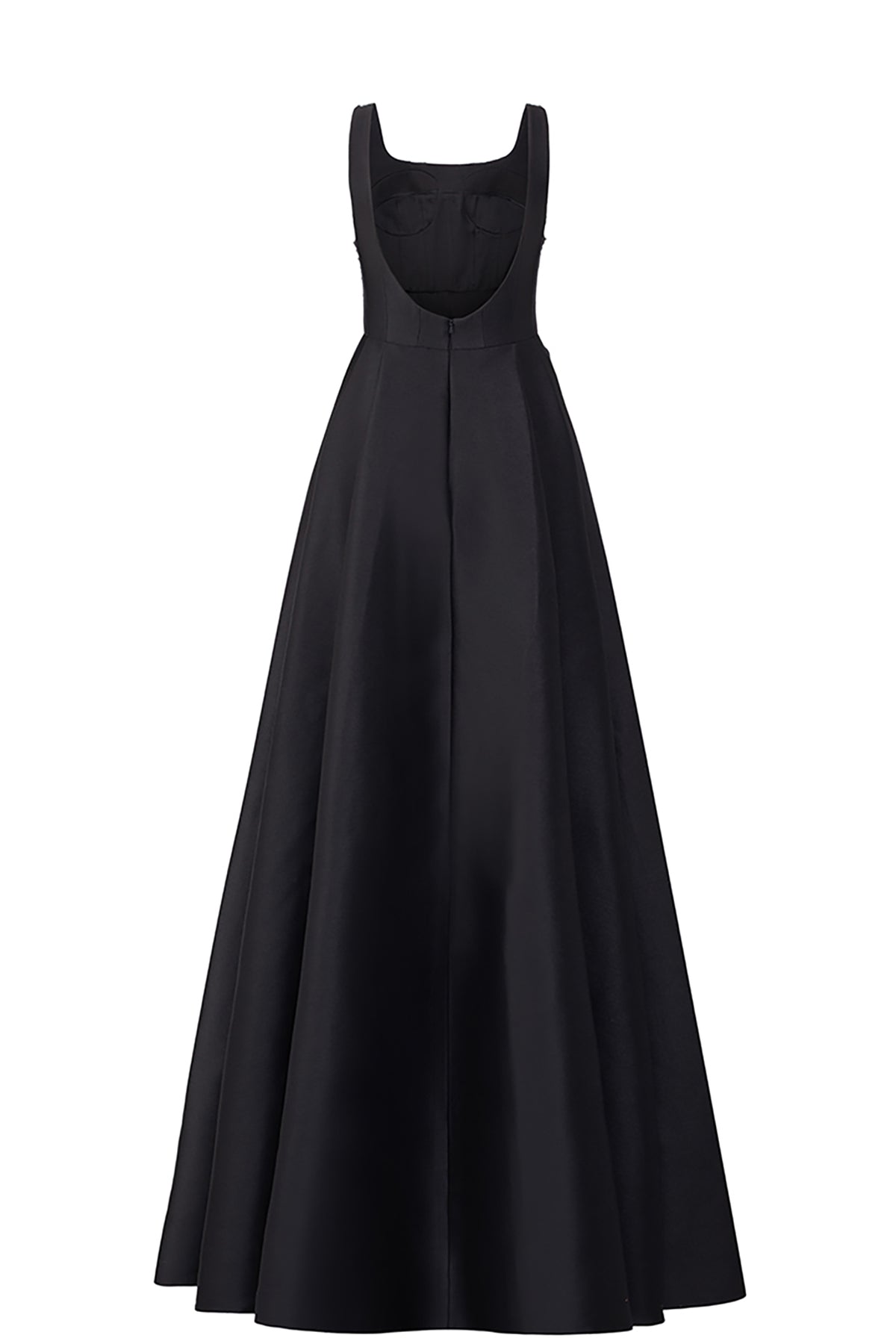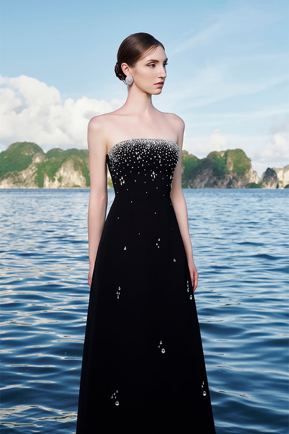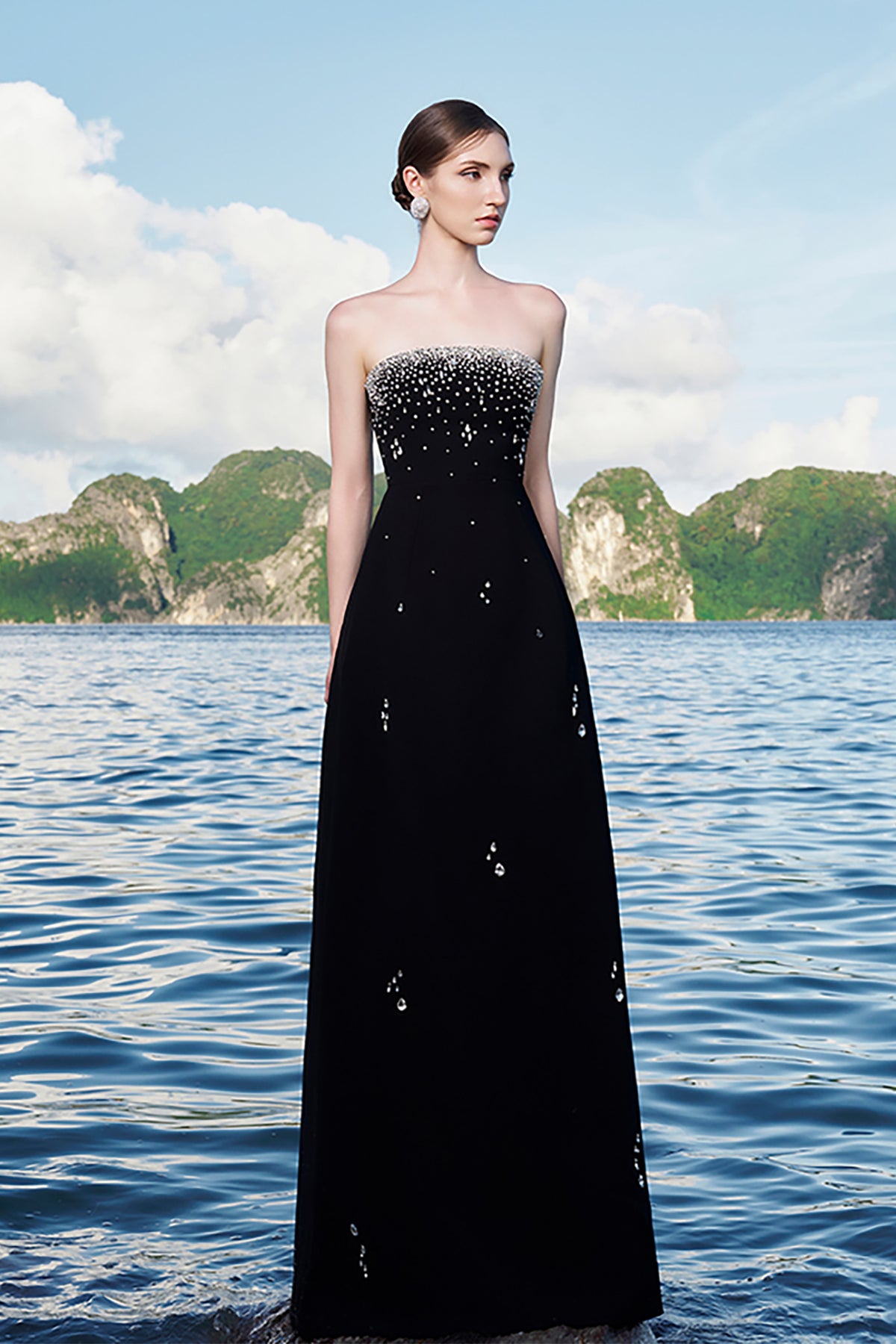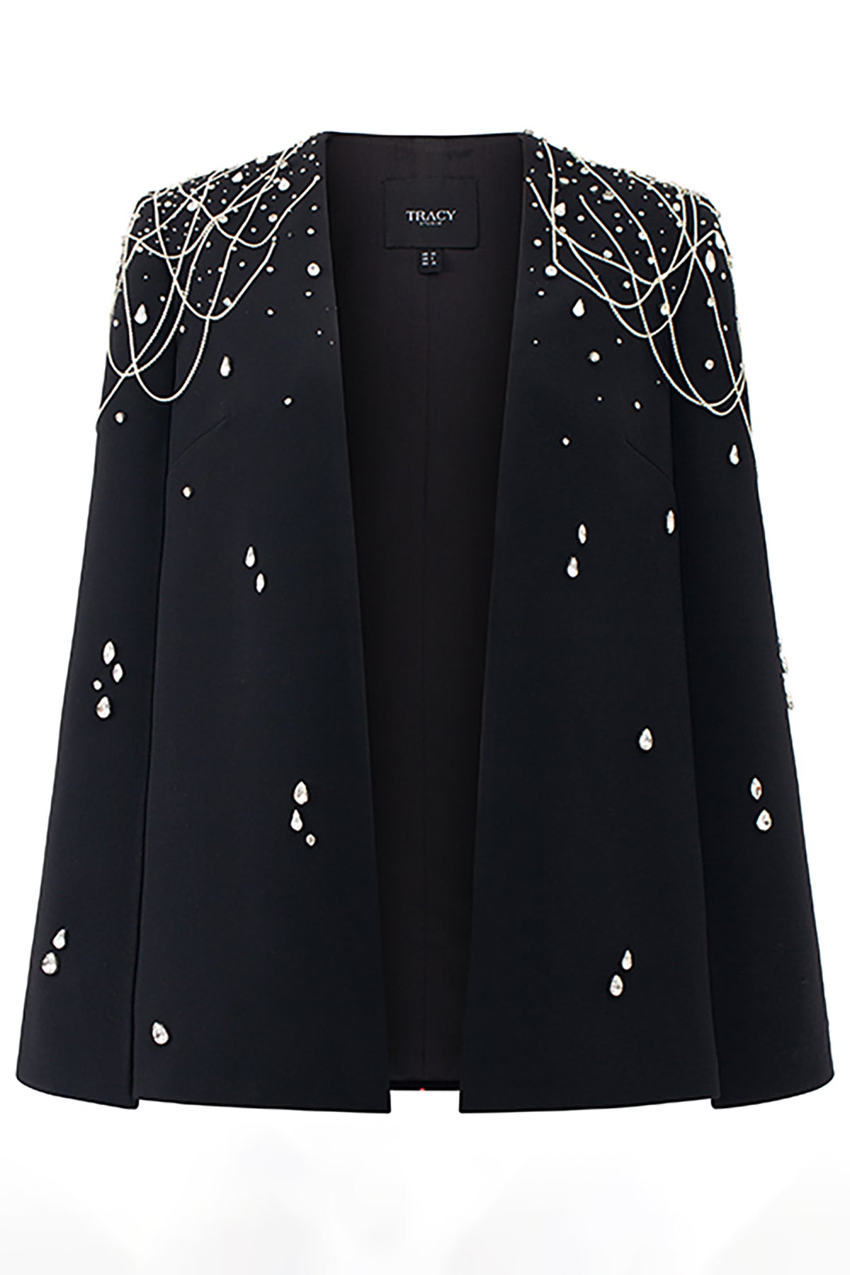 Black velvet satin dress. Featuring a short cape form with a crystal-embellished. Complemented with crystal strings at the shoulder, padded shoulder and sleeves slit.