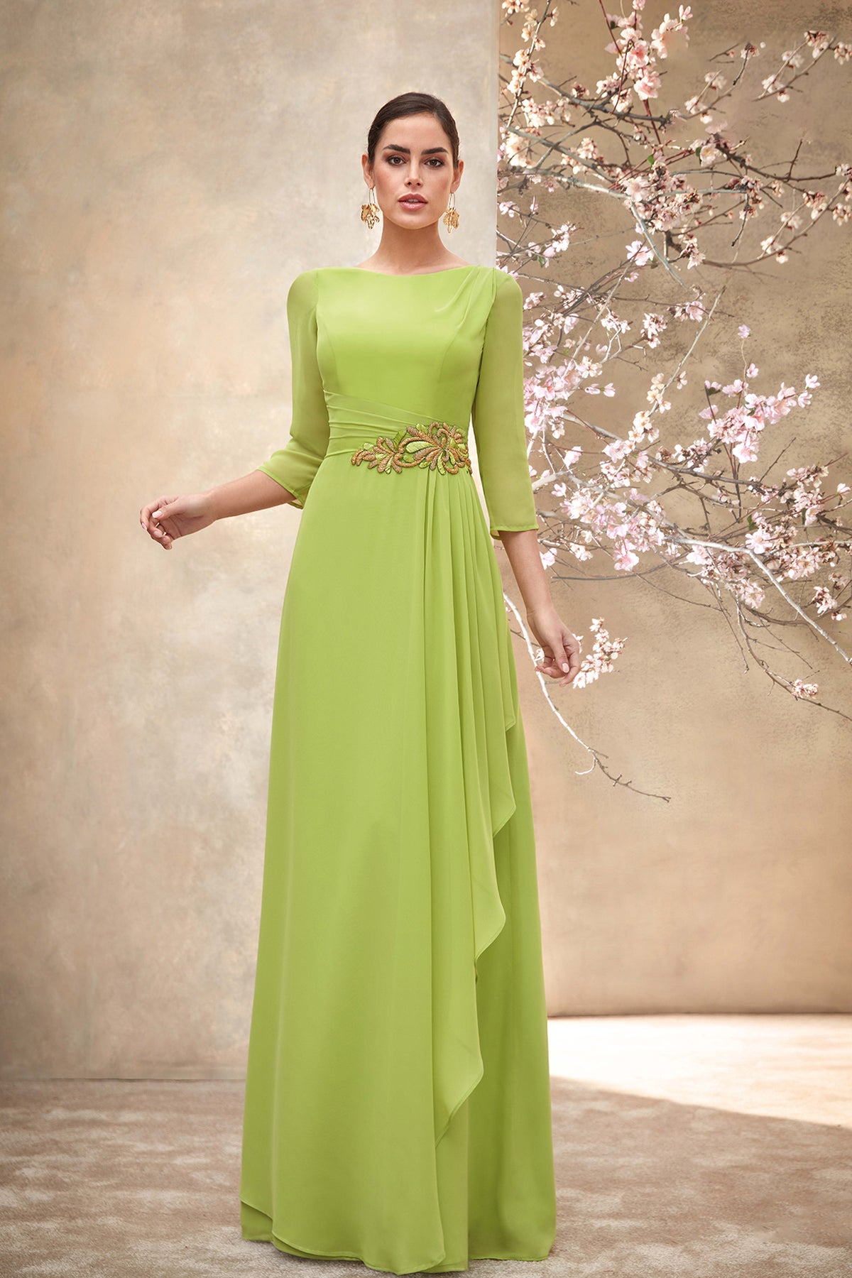 Light green flowing chiffon dress. Featuring a boat neckline with pleats at the shoulder with wide pleated belt in the same fabric narrowing to a matching jewelled appliqué. Complemented with an a-line skirt with a gathered detail at one hip.