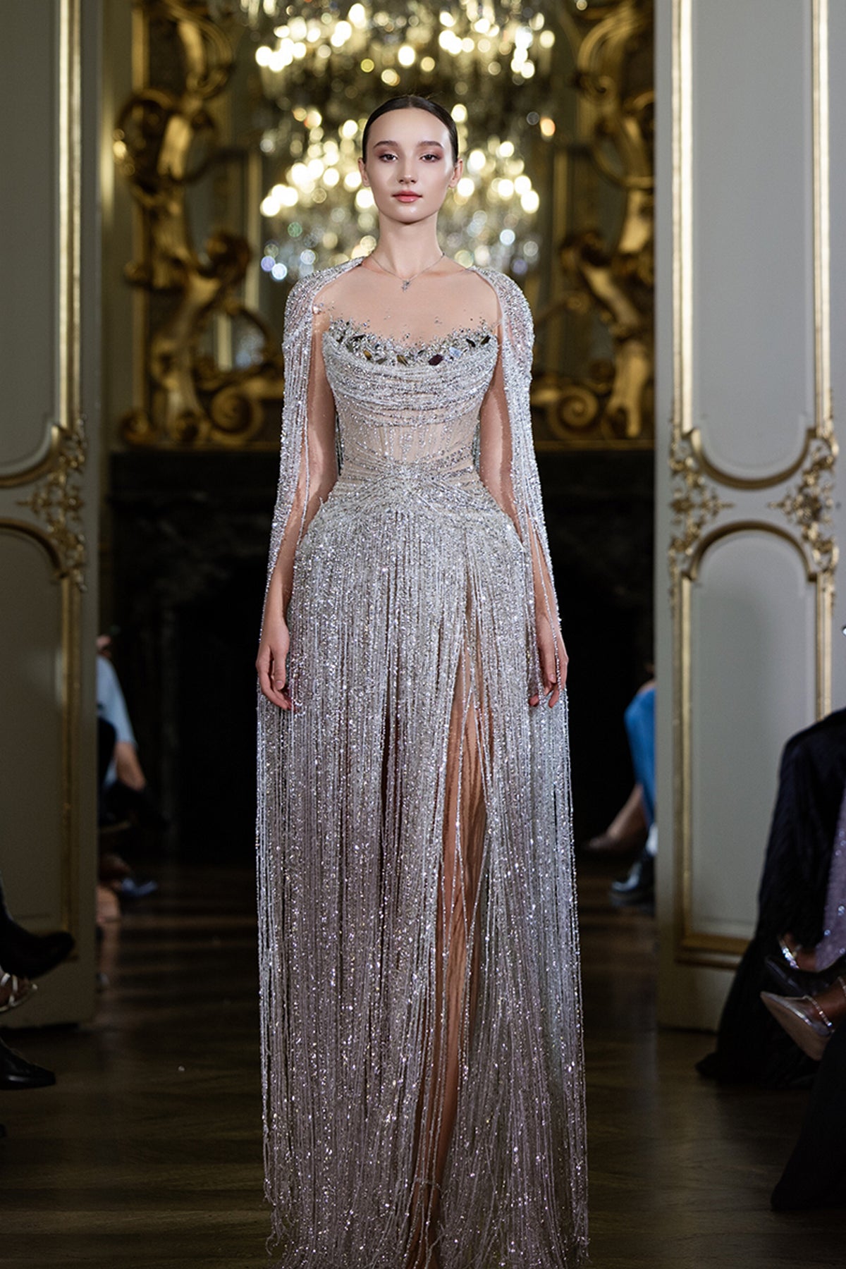 Silver cape with a floor-length dress. Featuring a curved sweetheart neckline with an A-line skirt that falls smoothly from the waist. Complemented with a fringe, a ripple, and vertical beading fringe that creates a shimmering cascade from the bodice to the hem.