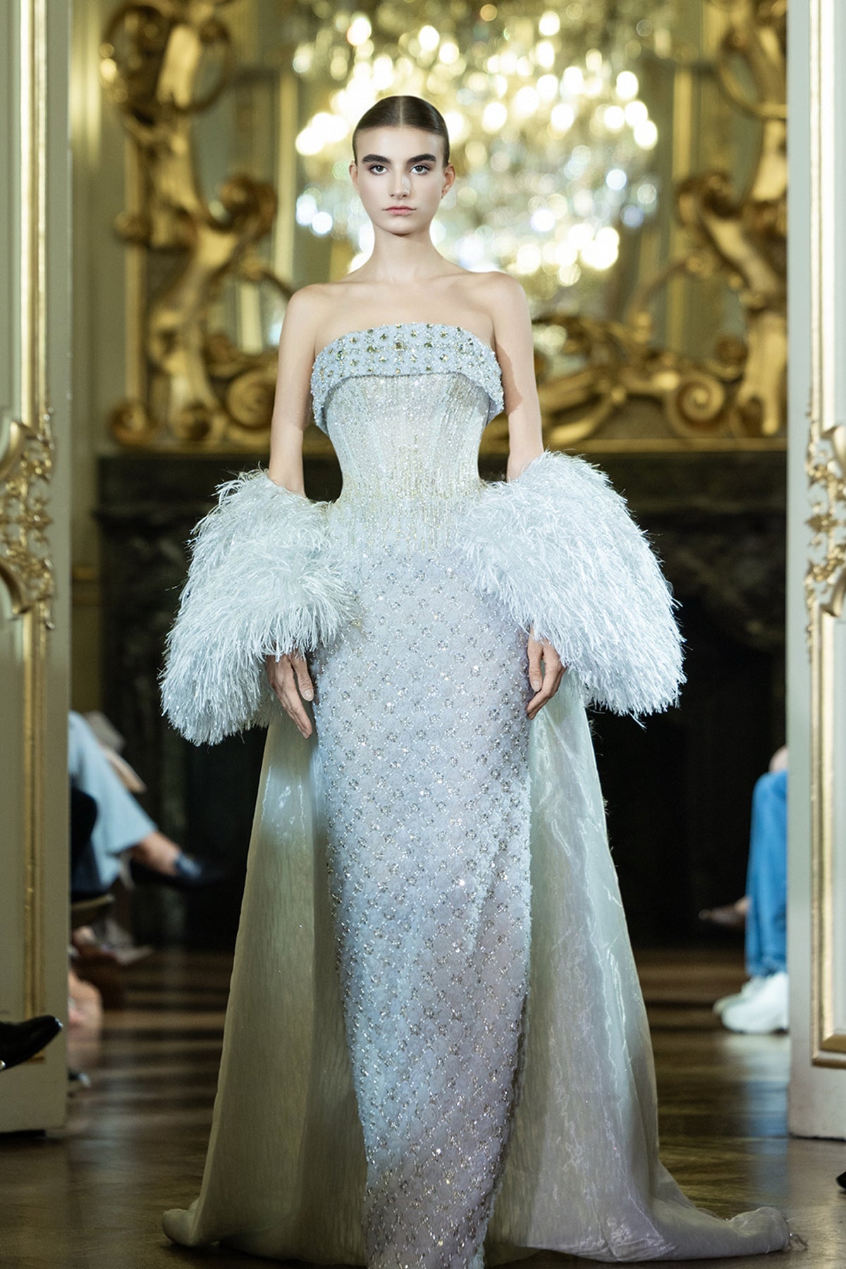 White blue column sequins floor-length dress. Featuring a strapless straight-across neckline that sits snugly along the bust. Complemented with a tightly fitted bodice that contours the torso.