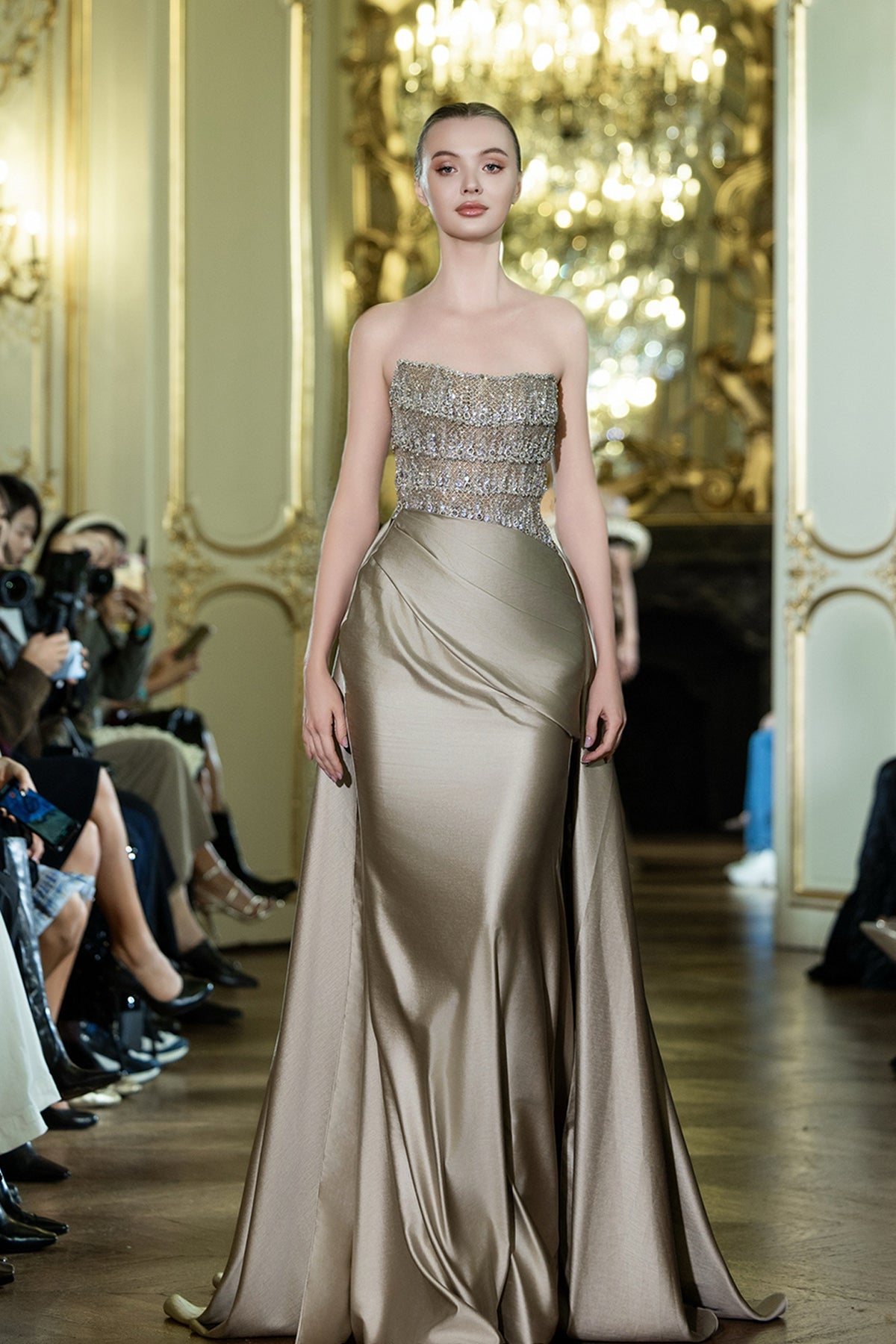 Champagne mermaid satin floor-length dress. Featuring a unique design detachable tail dress with a strapless sweetheart neckline that skims the bust with a gentle heart-shaped dip. Complemented with a structured bodice embellished with multiple horizontal sequin embellished bands.