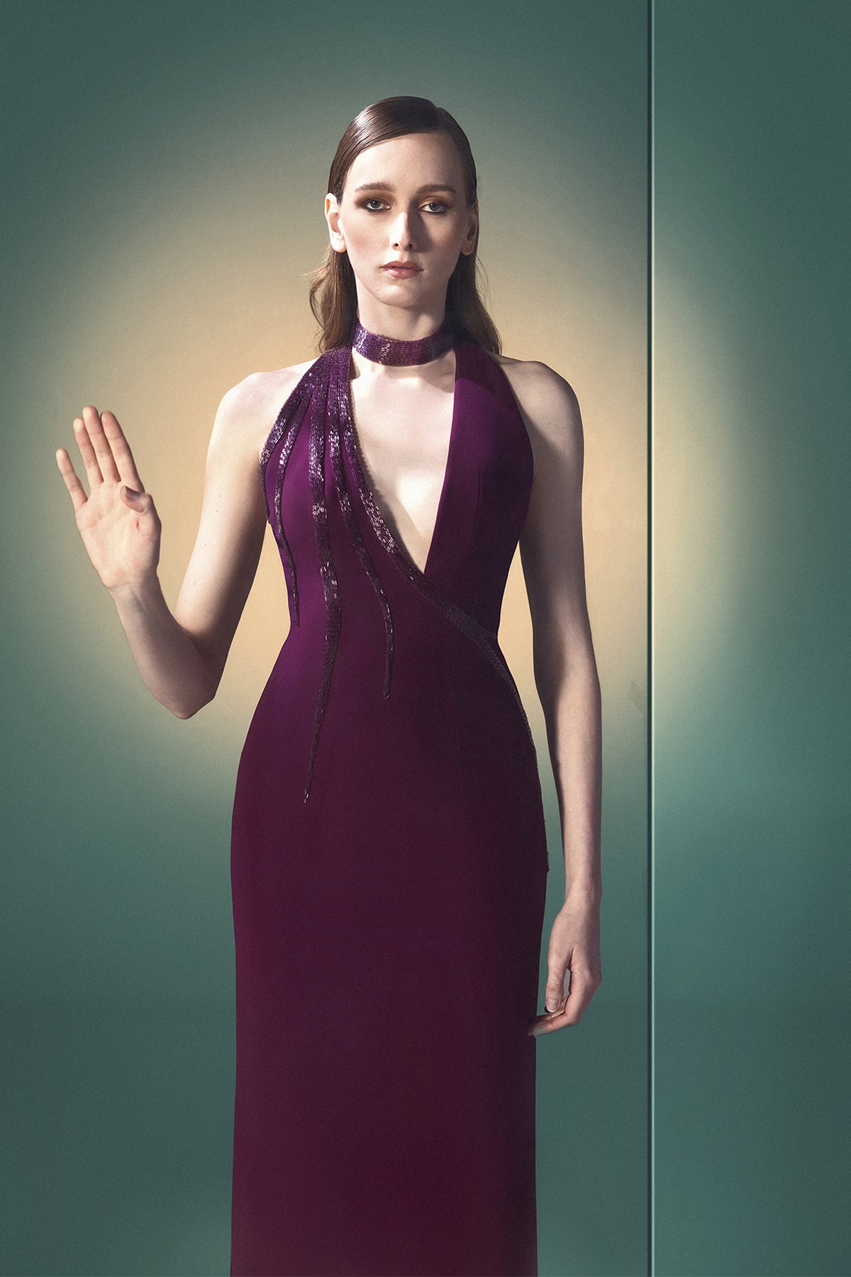 Rich burgundy halterneck crepe dress. Featuring a classic A-line silhouette, which is fitted at the bodice and gradually flares out from the waist.