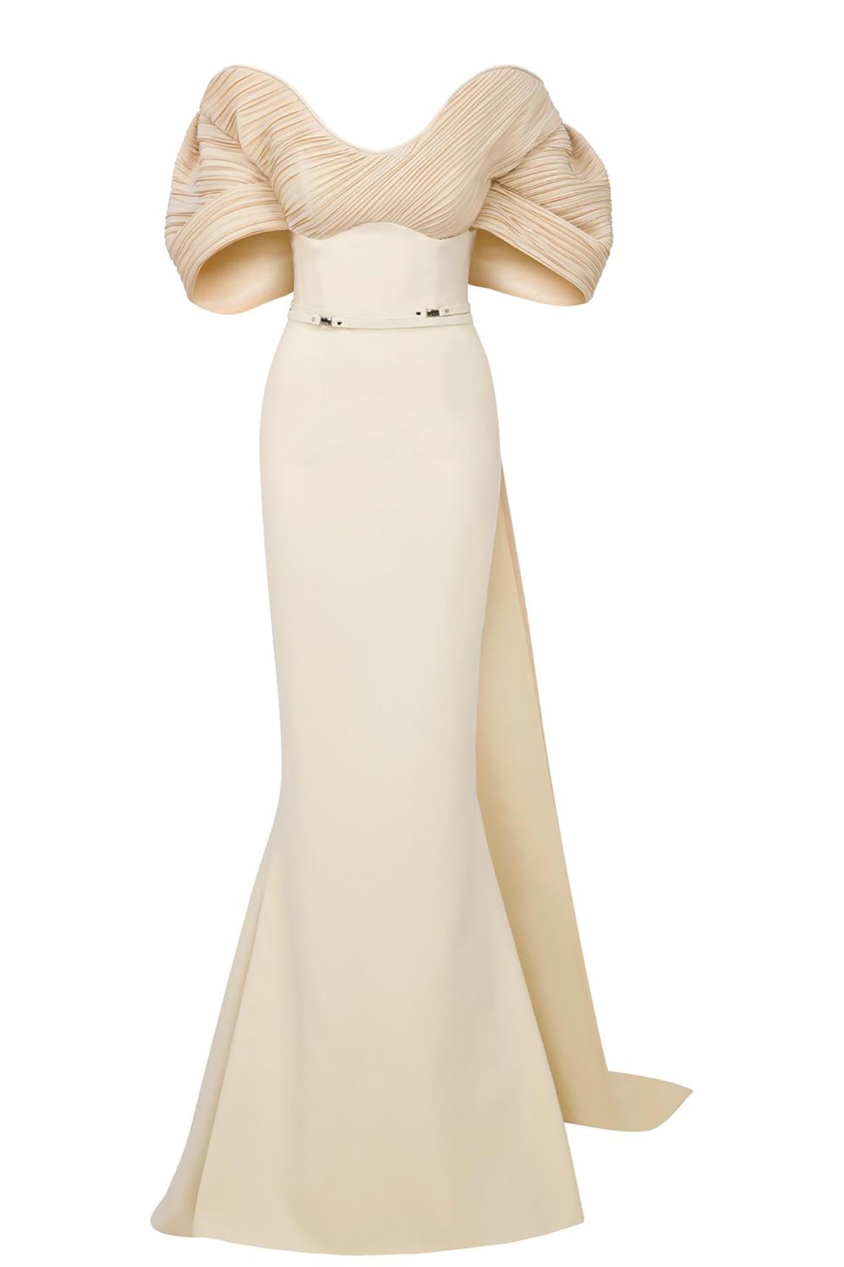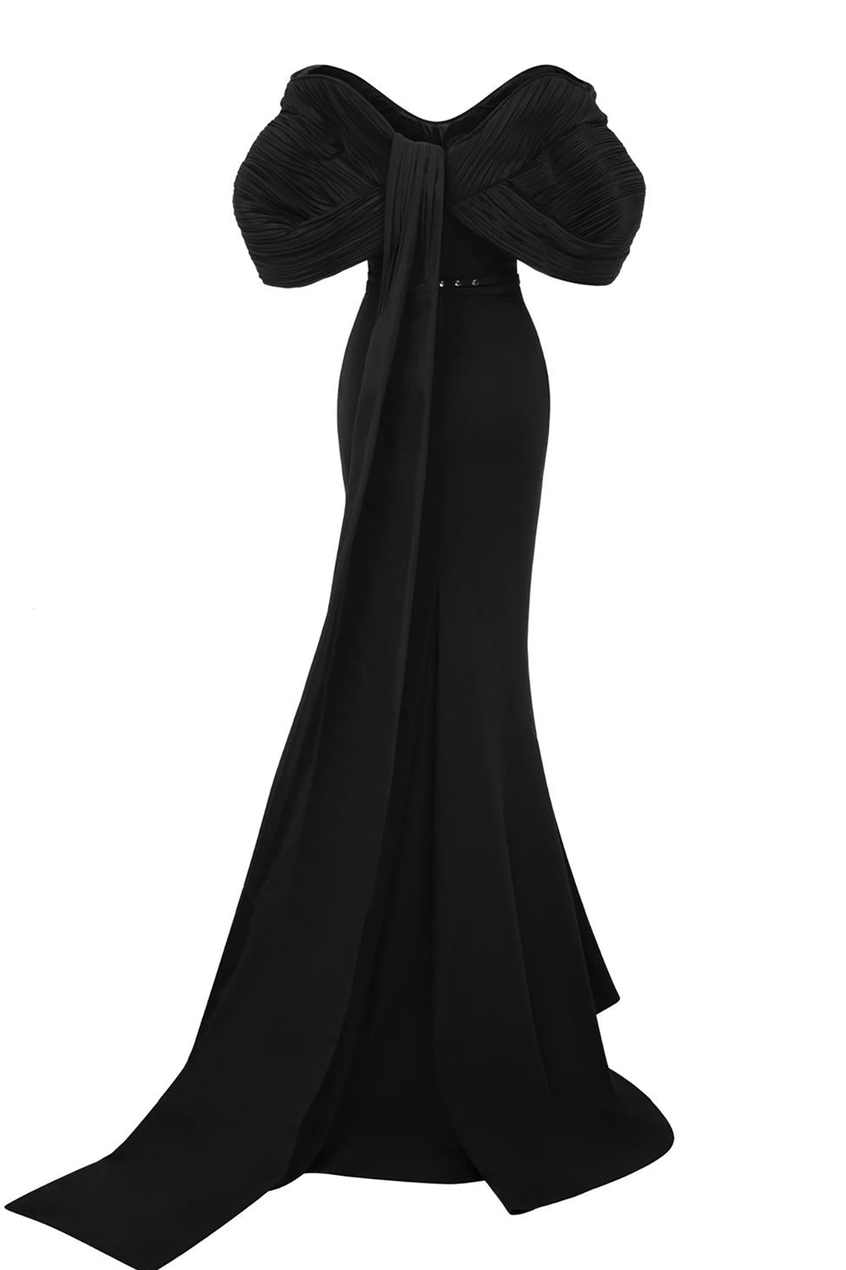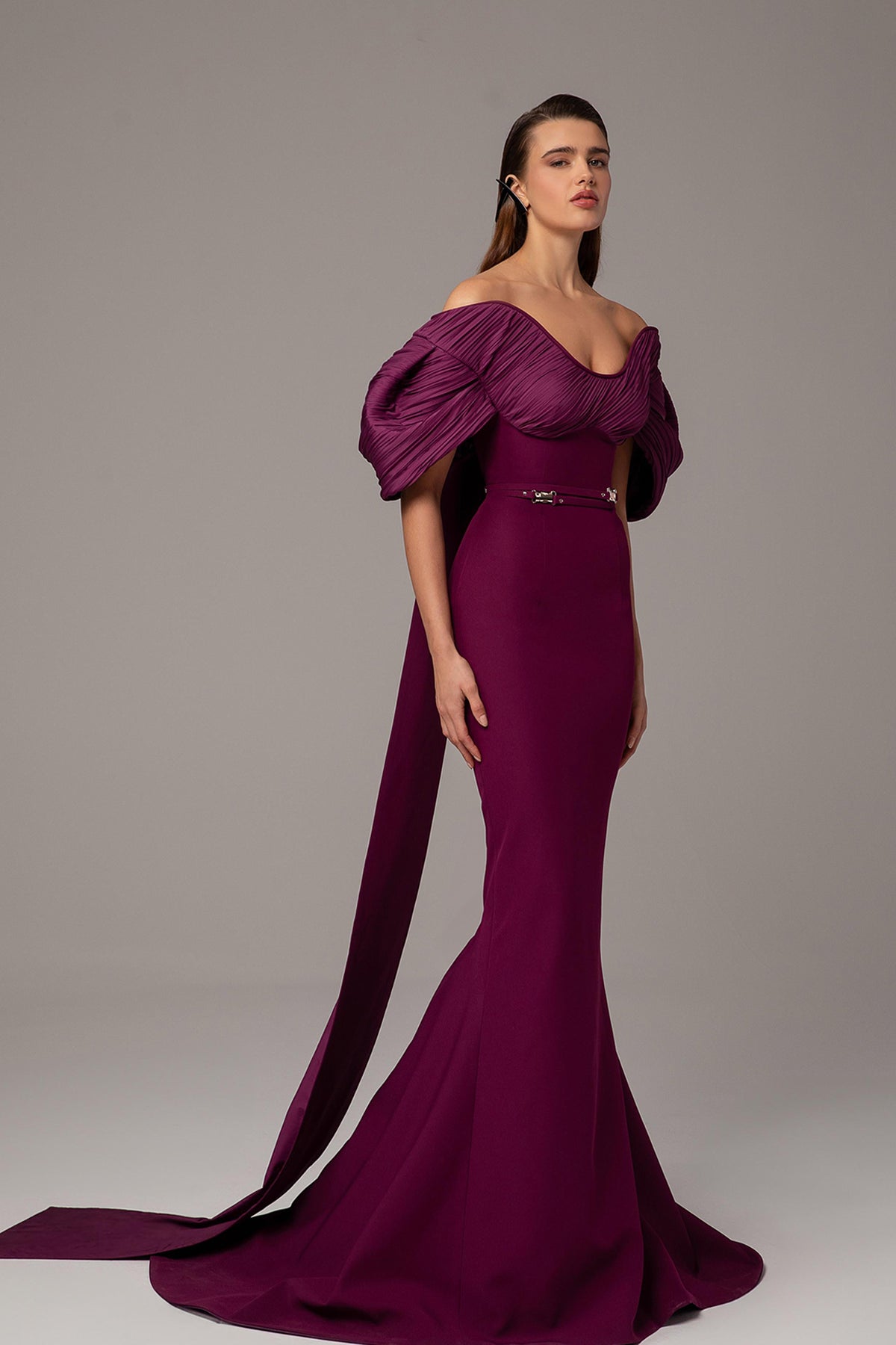 Burgundy mermaid long dress. Featuring an off-the-shoulder minimal embellishment beyond the architectural structure, lines and silhouette to carry the visual impact.