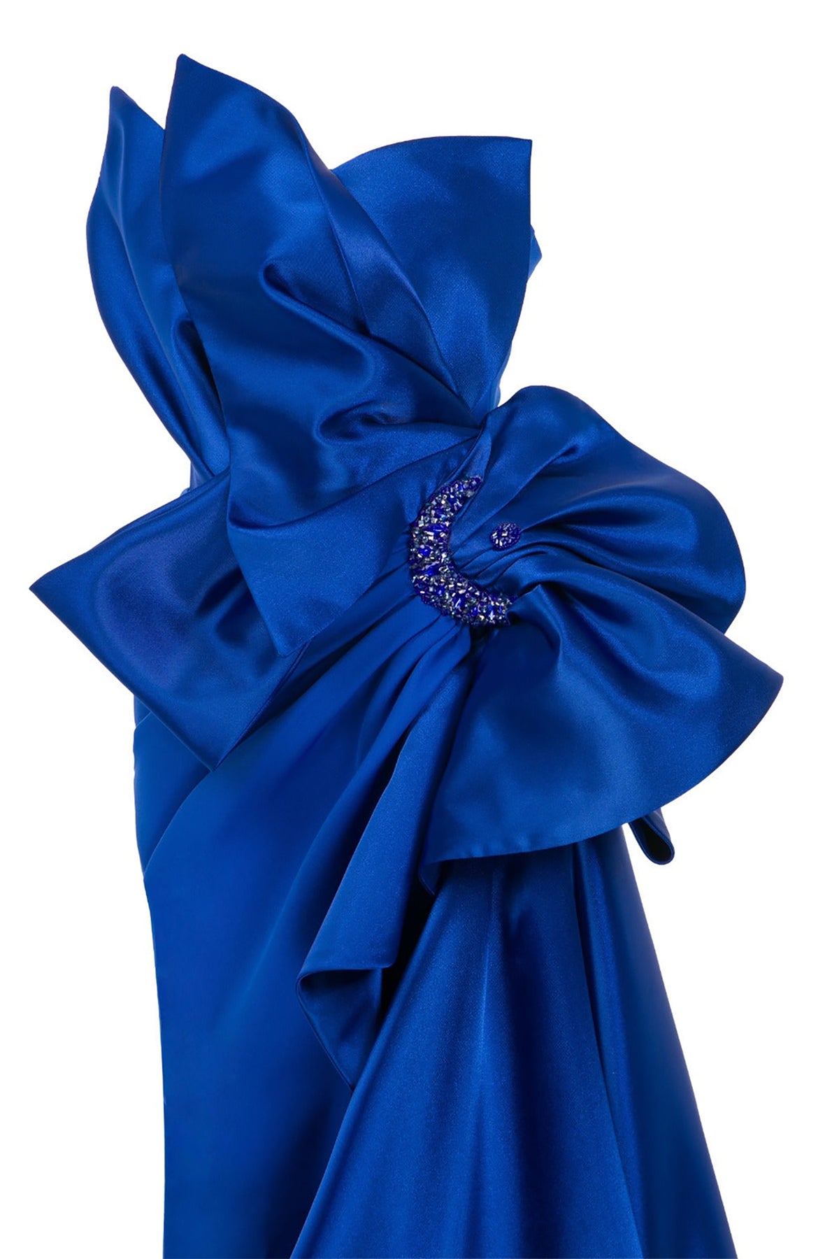 Purple long dress. Featuring a crepe broquard with a strapless upper cut and an embellished with drapes on the bust and waist. Complemented with a stone embellishments on the waist and built-in belt with roman classic lower cut with a slit. Completed with a fit to the body.