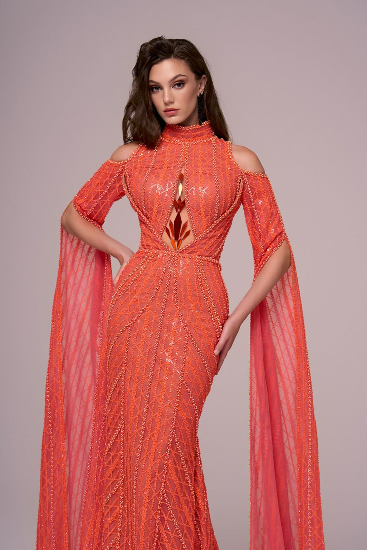 Coral pink long dress. Featuring a fitted mermaid silhouette that hugs the body through the waist and hips before flaring. Complemented with transitions into off-the-shoulder cutouts, revealing the collarbones and shoulders with a subtle.