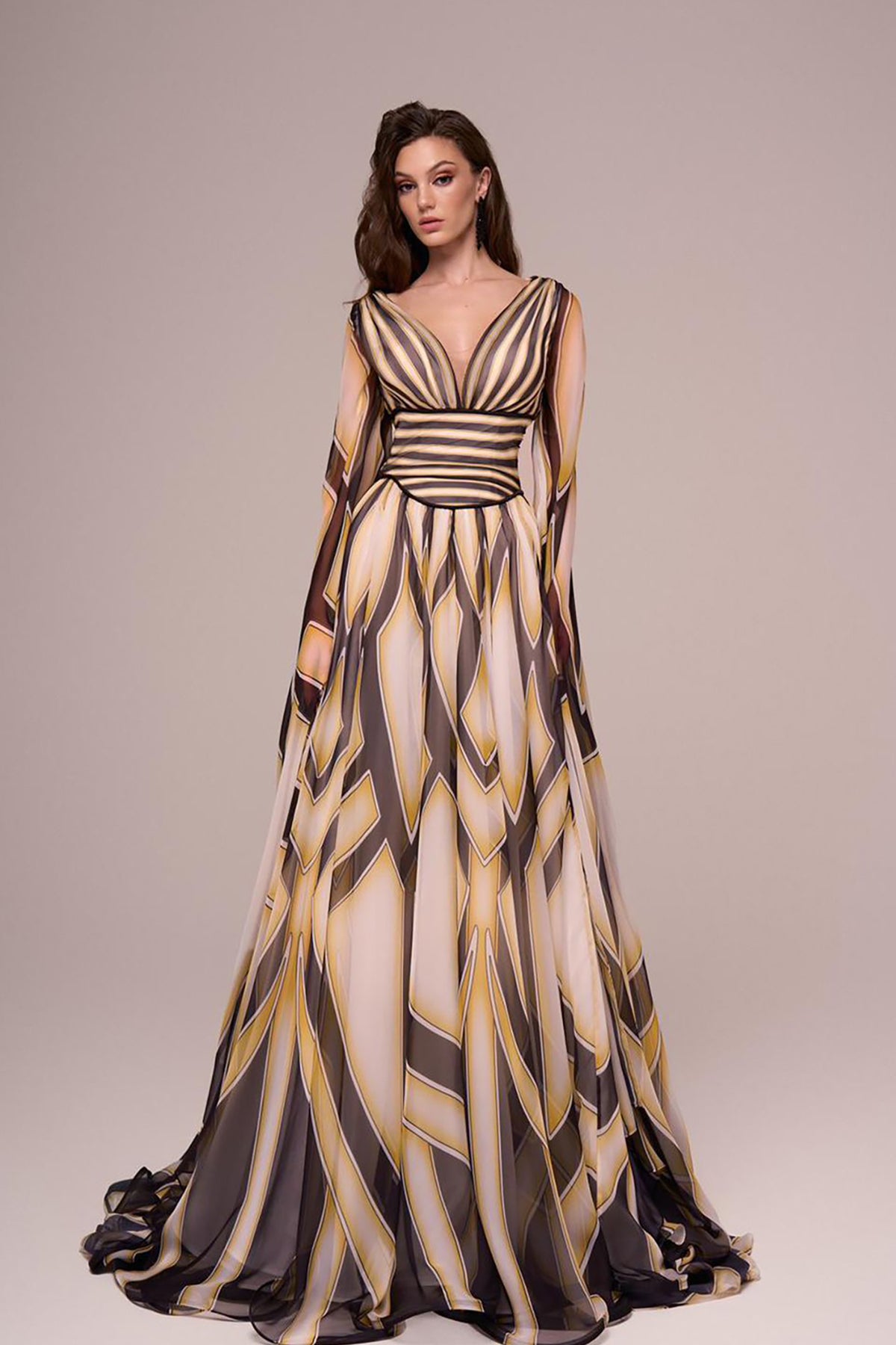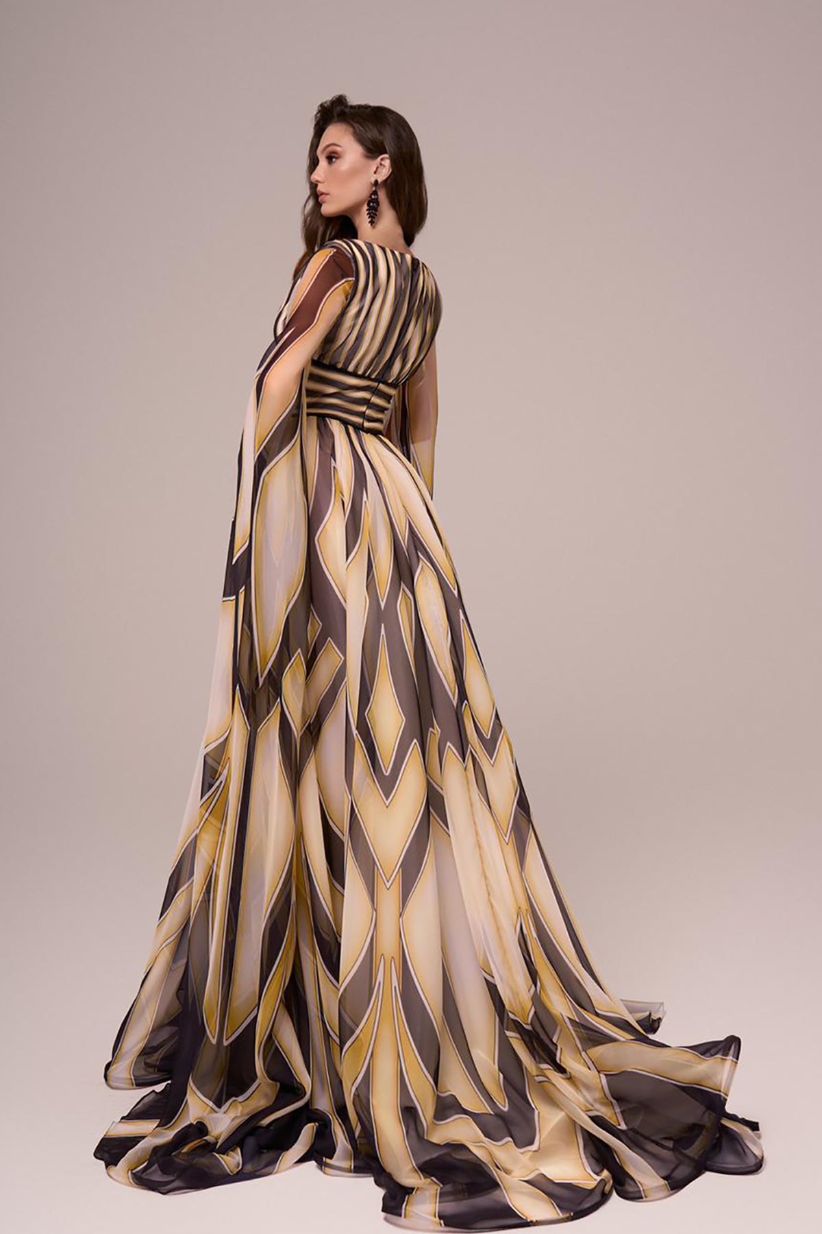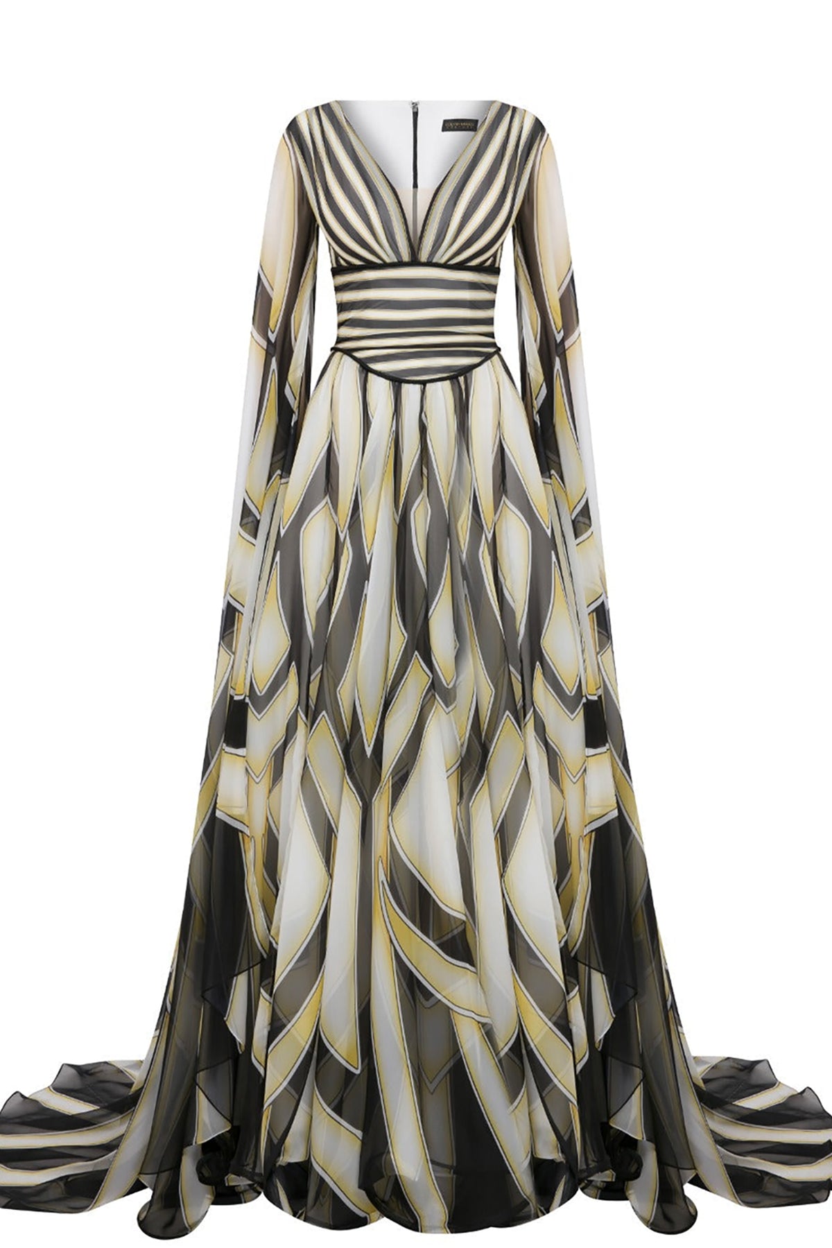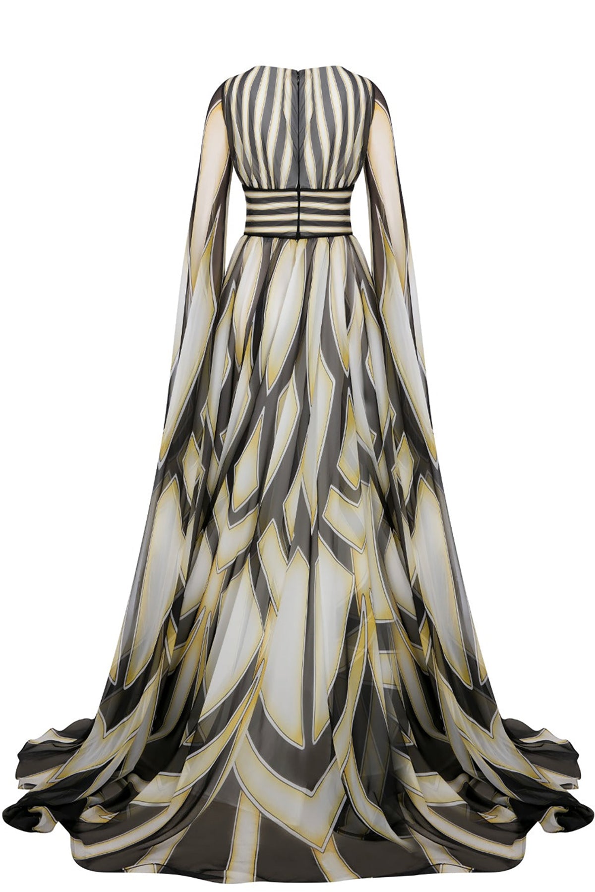Multicolor A-line long dress. Featuring a cape-like drape and a plunging V-neckline.