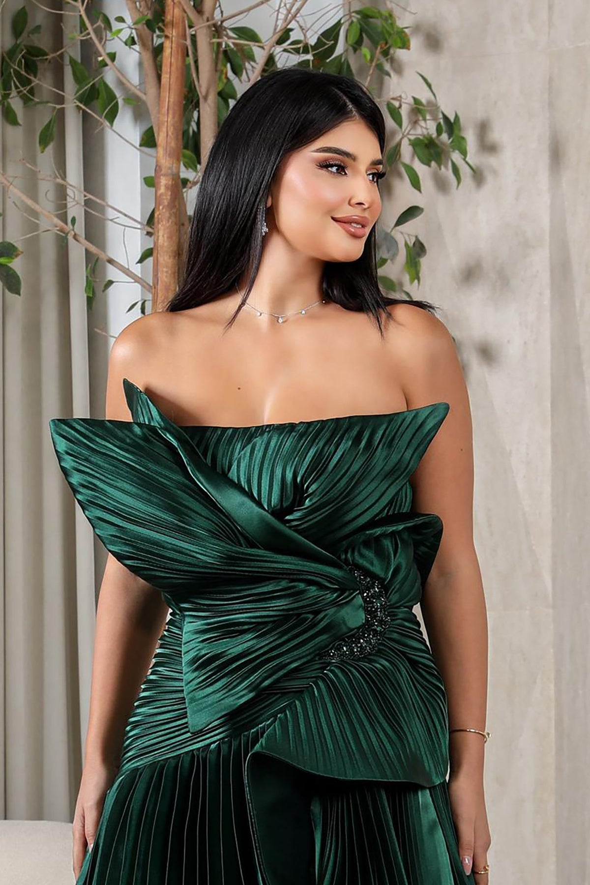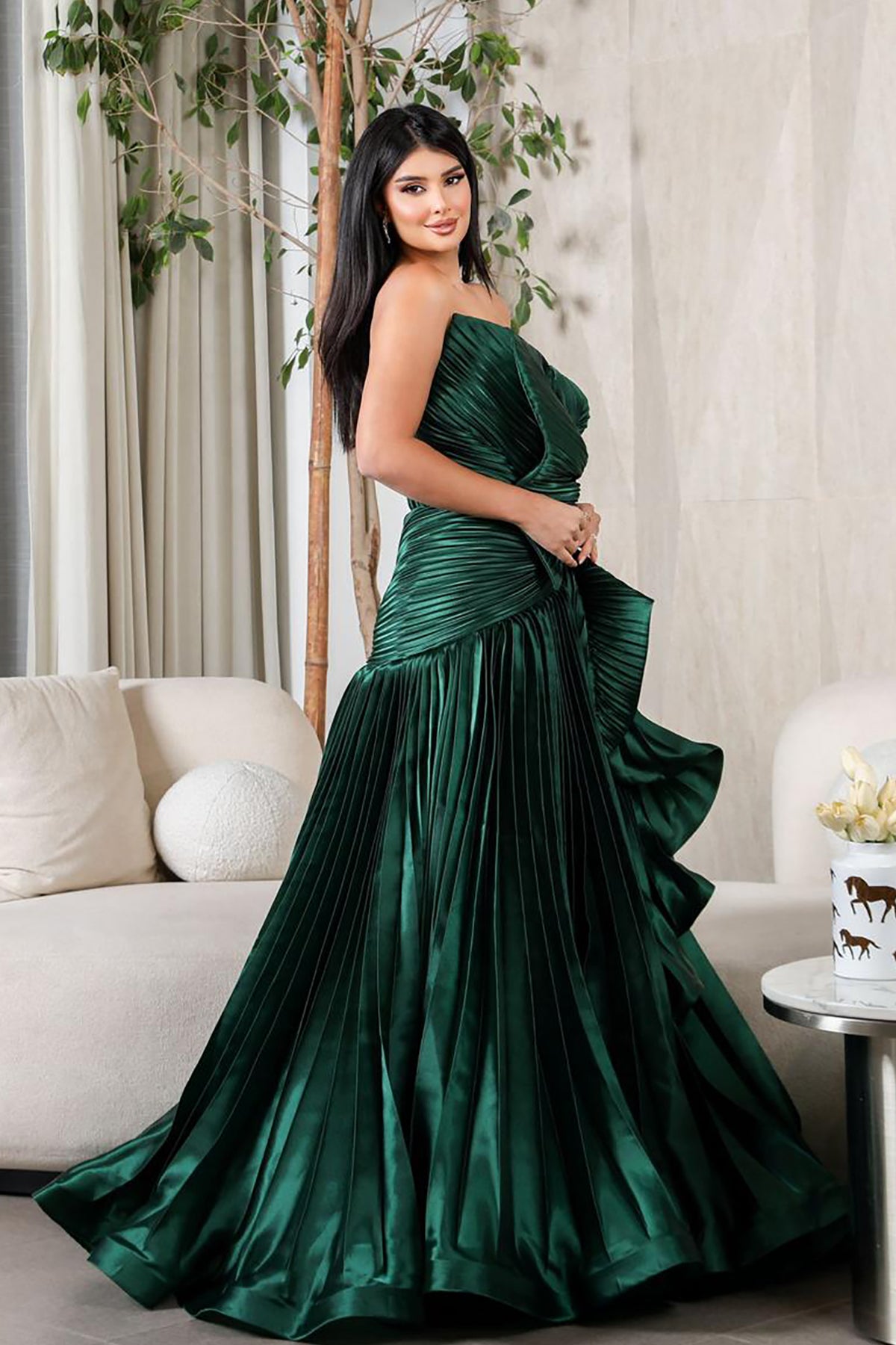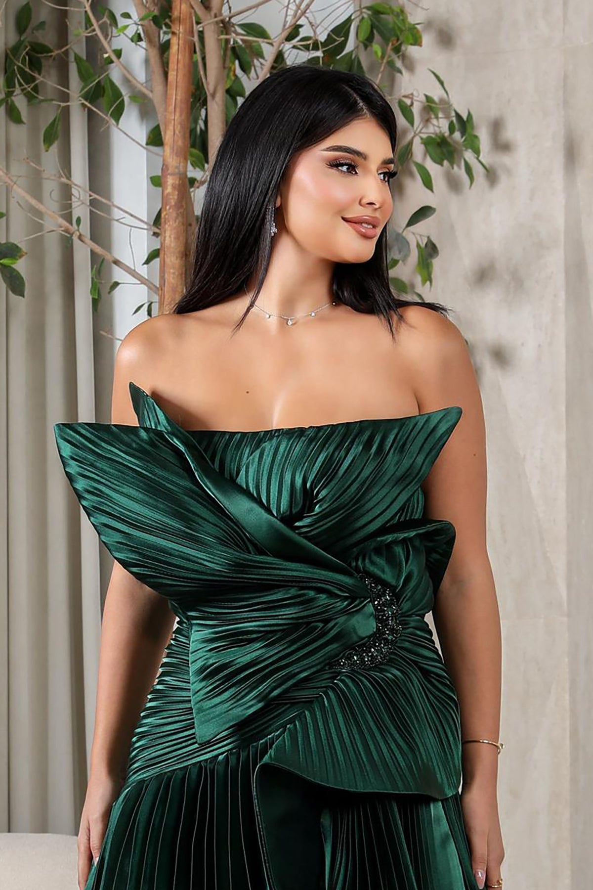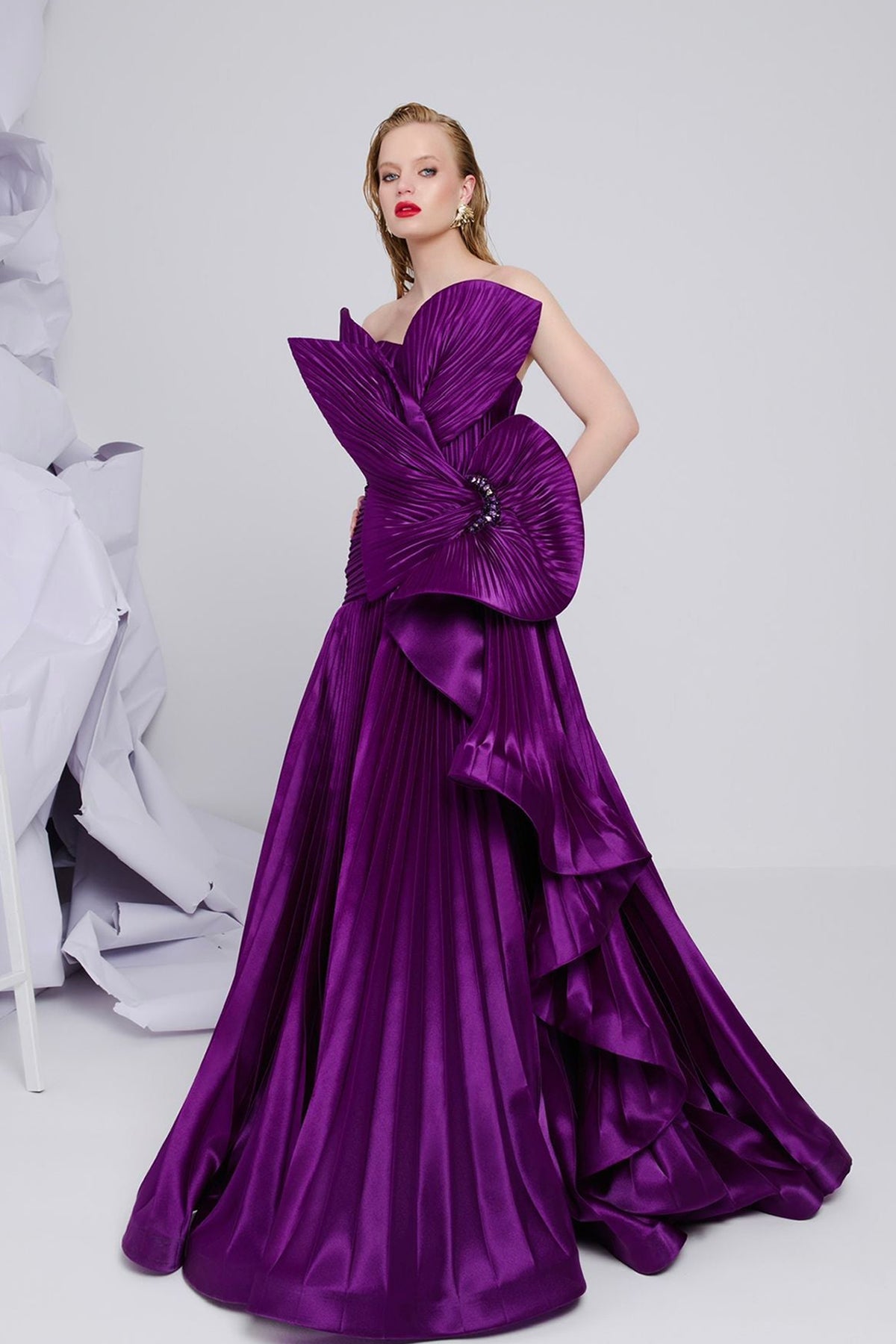 Purple long dress. featuring an organza with a plissé rhythm and a strapless upper cut. Complemented with a flared A-Line skirt and embellished with drapes on bust and waist. Completed with an embellished with stones on the waist side.