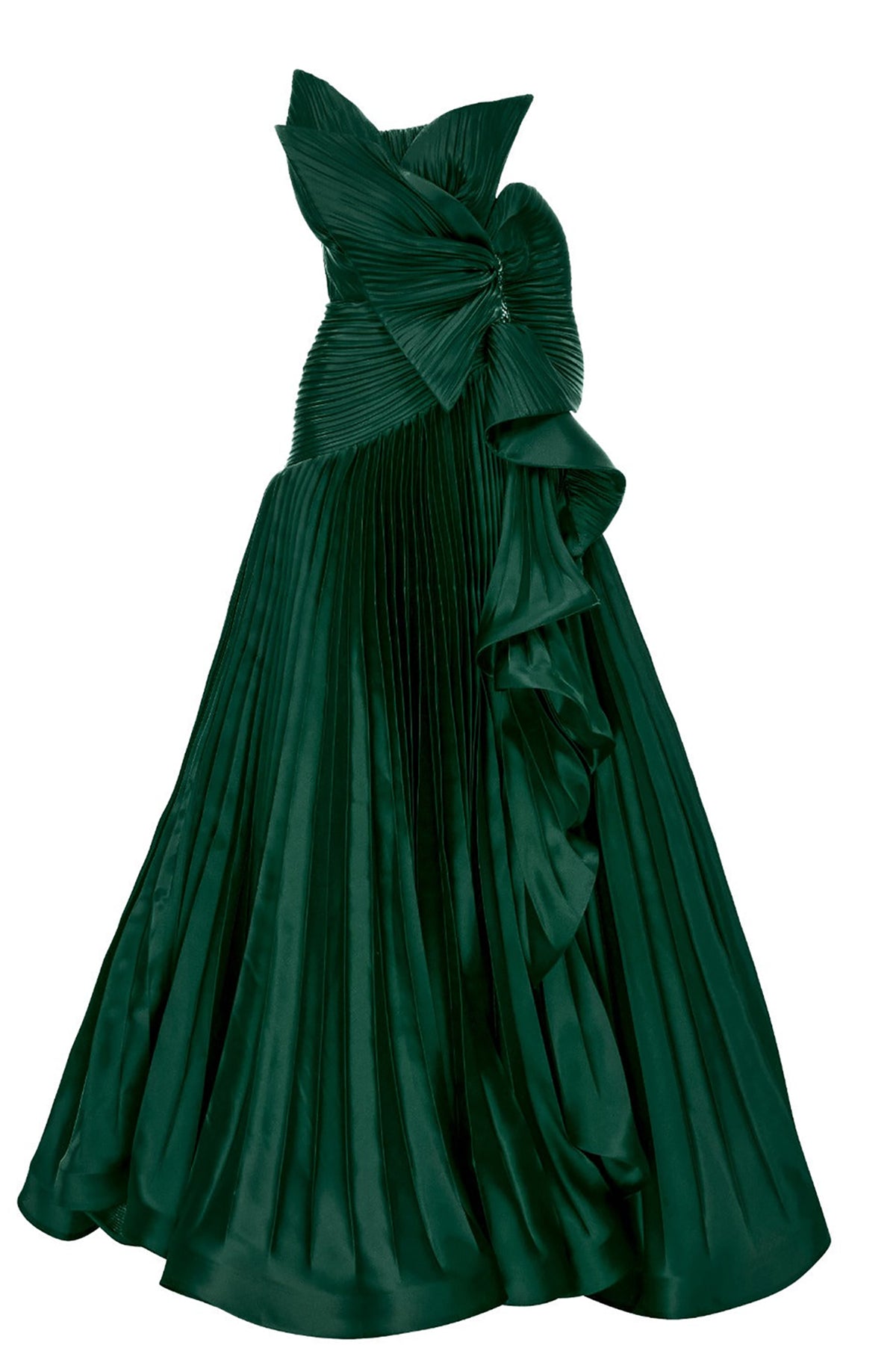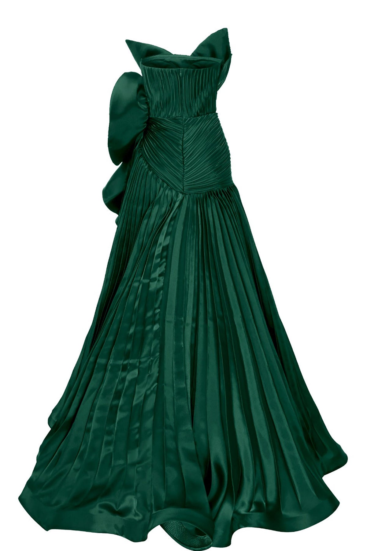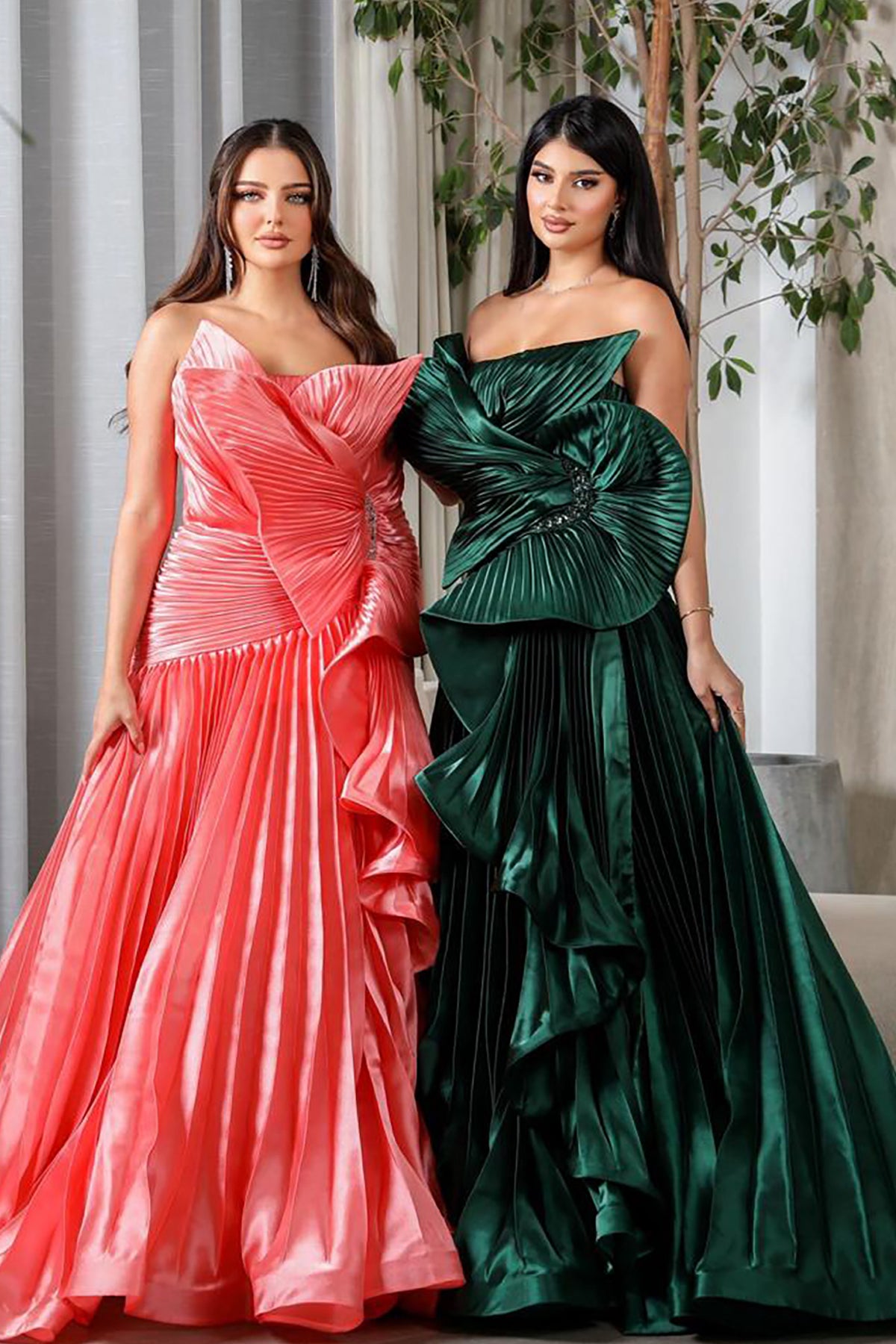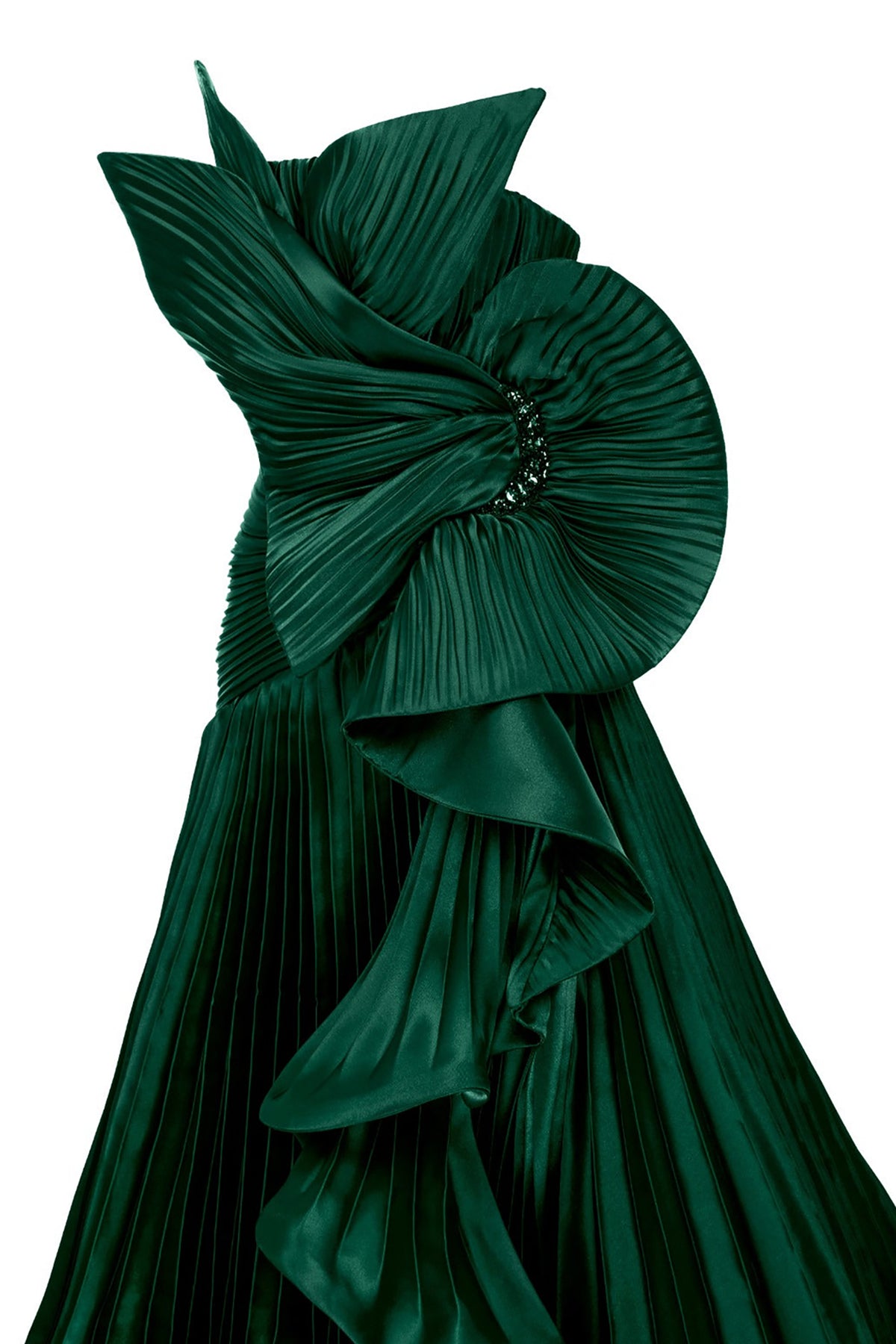 Purple long dress. featuring an organza with a plissé rhythm and a strapless upper cut. Complemented with a flared A-Line skirt and embellished with drapes on bust and waist. Completed with an embellished with stones on the waist side.