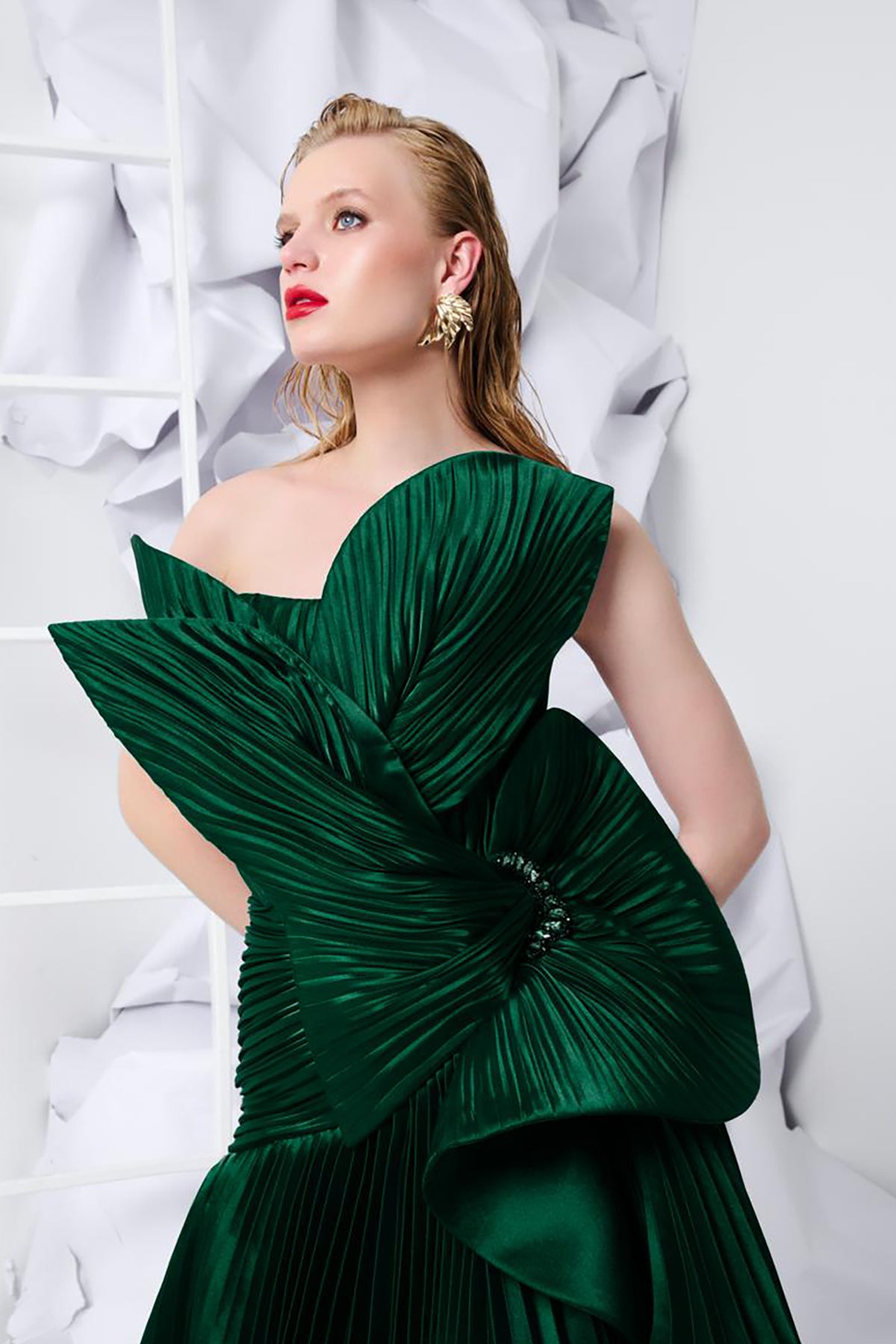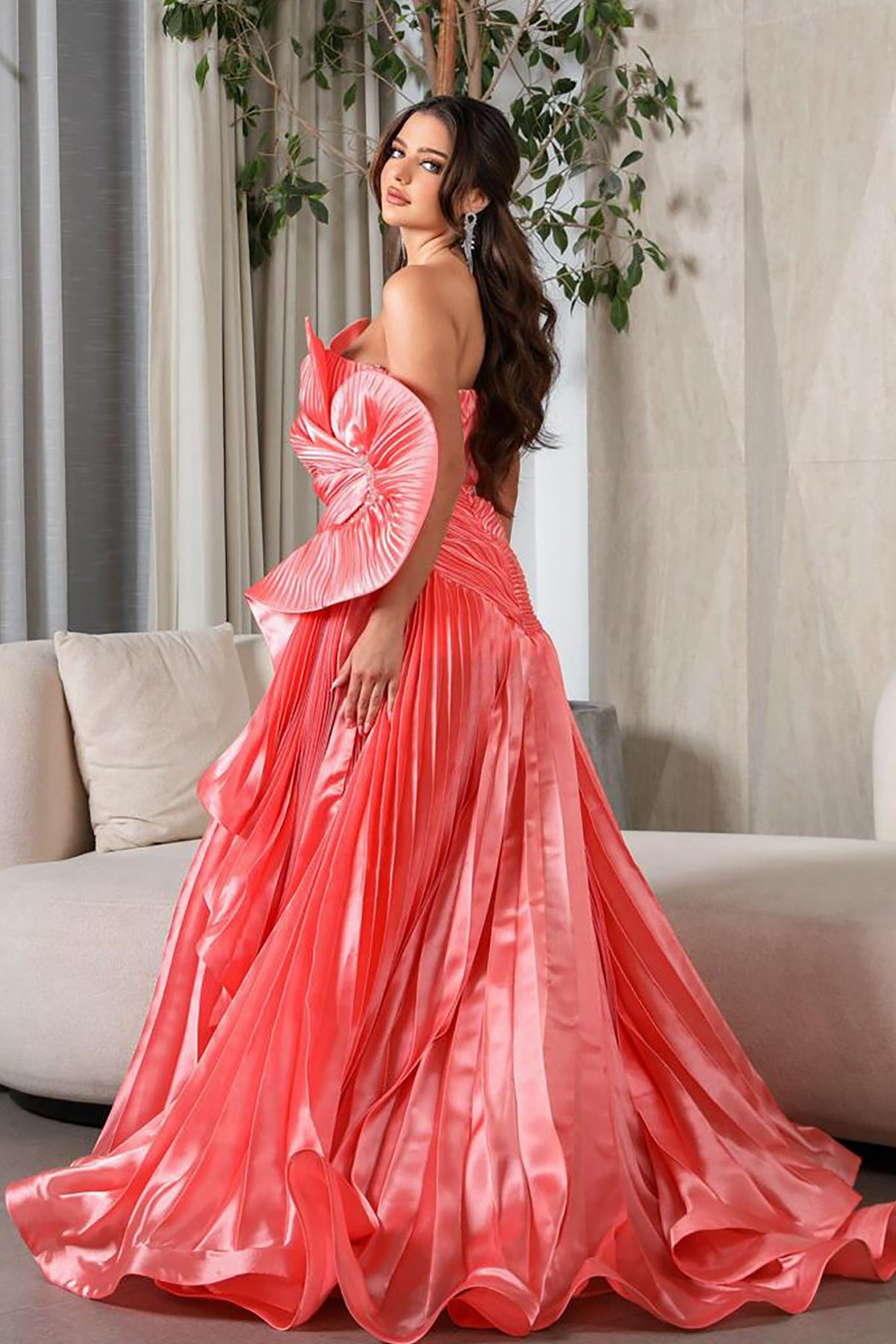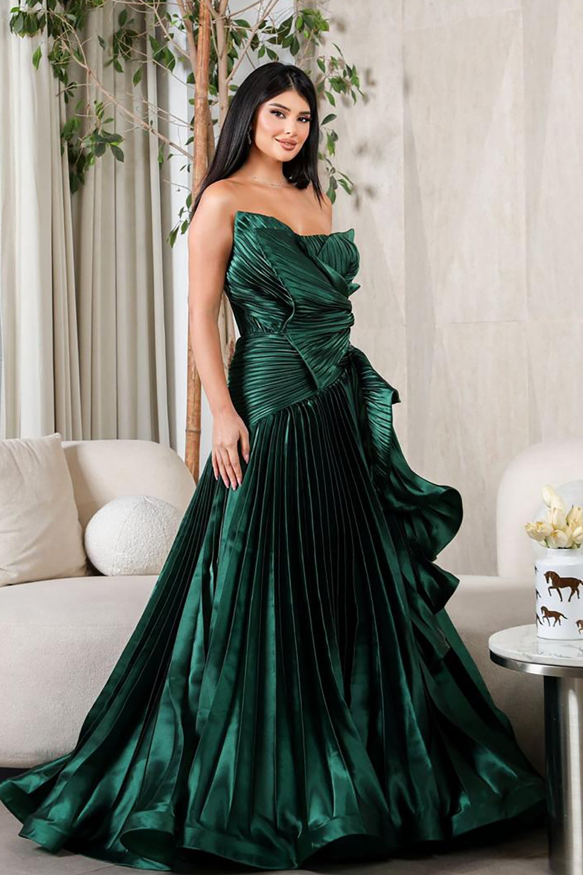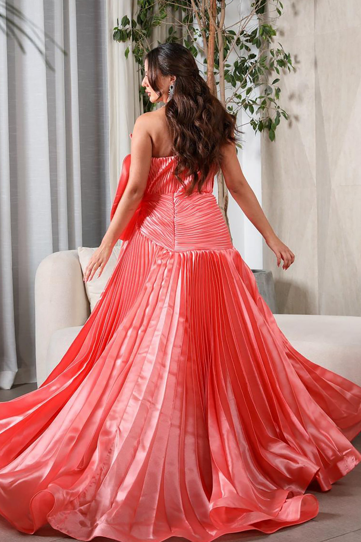 Purple long dress. featuring an organza with a plissé rhythm and a strapless upper cut. Complemented with a flared A-Line skirt and embellished with drapes on bust and waist. Completed with an embellished with stones on the waist side.