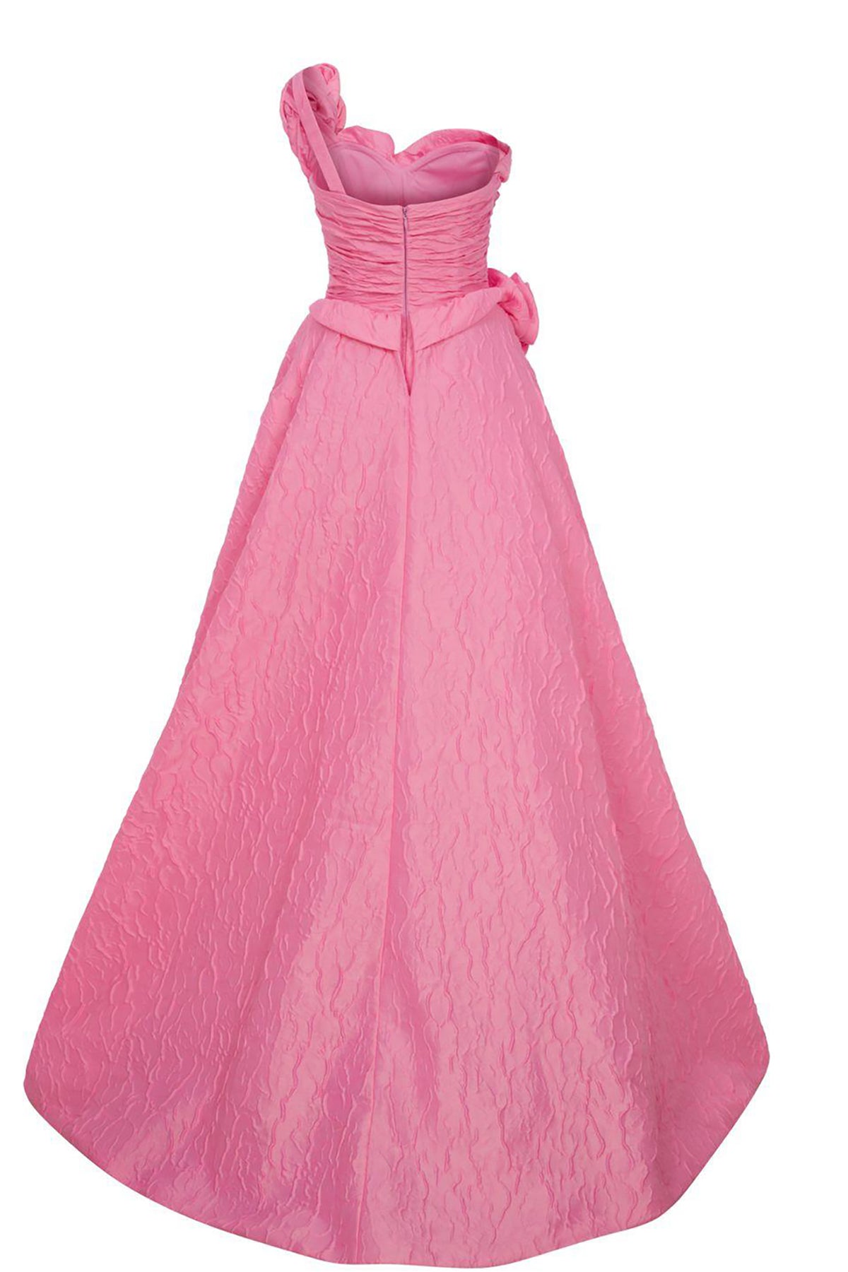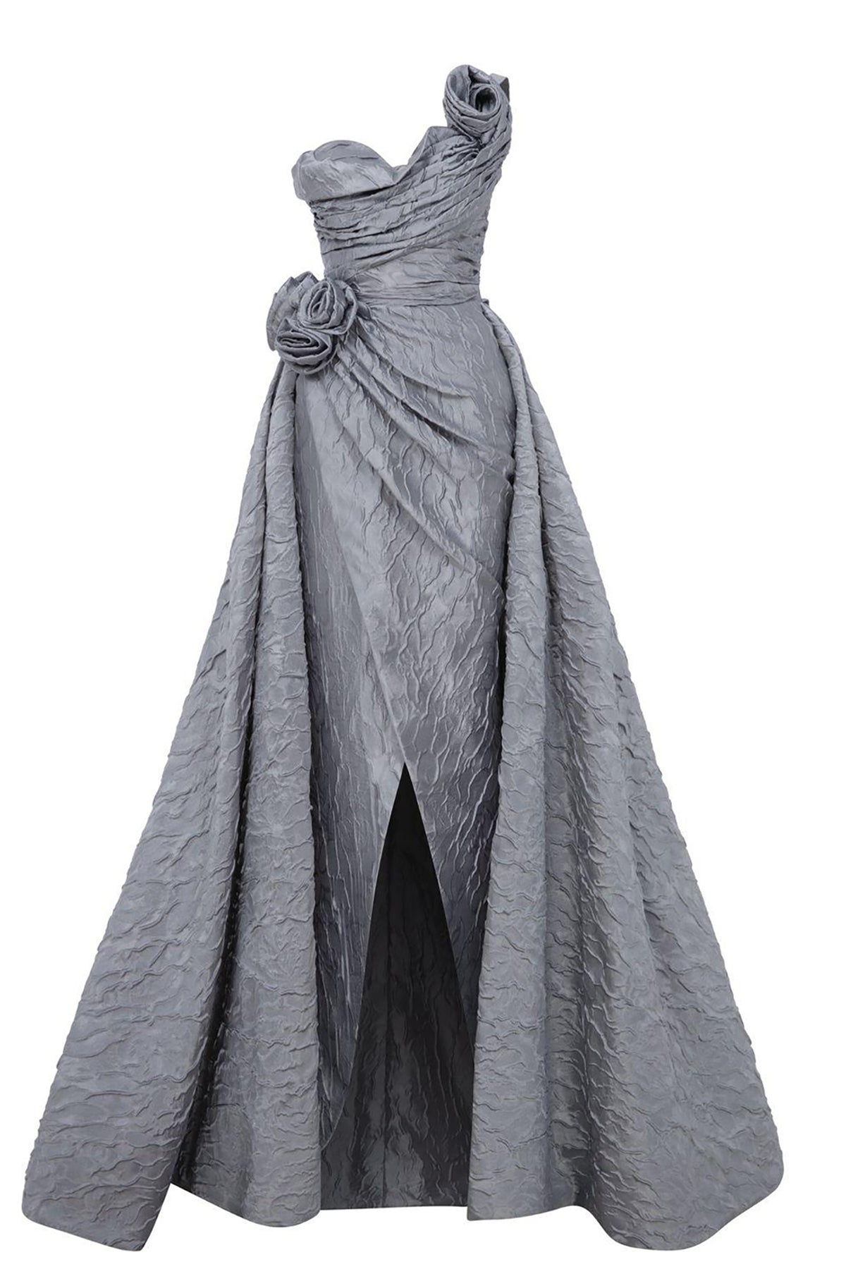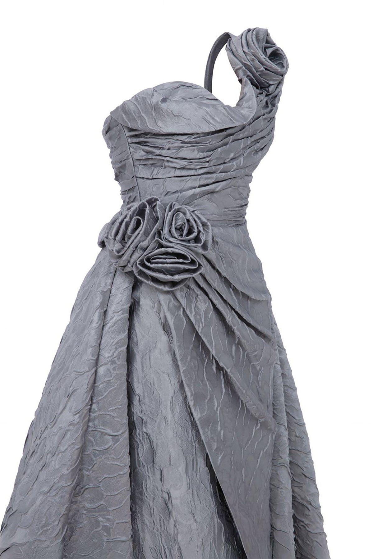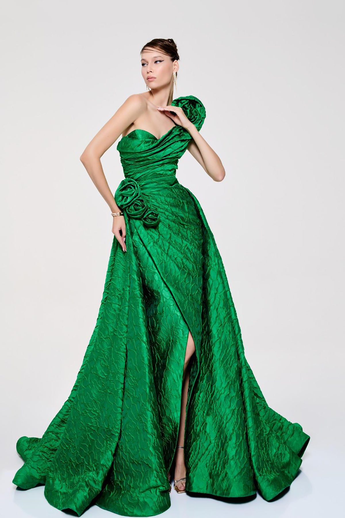 Green A-line long dress. Featuring a one-shoulder design with a single oversized floral accent positioned at the strap. Complemented with a skirt that opens into a high, thigh-length slit on one side.