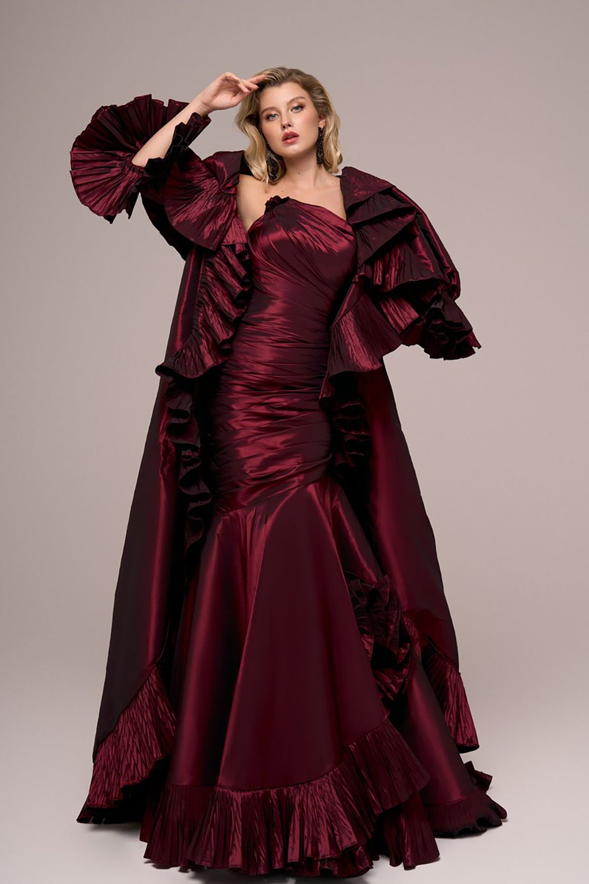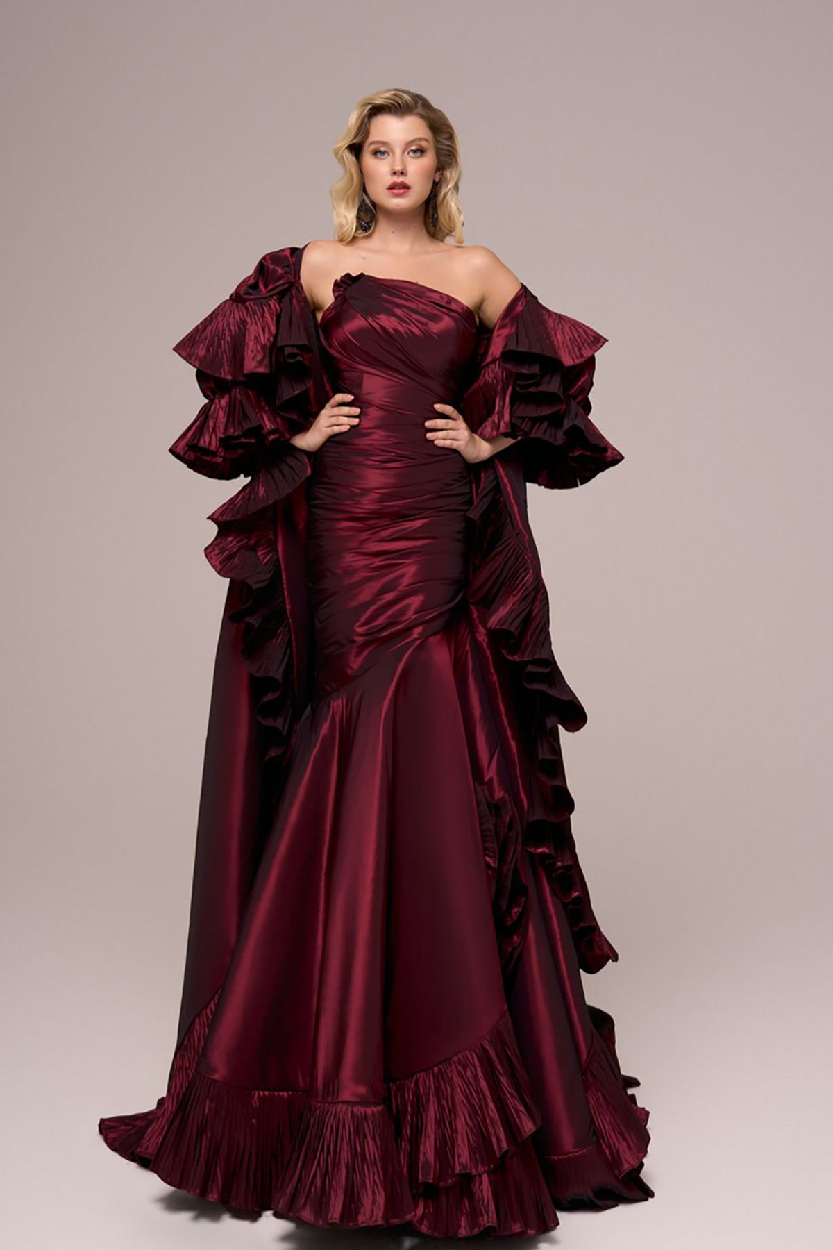 Burgundy-red long dress. Featuring a satin fitted mermaid silhouette with ruffles and a cape-like. Complemented with an off-the-shoulder neckline.