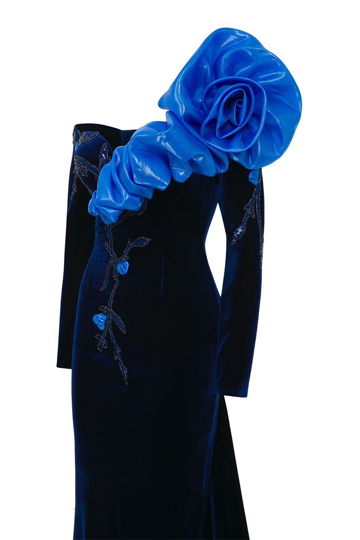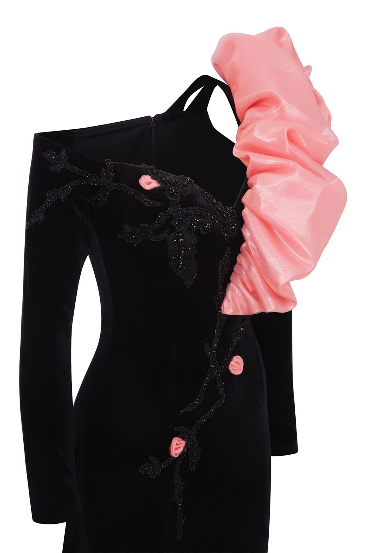 Black and pink long dress. Featuring a fitted bodice that hugs the torso through the waist and hips with a mermaid-style flare that pools into a subtle train behind. Complemented with an off-the-shoulder sweetheart that elegantly frames the collarbone and shoulders.